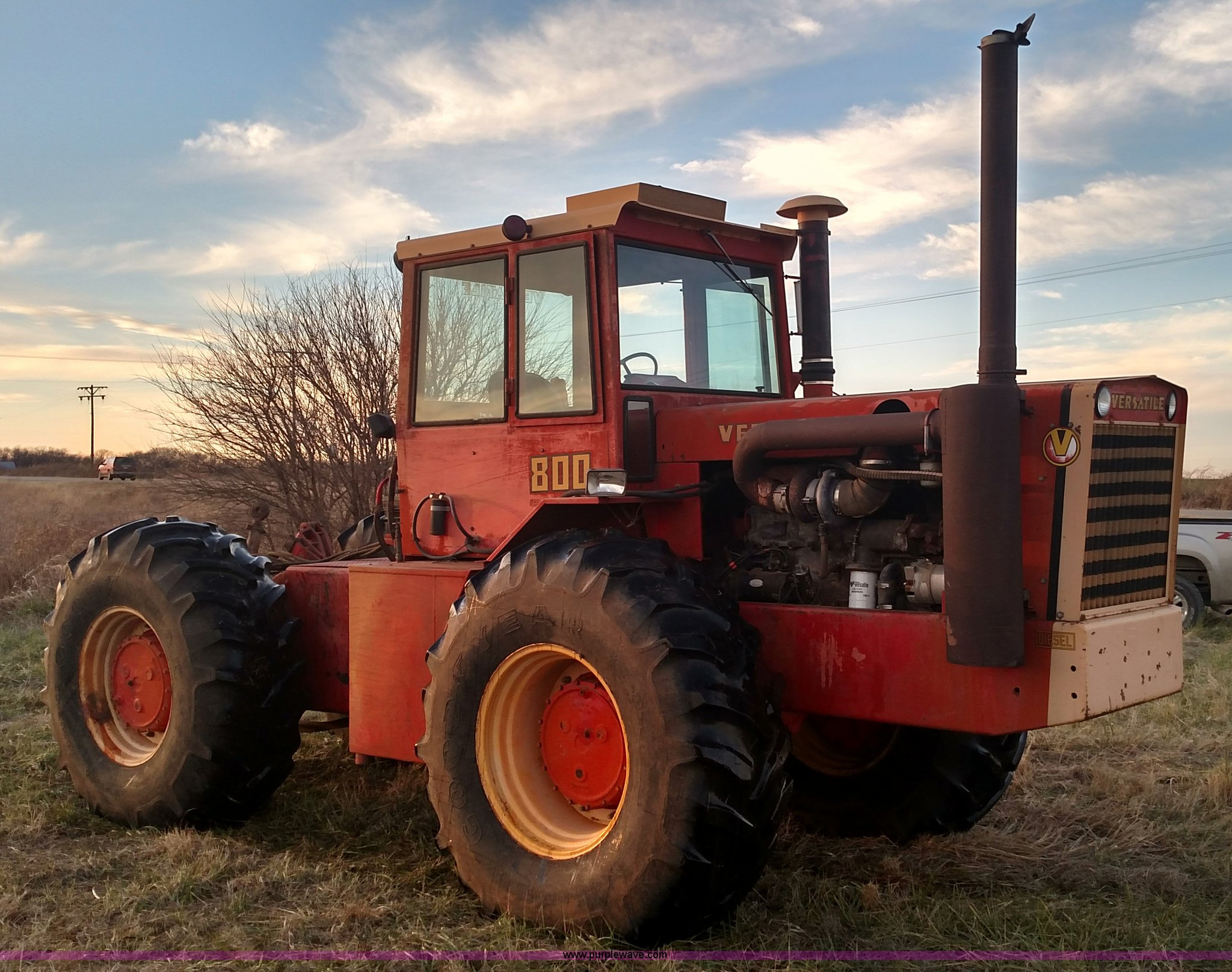 1975 Versatile 800 4WD tractor. 5,357 hours on meter Actual hours unknown, Cummins 855 turbo diesel engine, 12F-4R gears, AC and heat Unknown operating condition of AC, Spring suspension seat, Three point Top link, Draw bar, (3) rear hydraulic remotes, 24.5-32 tires, Serial 8003031003. View equipment video. Udall, KS 67146