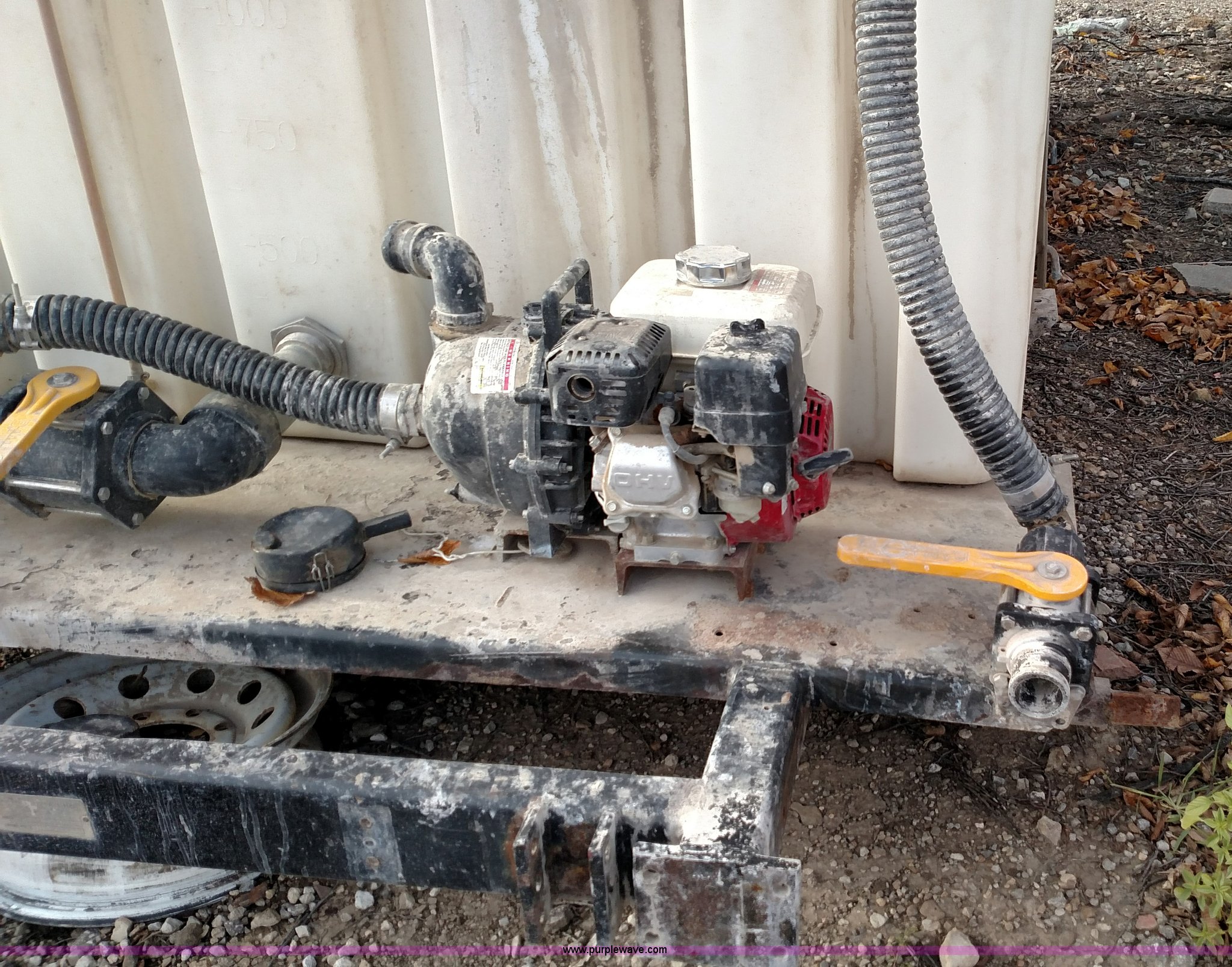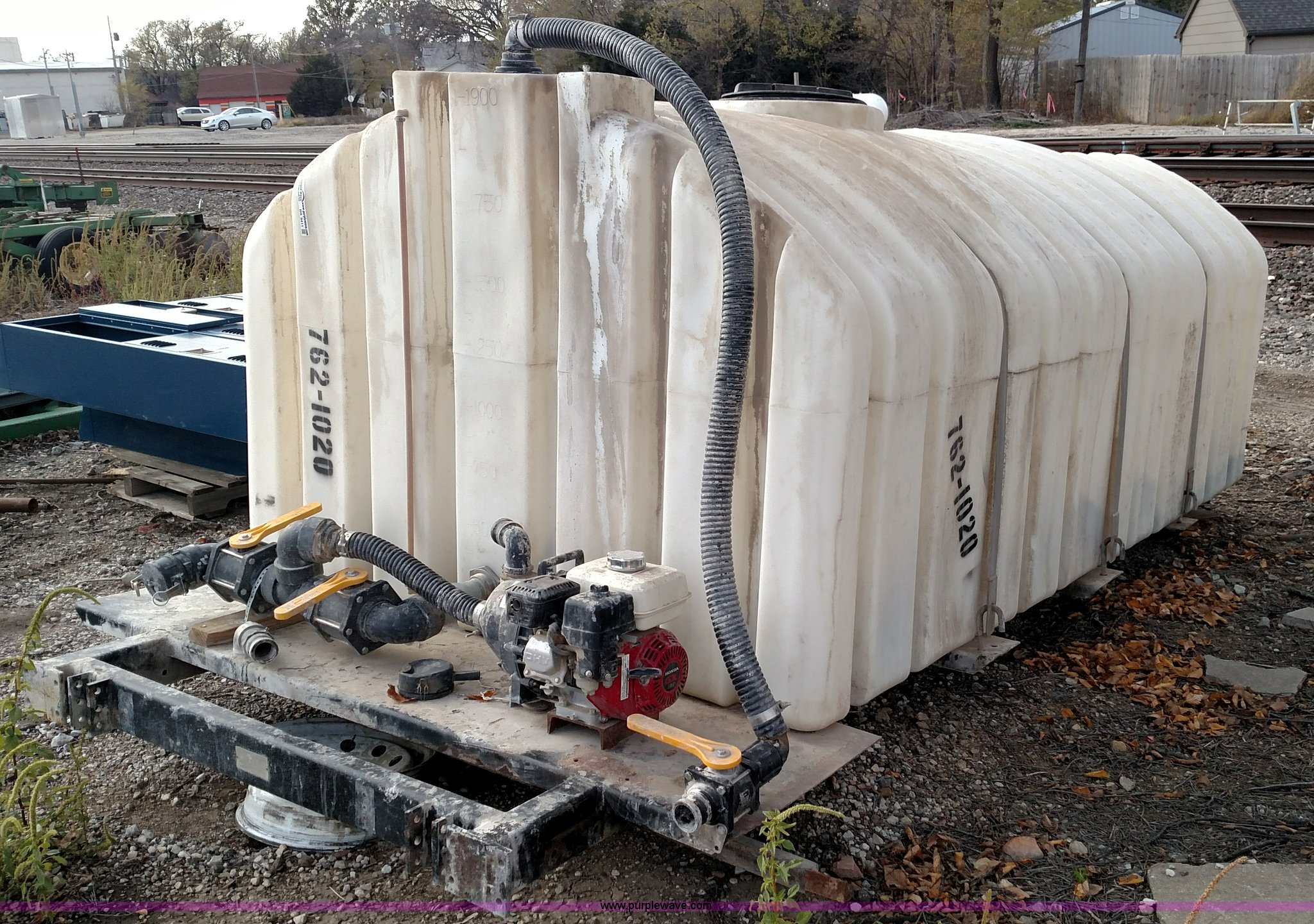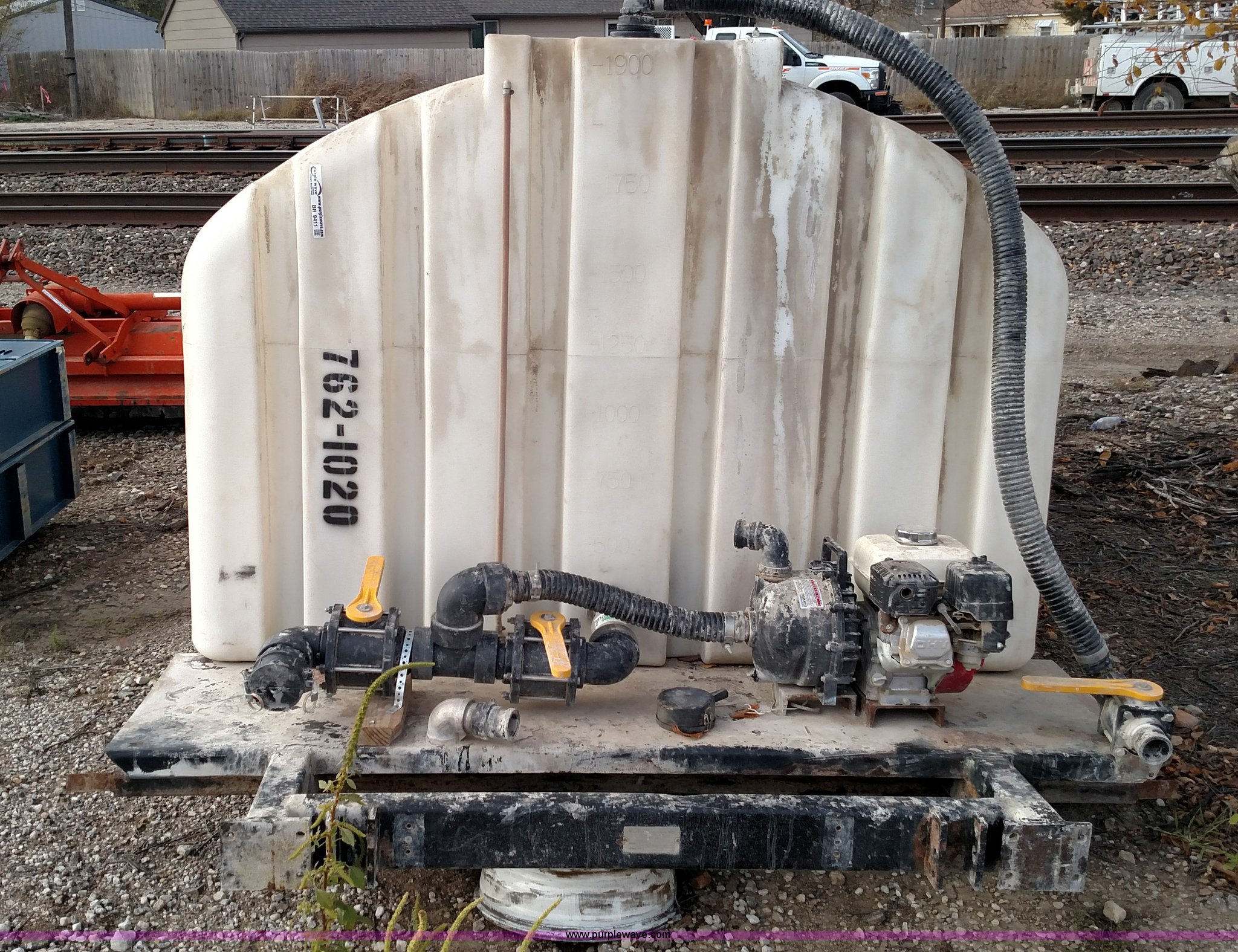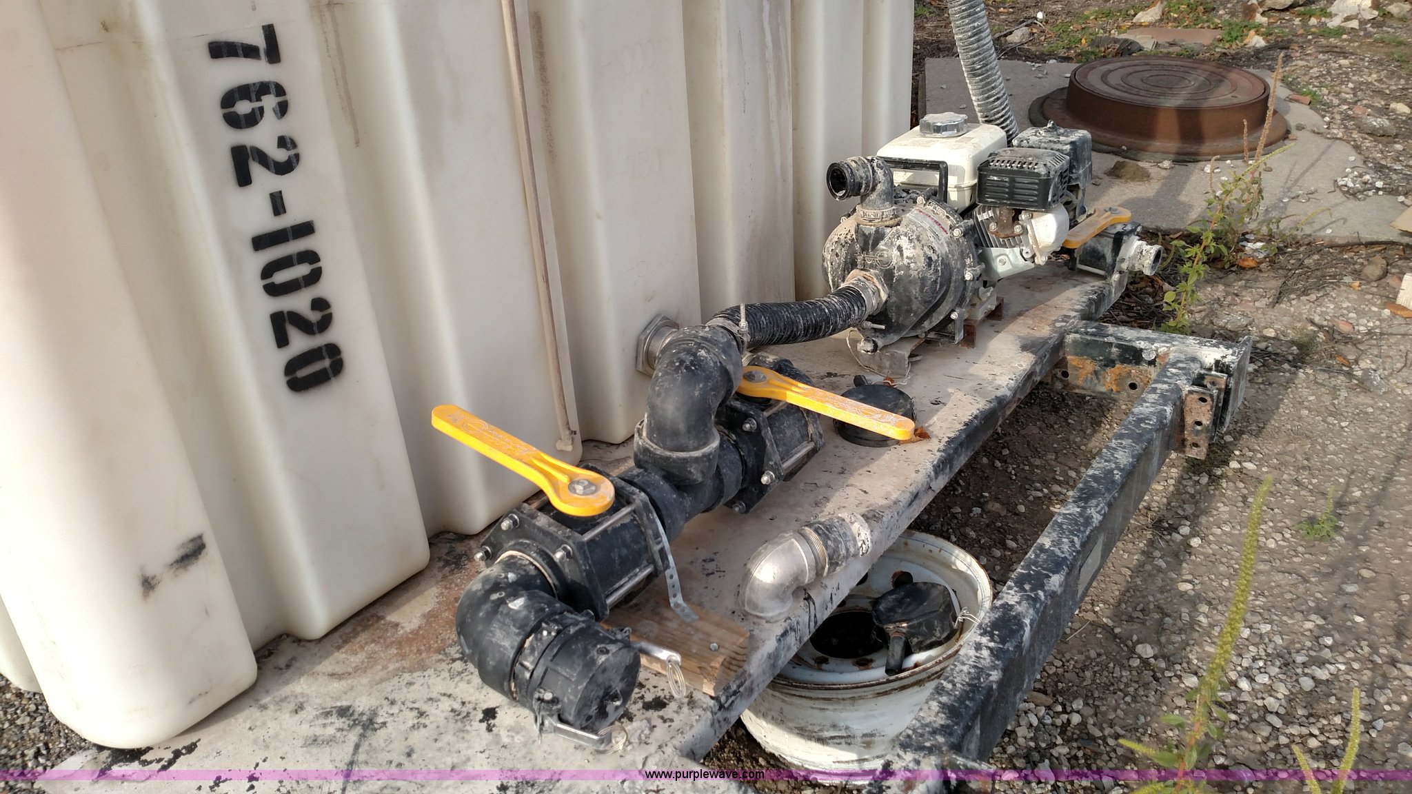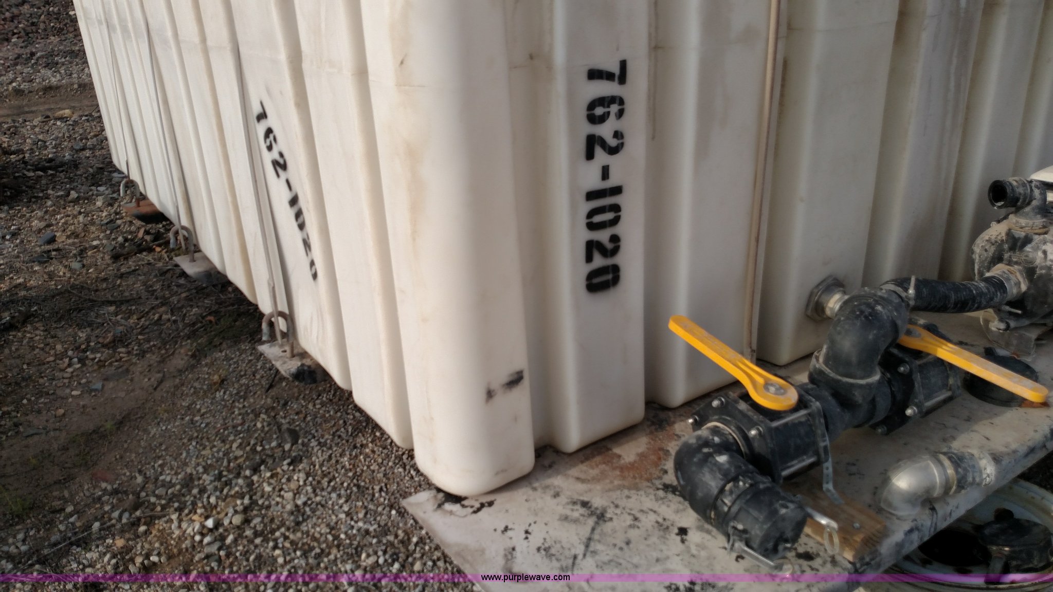 Purple Wave is selling a used Tanks in Kansas. This item is a Varitech Industries DS-9 skid mounted tank with the following: Honda GX160 gas engine, 2" pump, 2" and 4" plumbing, 1,900 gallon capacity, 12.5'L x 80"W, Serial 10106