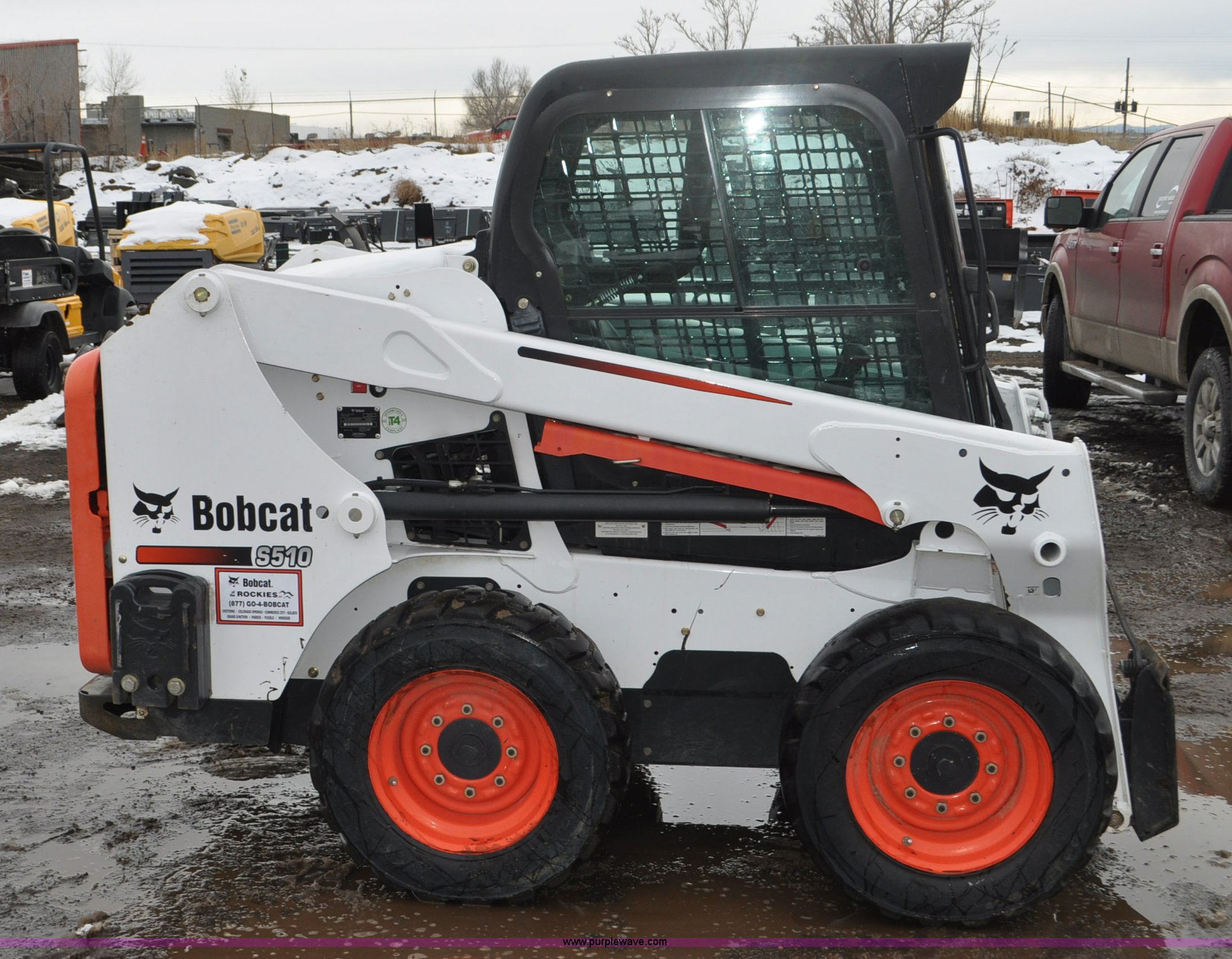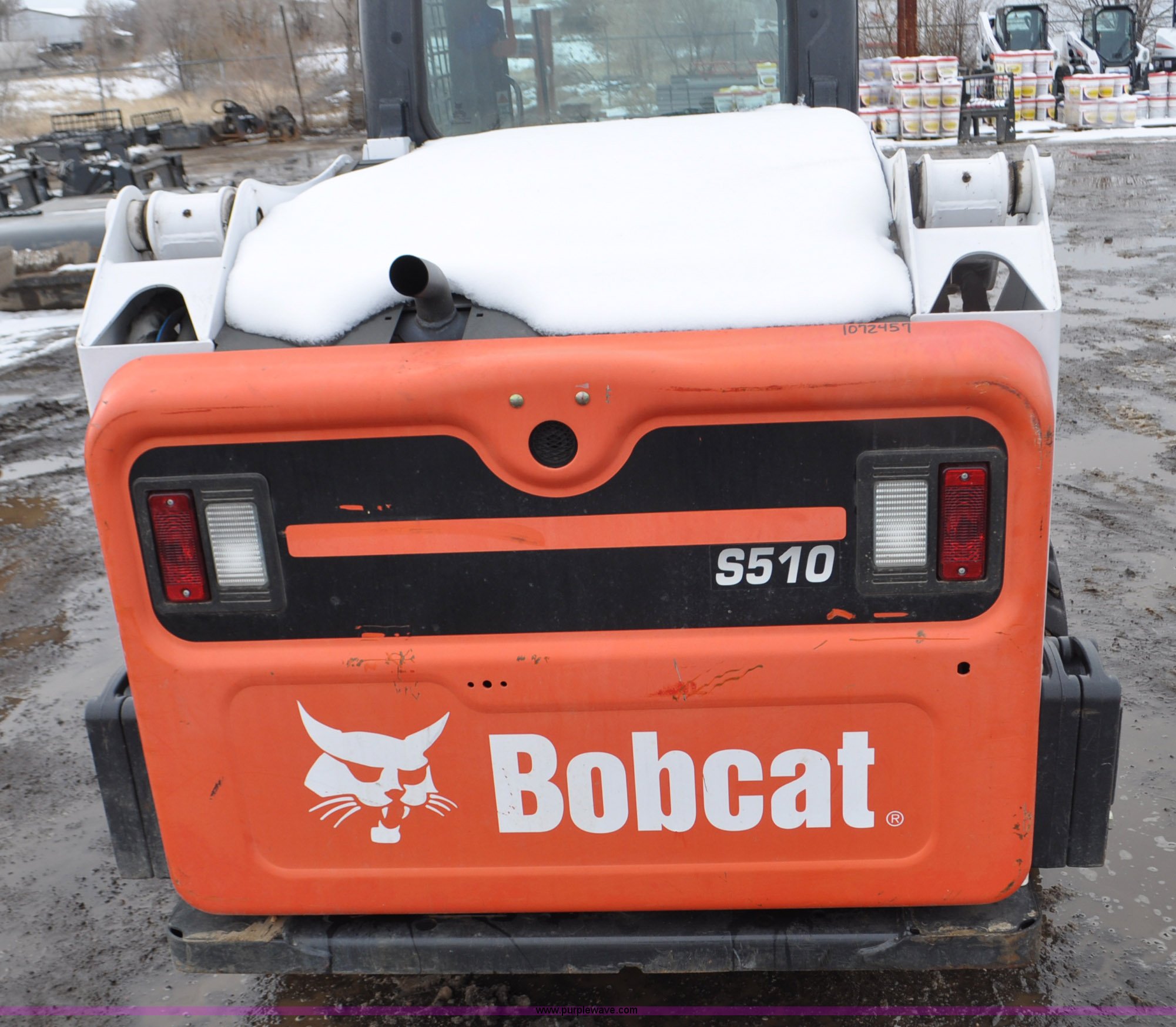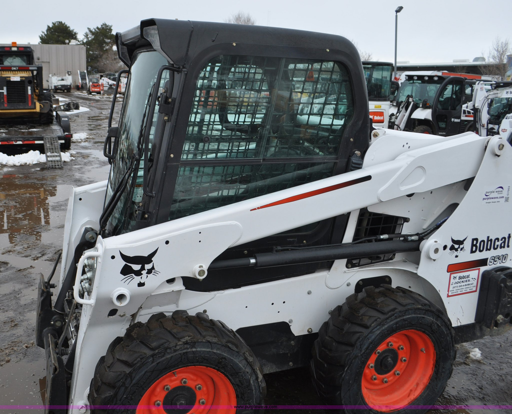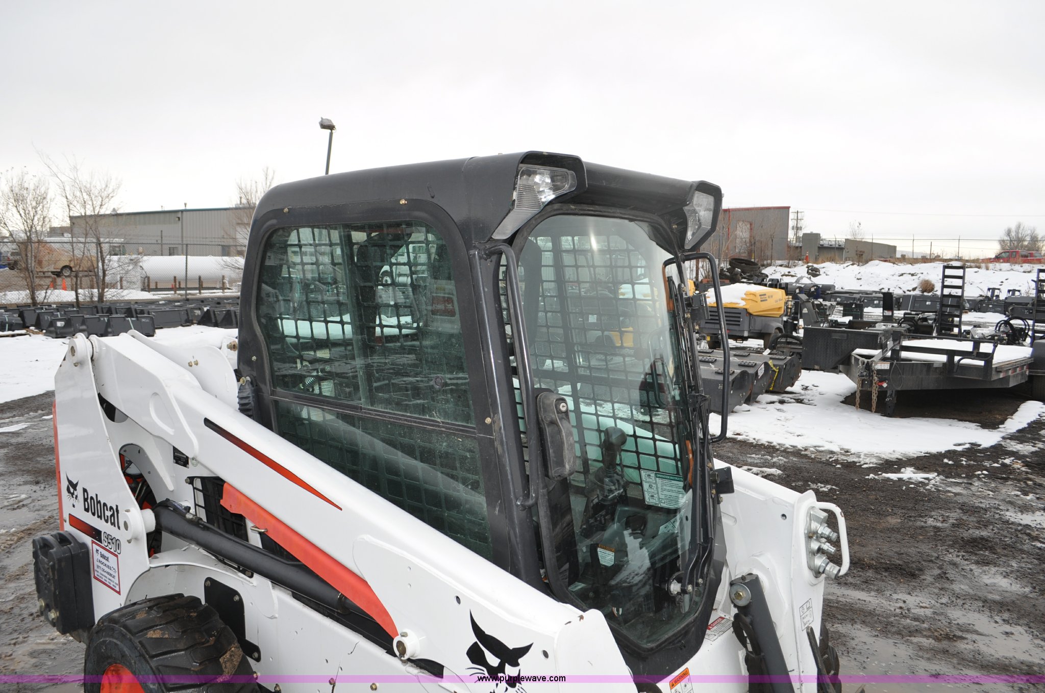 Purple Wave is selling a used Skid Steer Loader in Colorado. This item is a 2013 Bobcat S510 skid steer with the following: 558 hours on meter, Kubota 2.4L four cylinder turbo diesel engine, Hydrostatic transmission, Enclosed cab, Heat, Hand and foot controls, Spring suspension seat, Wipers, Front and rear work lights, Manual quick coupler, Auxiliary hydraulics, Counter weights, Bobcat 10-16.5 tires, Serial A3NJ11553, Unit# 1072457