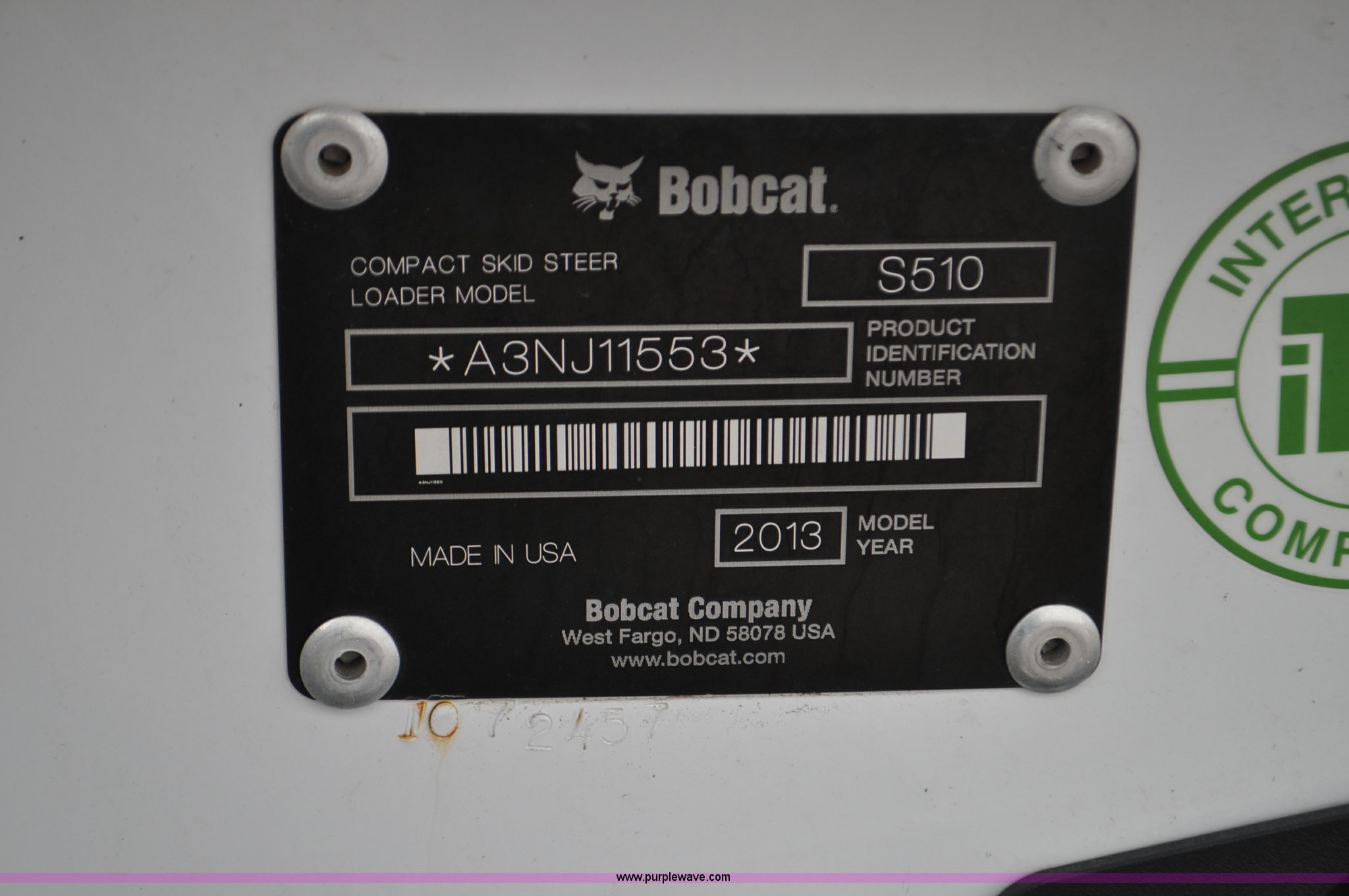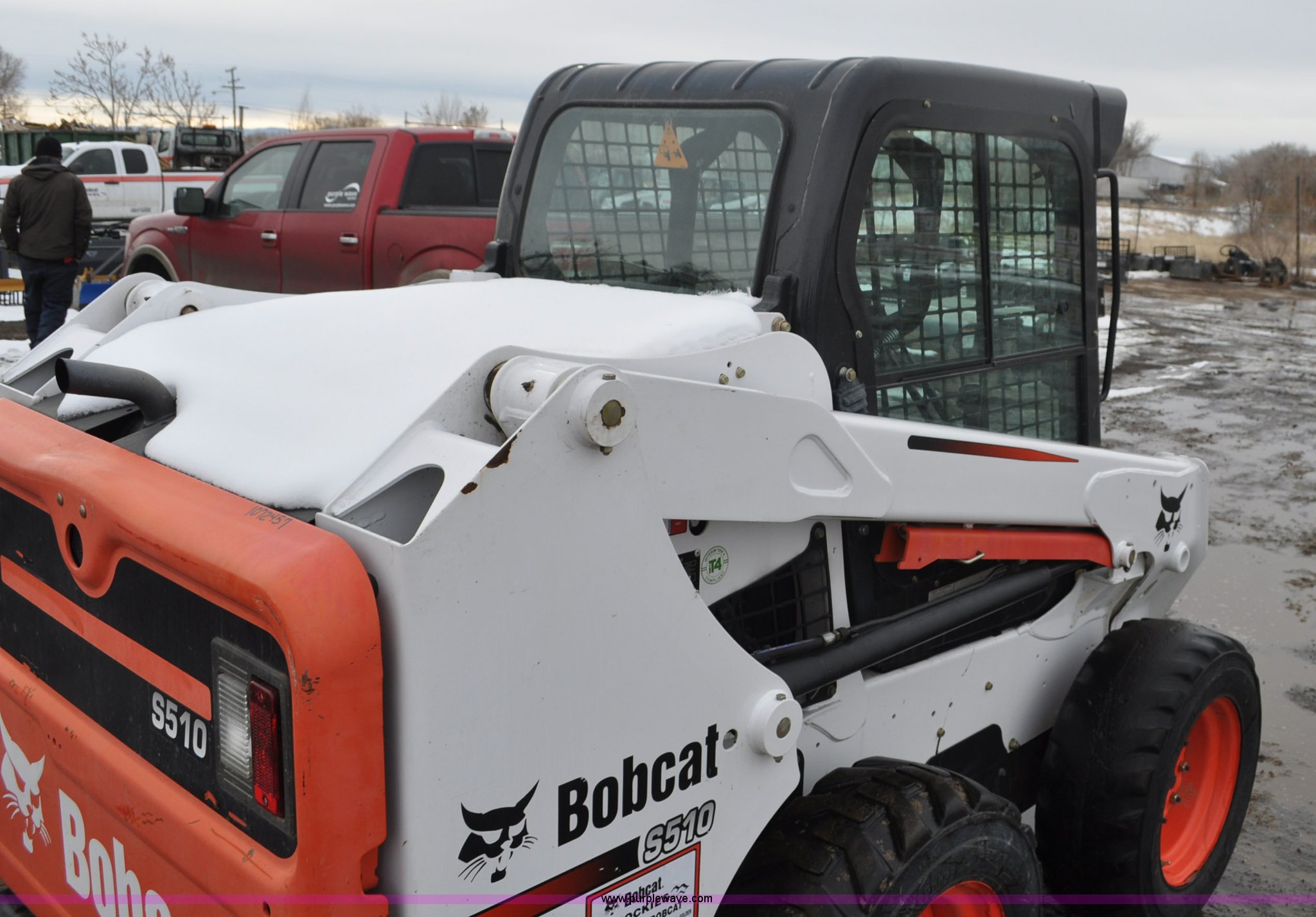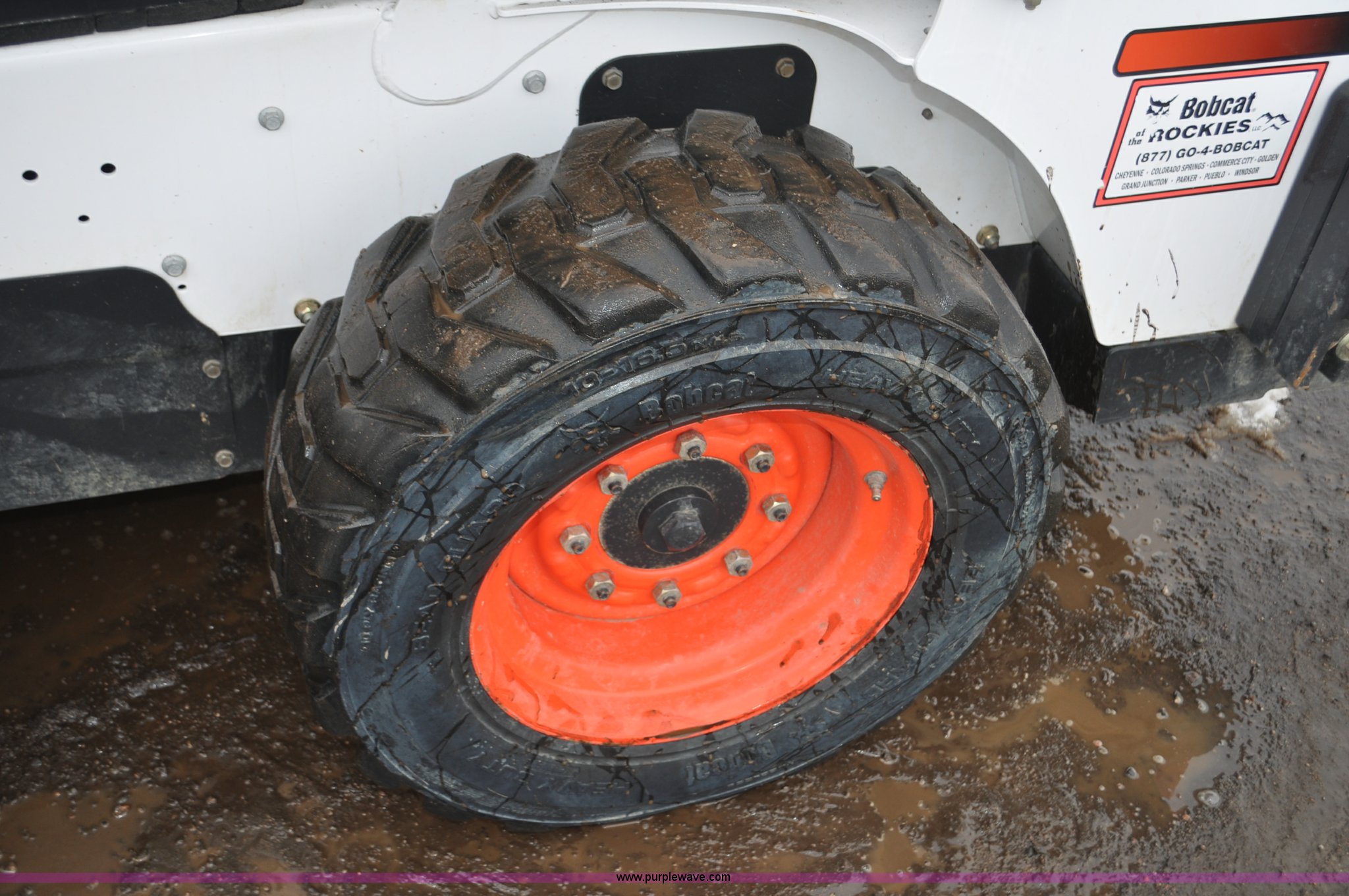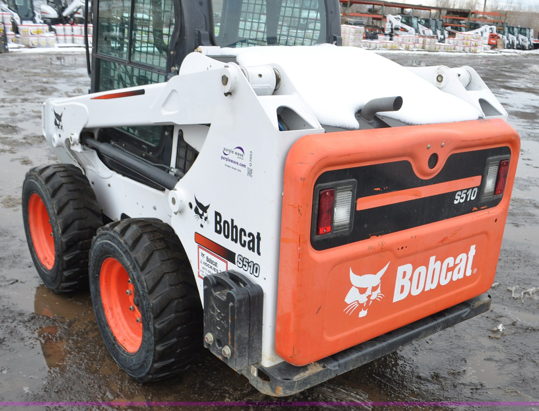 Purple Wave is selling a used Skid Steer Loader in Colorado. This item is a 2013 Bobcat S510 skid steer with the following: 558 hours on meter, Kubota 2.4L four cylinder turbo diesel engine, Hydrostatic transmission, Enclosed cab, Heat, Hand and foot controls, Spring suspension seat, Wipers, Front and rear work lights, Manual quick coupler, Auxiliary hydraulics, Counter weights, Bobcat 10-16.5 tires, Serial A3NJ11553, Unit# 1072457