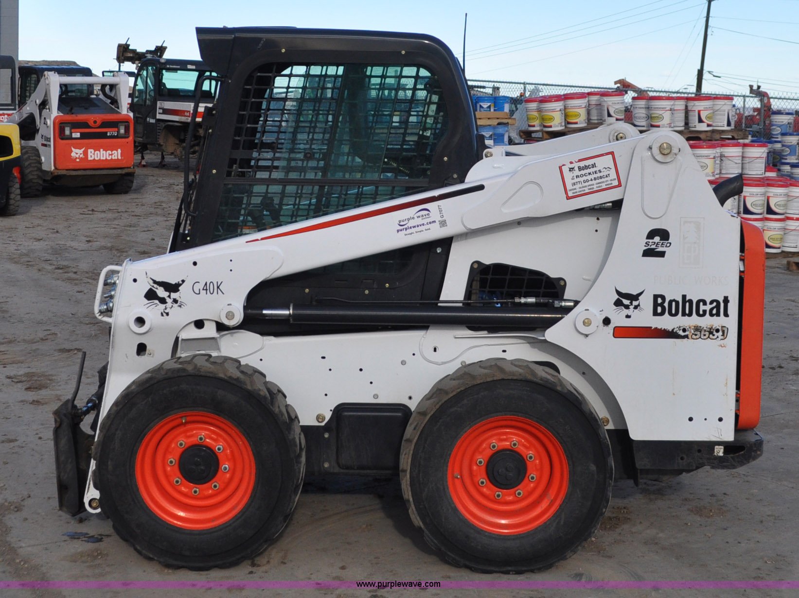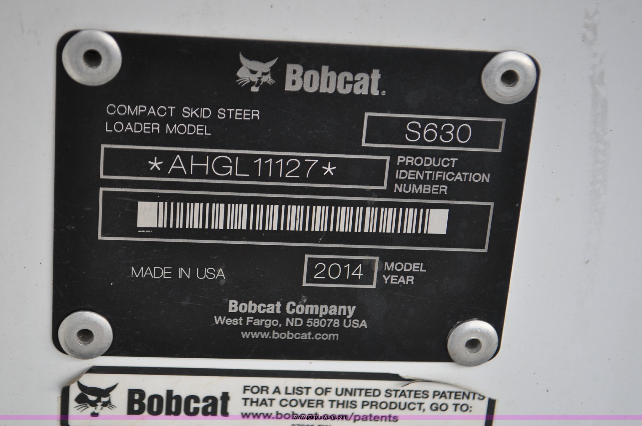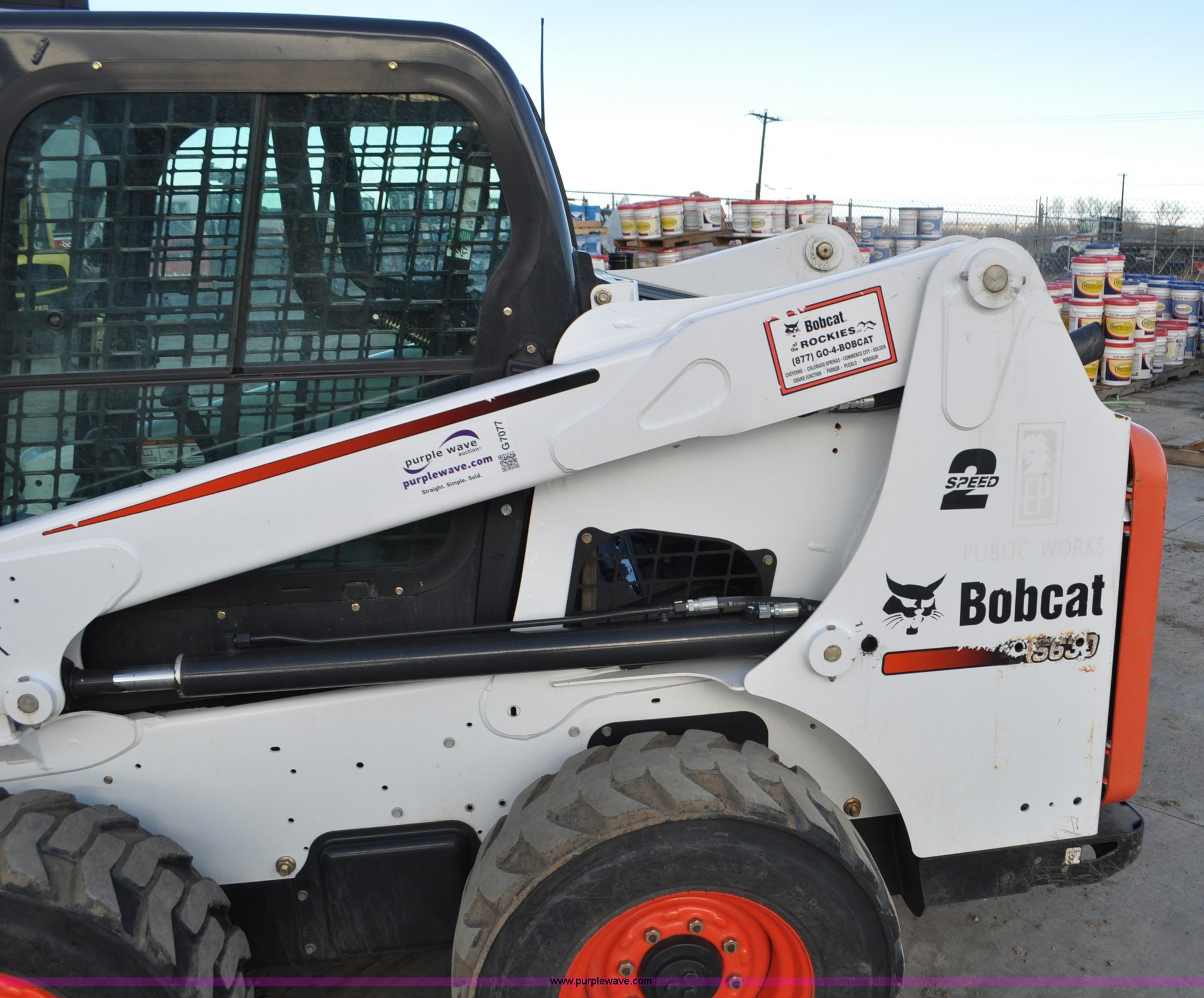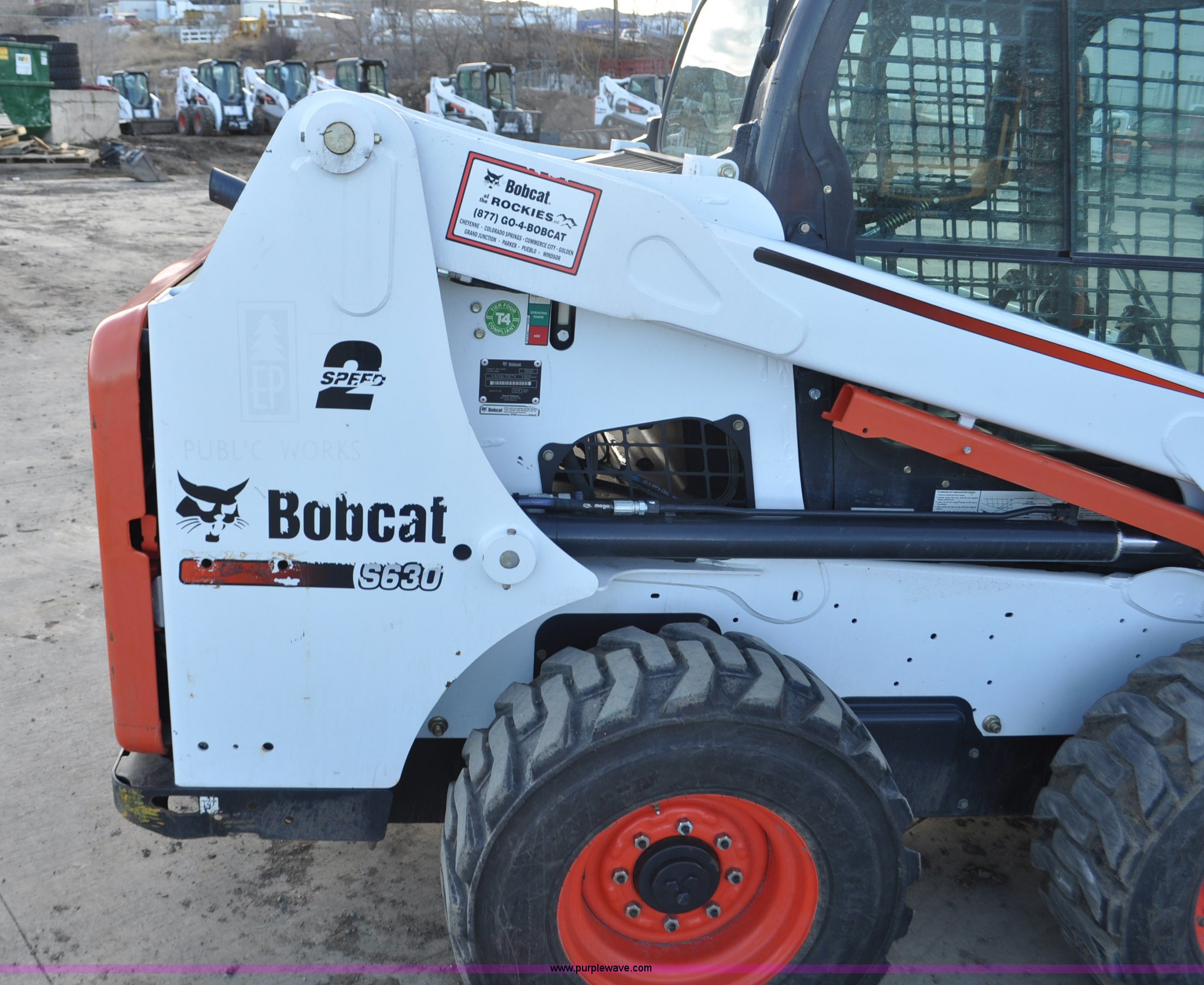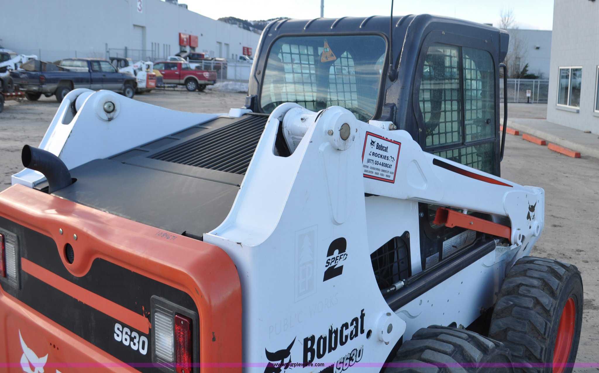 Purple Wave is selling a used Skid Steer Loader in Colorado. This item is a 2014 Bobcat S630 skid steer with the following: 436 hours on meter, Bobcat D24NAP four cylinder turbo diesel engine, Two speed hydrostatic transmission, Enclosed cab, Heat, AM/FM, Hand and foot controls, Spring suspension seat, Wipers, Front and rear work lights, Power Bobtach coupler, High Flow auxiliary hydraulics, Auxiliary electrical outlet, Bobcat 12-16.5 tires, Serial AHGL11127