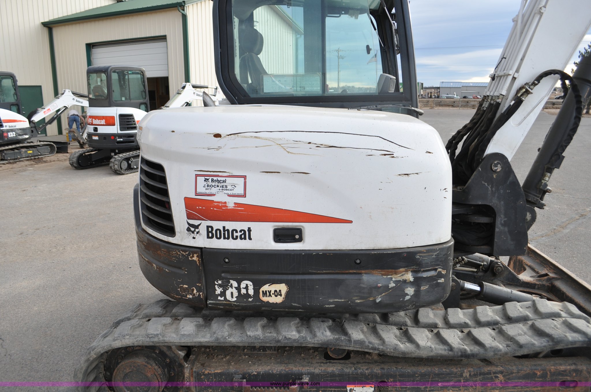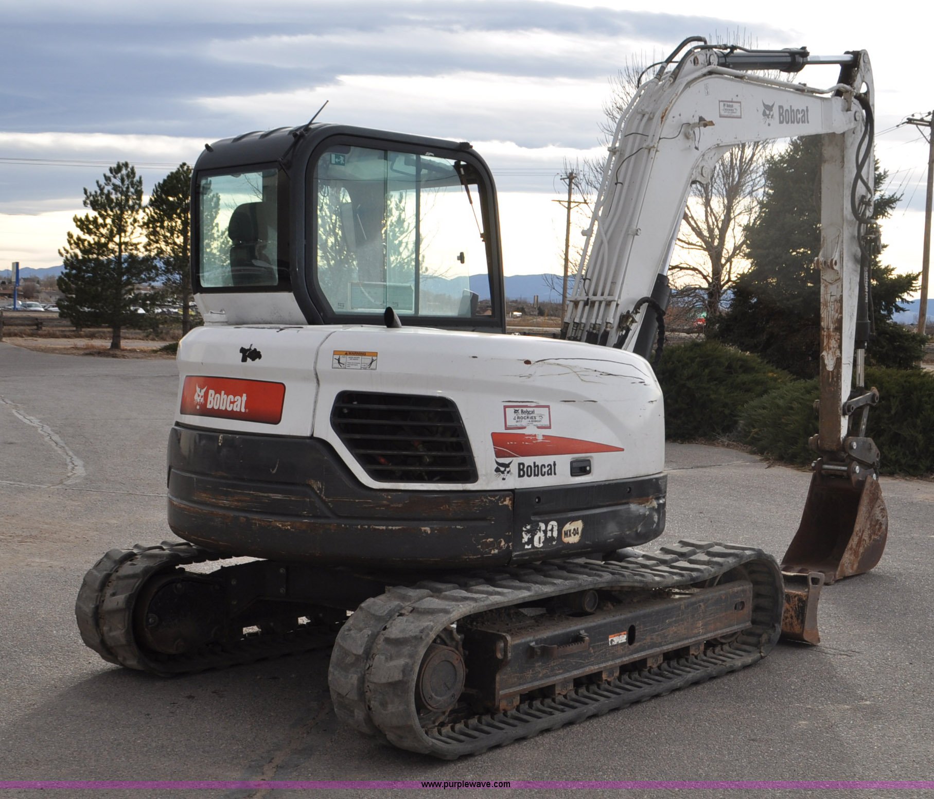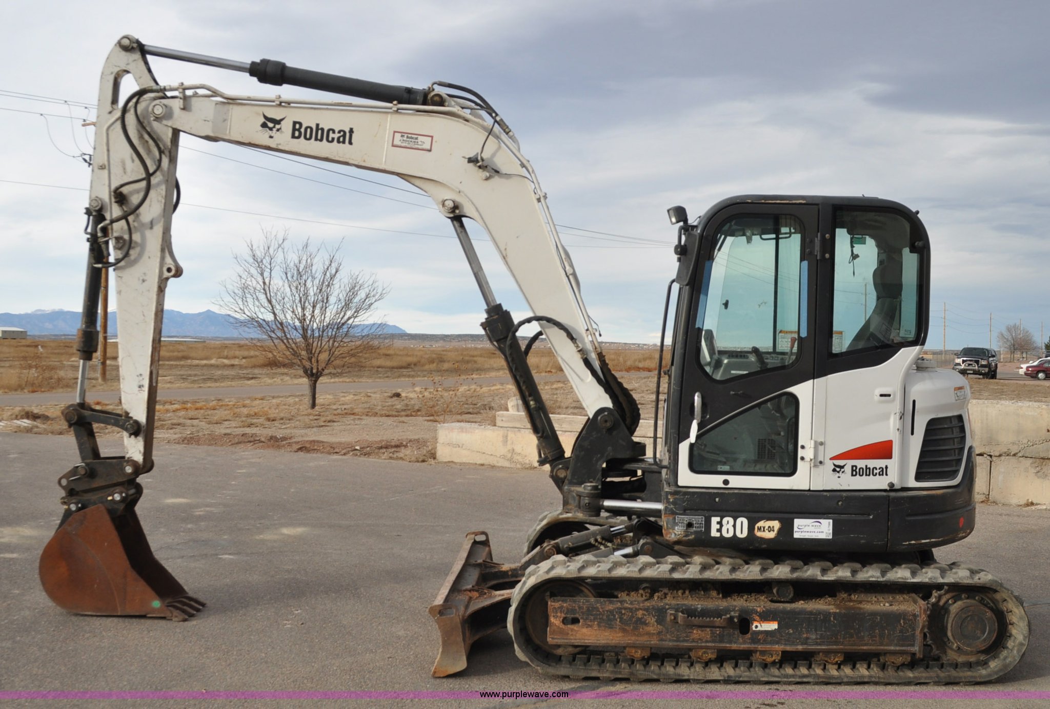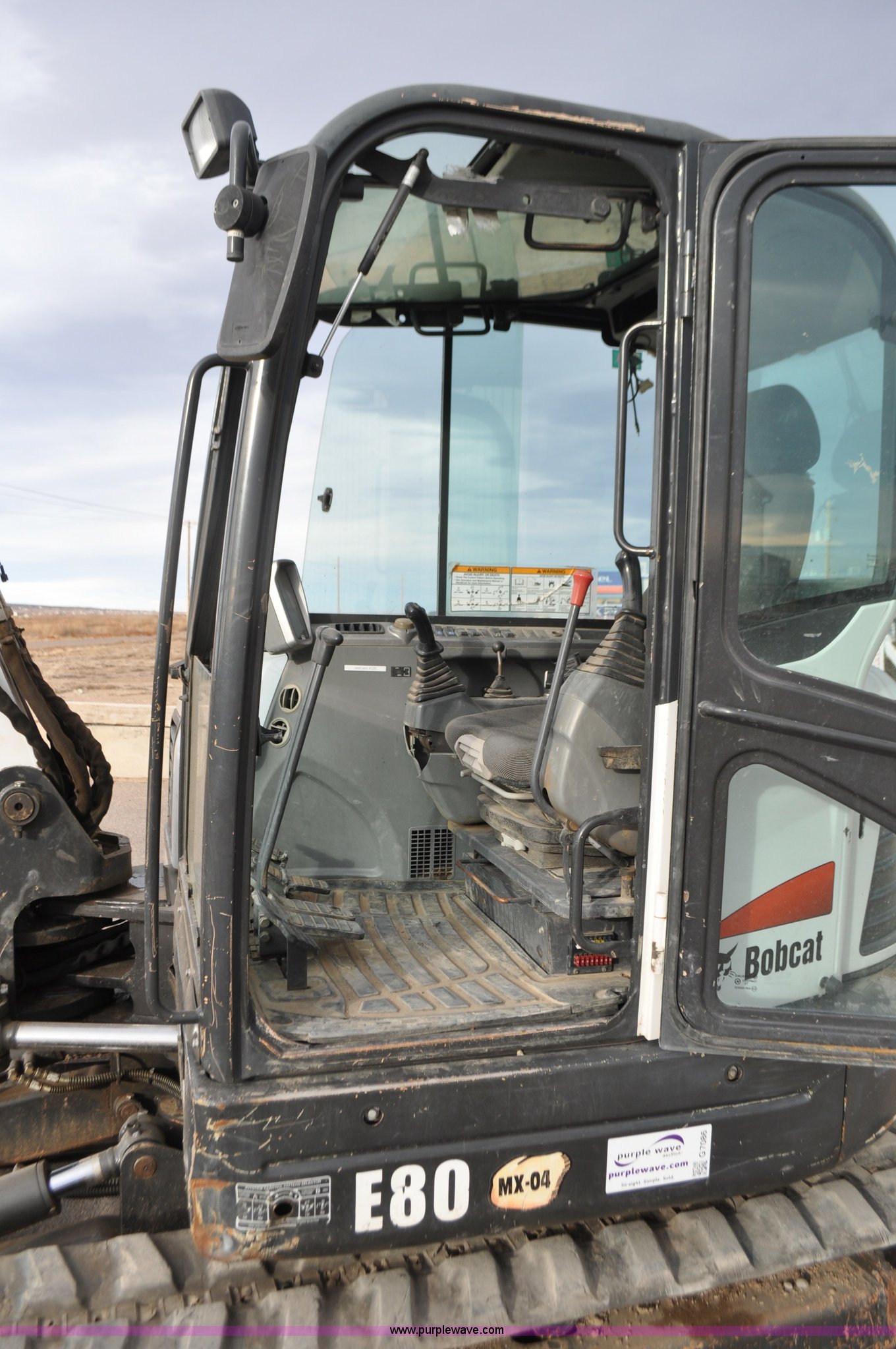 Purple Wave is selling a used Mini Excavator in Colorado. This item is a 2010 Bobcat E80 compact excavator with the following: 4,267 hours on meter, Yanmar 3.32L diesel engine, 57 HP, Hydrostatic transmission, EROPS, Heat, Suspension seat, Front work lights, Knuckle boom, 7'5" stick length, 18"W bucket, (4) bolt-on teeth, Mechanical quick coupler, Two way auxiliary hydraulics, 18"W rubber tracks, Serial AETB11224, Unit# 1029903