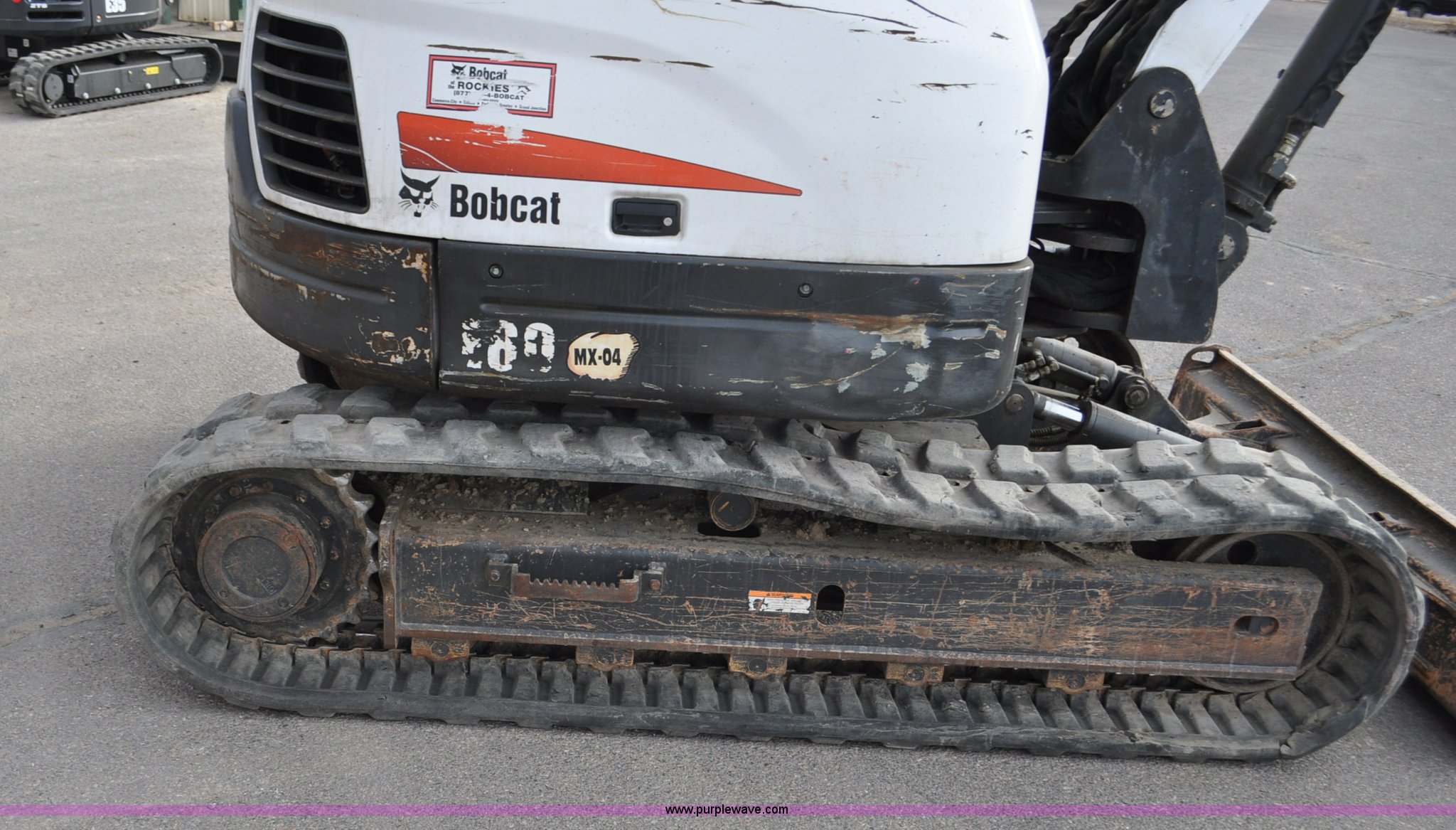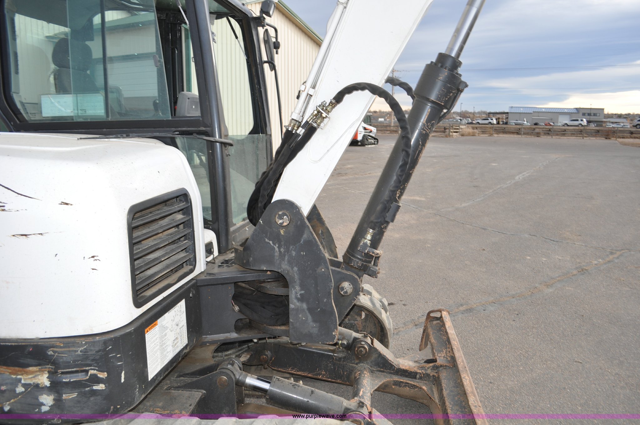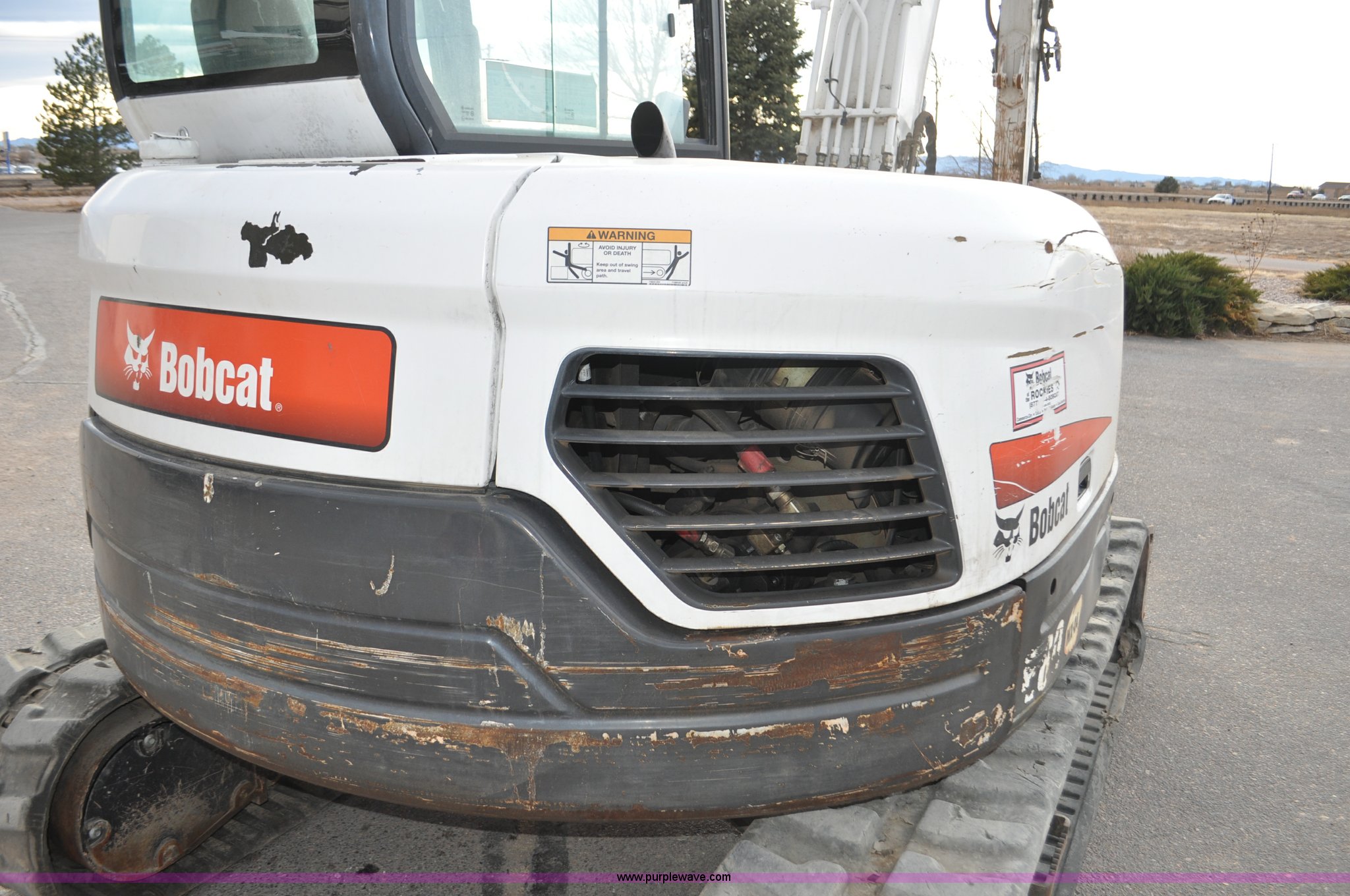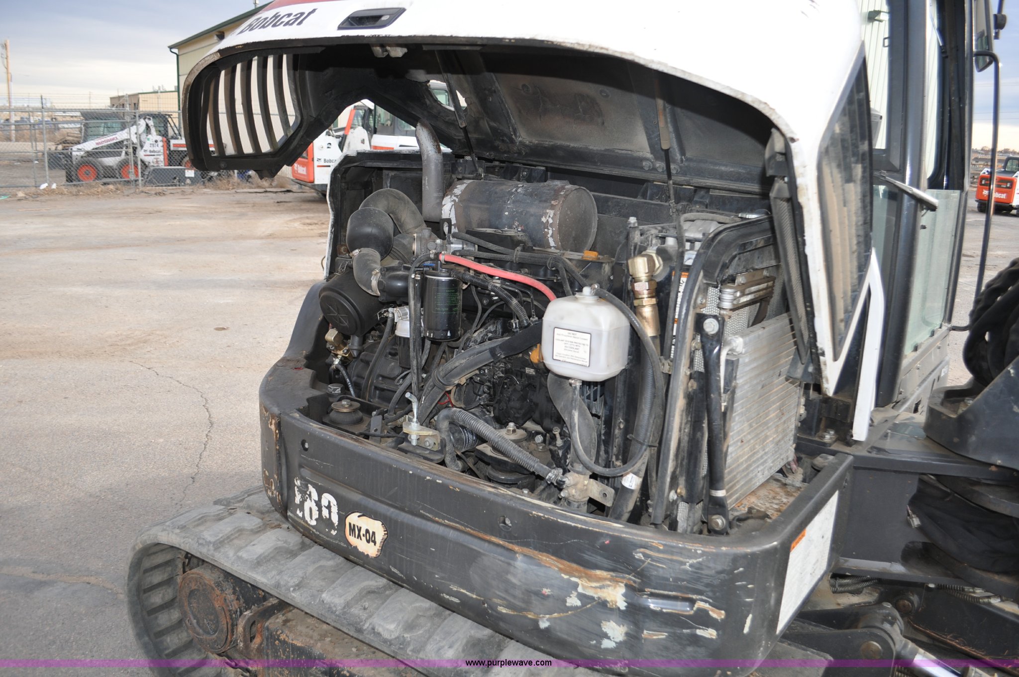 Purple Wave is selling a used Mini Excavator in Colorado. This item is a 2010 Bobcat E80 compact excavator with the following: 4,267 hours on meter, Yanmar 3.32L diesel engine, 57 HP, Hydrostatic transmission, EROPS, Heat, Suspension seat, Front work lights, Knuckle boom, 7'5" stick length, 18"W bucket, (4) bolt-on teeth, Mechanical quick coupler, Two way auxiliary hydraulics, 18"W rubber tracks, Serial AETB11224, Unit# 1029903
