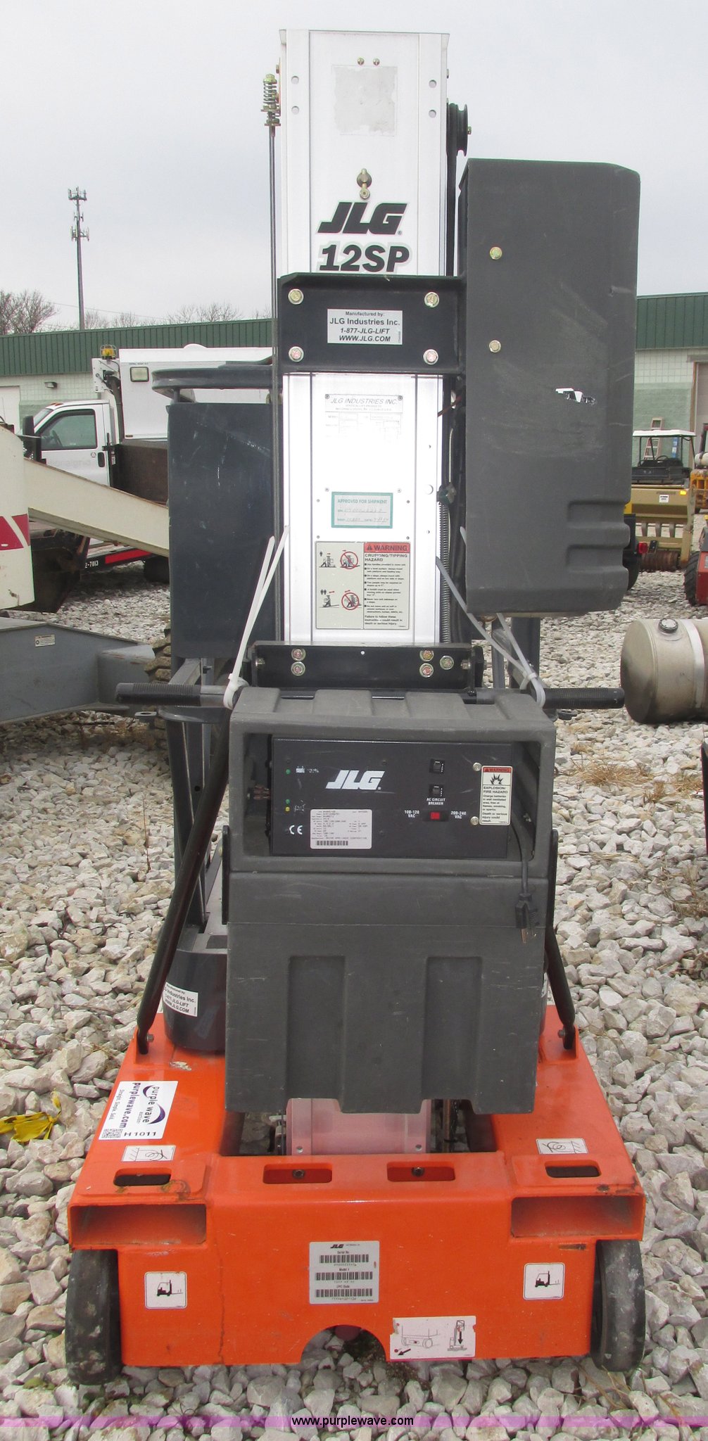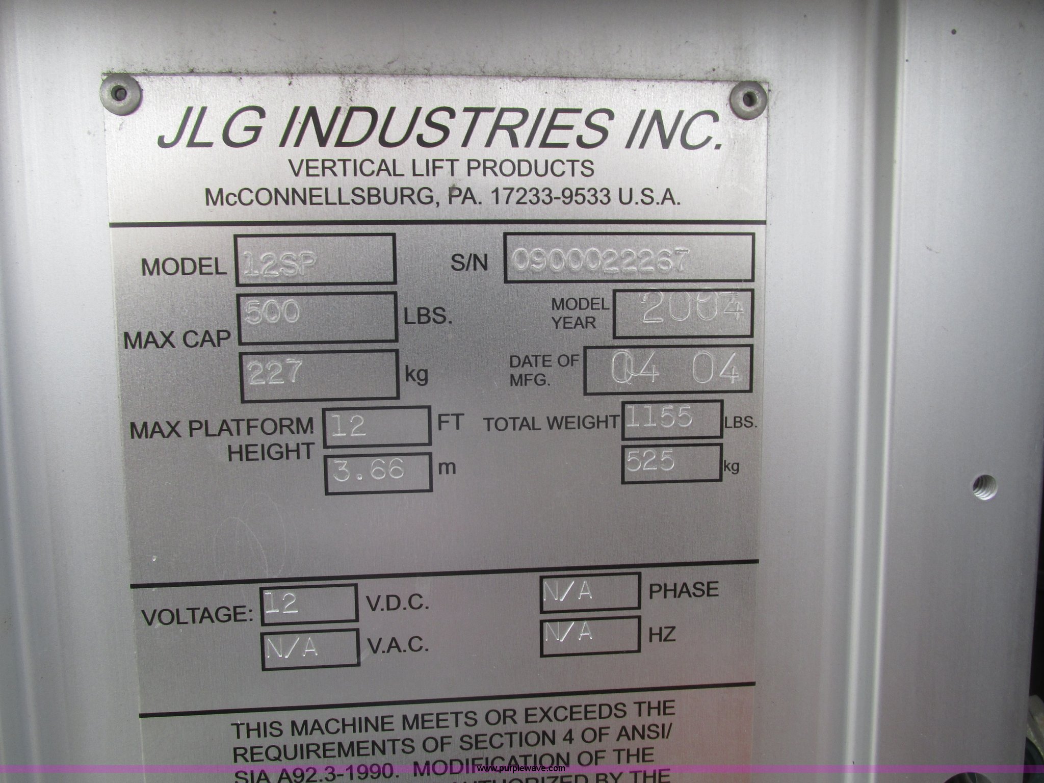 2004 JLG 12SP vertical lift. Electric operation, 500 lbs maximum lift capacity, 11'9" maximum lift height, 48" x 28" platform Platform controls, 43 3/4"H safety rail, Forklift pockets, Stabilizers, Manual emergency lowering valve, Approximately 73"L x 34"W x 78"H stowed height, 6 x 2 solid front tires, 10 x 2-1/2 solid rear tires, 1,155 lbs. base operating weight, Battery charger Model SCR122097B1, 110V, Serial 04045160, Removable battery pack, Operator manual, Safety manual, ANSI manual , Unused, Safety belt and lanyard included, Serial 0900022267. Jordan Machinery. 6905 N. 94th Plaza. Omaha, NE 68122
