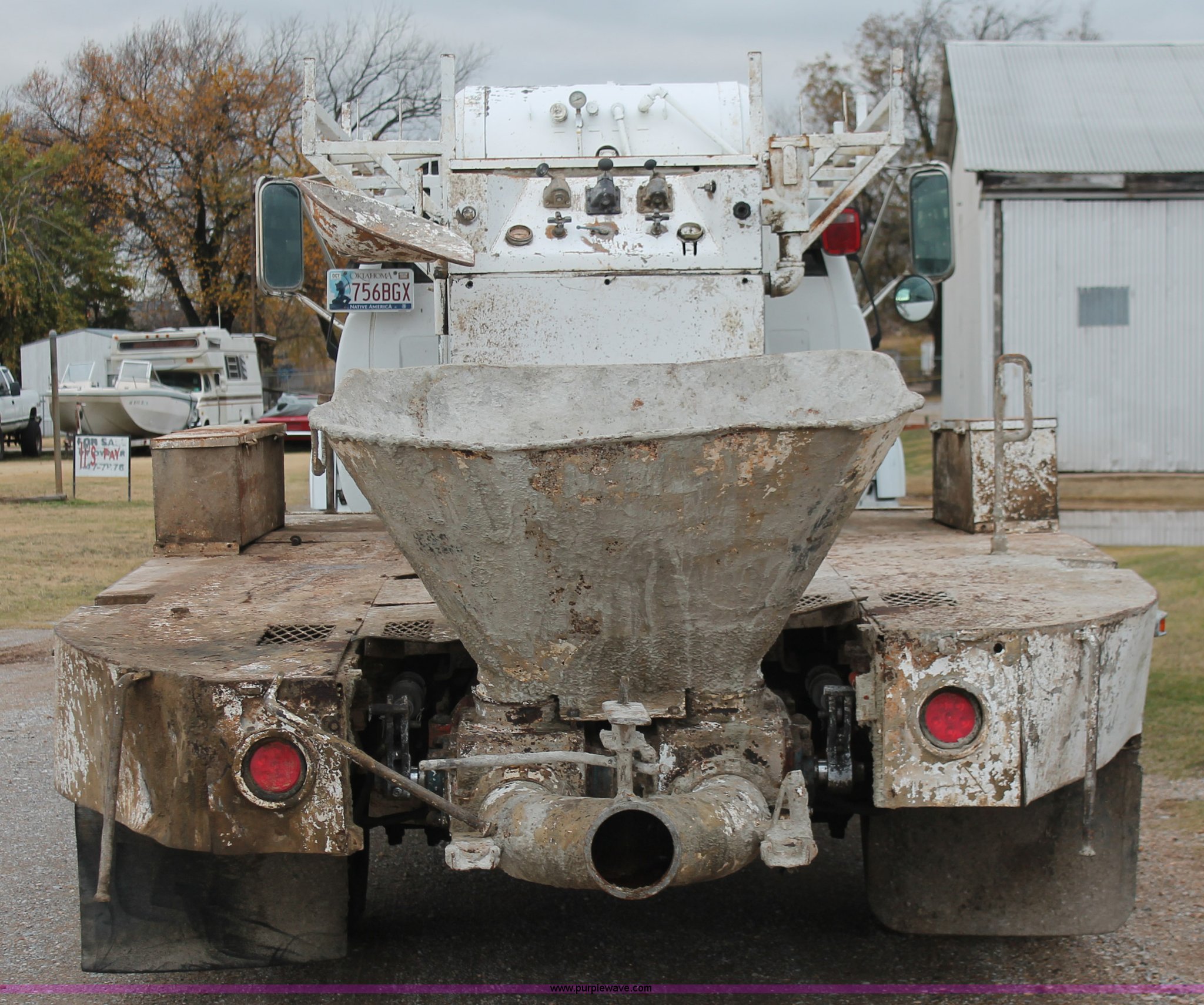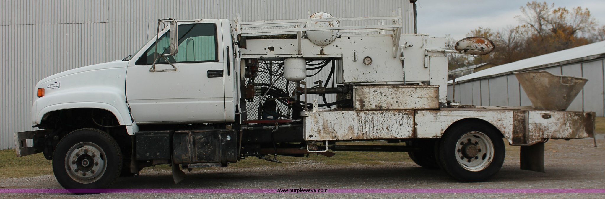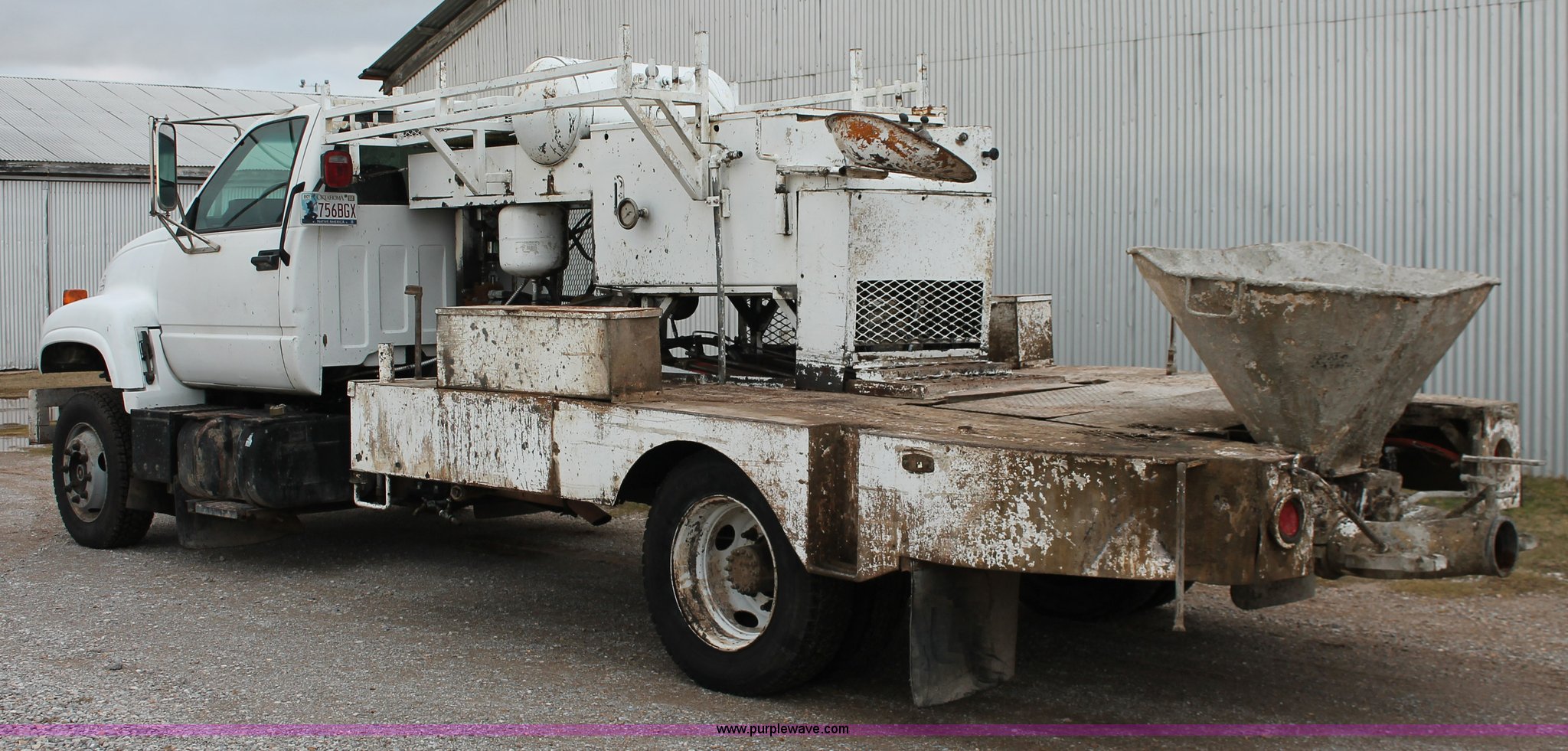 Purple Wave is selling a used Ready Mix or Pump Truck in Oklahoma. This item is a 2000 Chevrolet C6500 concrete pump truck with the following: 154,470 miles on odometer, Vortec 7400 7.4L V8 gas engine, Five speed manual transmission, Vinyl interior, Front tow hooks, PTO, Concrete pumper bed, 16'L, Dual ram, 48"W hopper, 6" diameter outlet plumbing, Toolbox, Dual fuel tanks, Spring suspension, Hydraulic brakes, 192" wheelbase, 245/70R19.5 tires