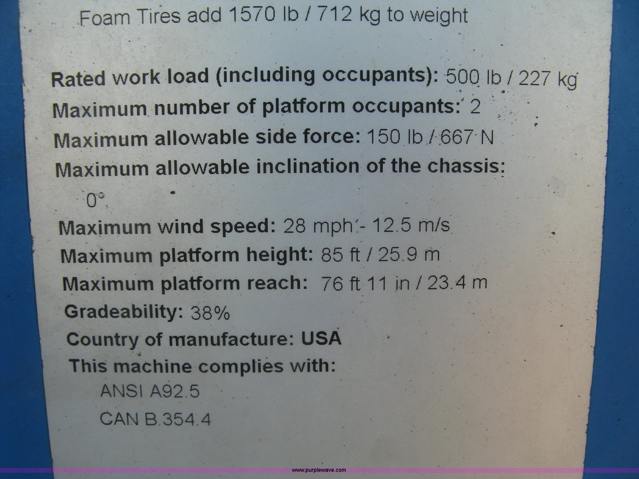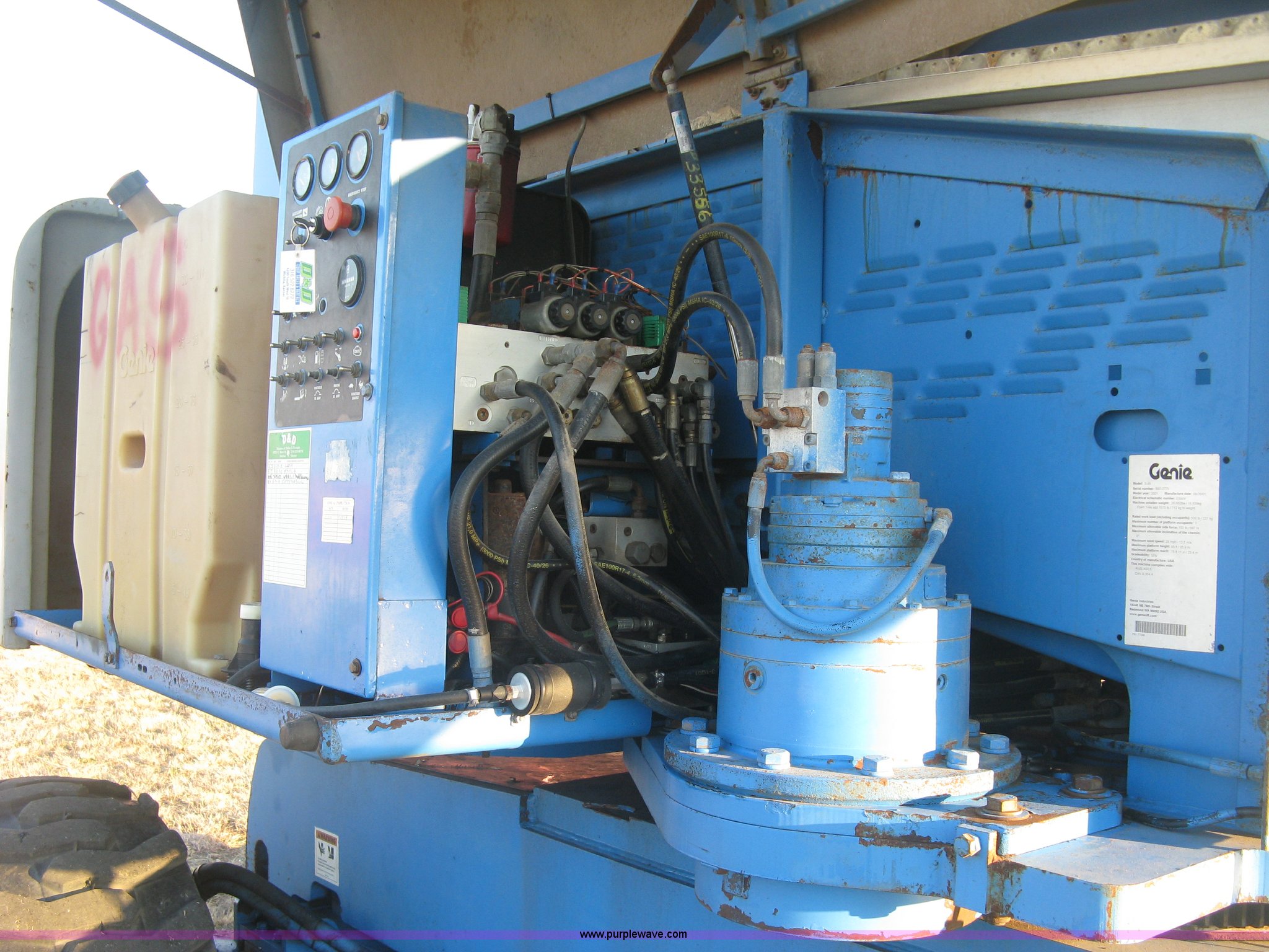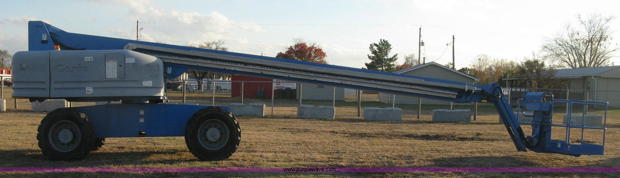 Purple Wave is selling a used Boom Lift in Kansas. This item is a 2001 Genie S85 boom lift with the following: 5,479 hours on meter, Ford four cylinder dual fuel engine, Gas and propane capable, Four wheel drive, 500 lbs maximum lift capacity, 76.11' maximum reach, 85' maximum lift height, 94"L x 34"W platform, Two person capacity, AC power outlet, Platform rotation, Powered jib extension, Hydraulic extending outrigger augers, (2) hydraulic jack posts, Ground outrigger controls, 385/65-22.5 NHS tires, 35,860 lbs. base operating weight, Serial 580-2775