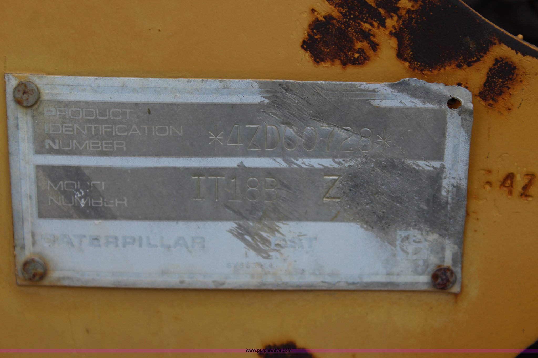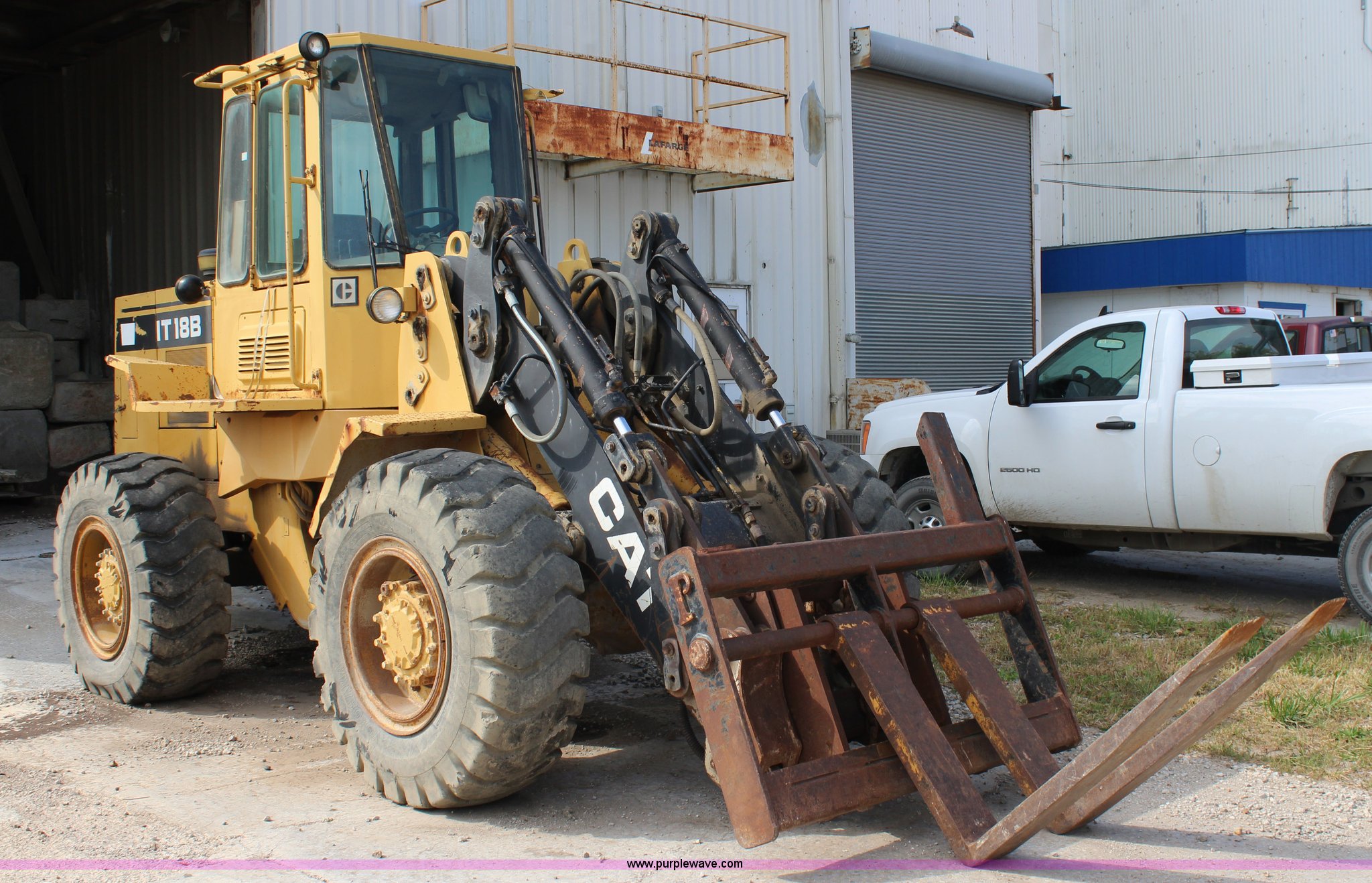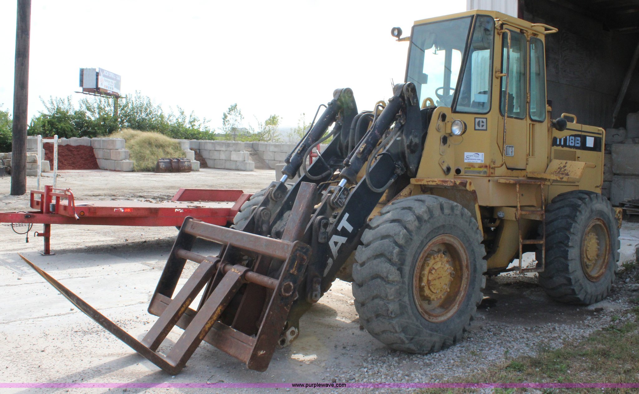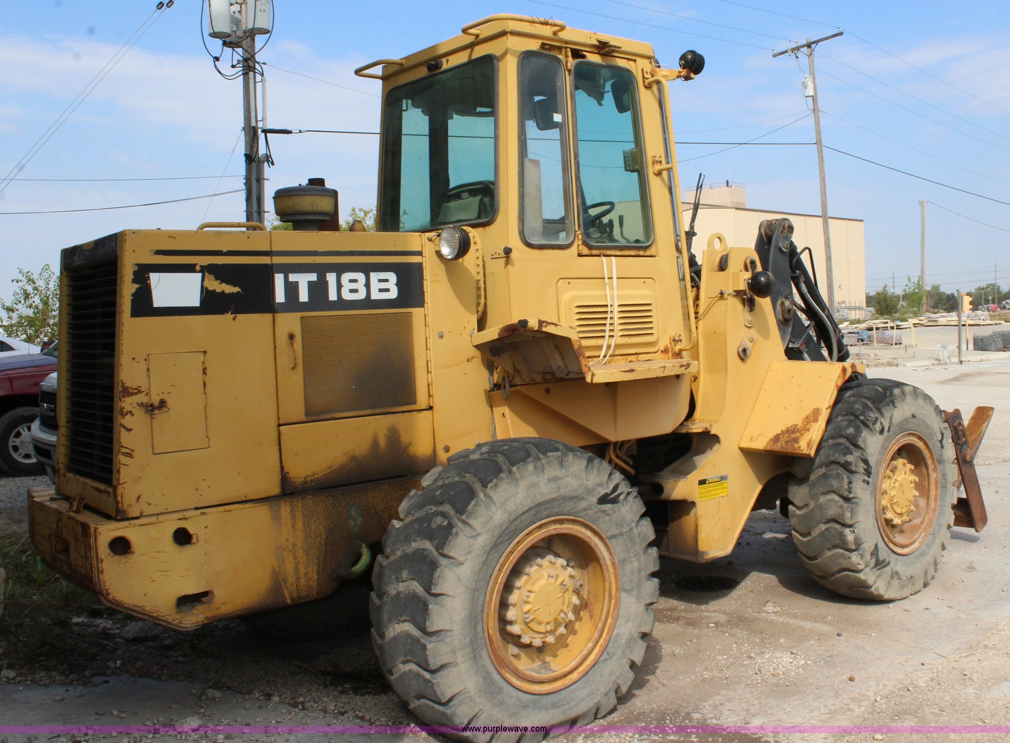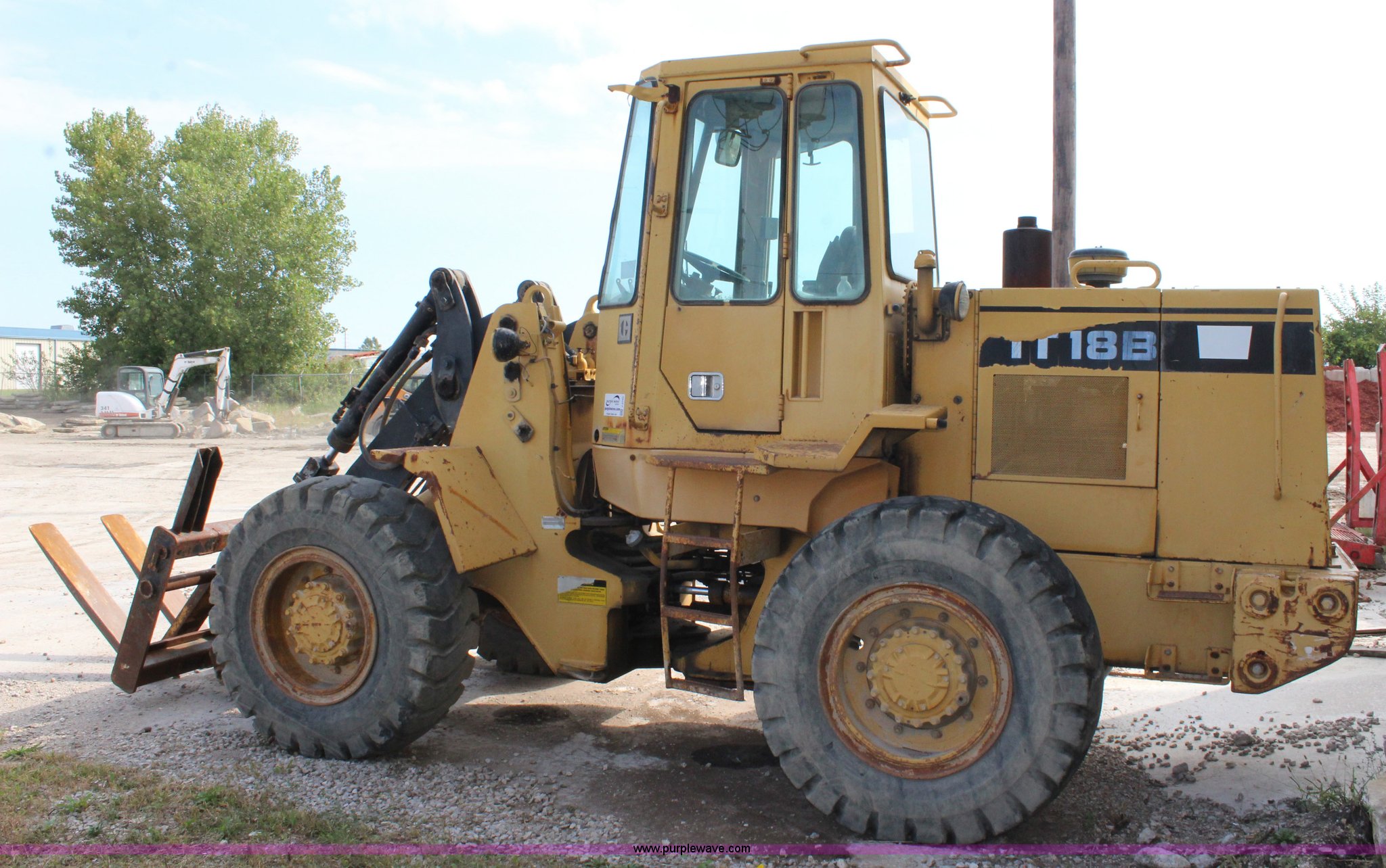 Purple Wave is selling a used Wheel Loader in Kansas. This item is a 1989 Caterpillar IT18B wheel loader with the following: 5,912 hours on meter, Caterpillar 3204 5.2L four cylinder turbo diesel engine, 95 HP, Powershift transmission, 4F-4R gears, Transmission issues in third and fourth gears, Enclosed cab, Hydraulic quick coupler, 94"W bucket, 1.25 cu. yd. capacity, Two-lever bucket controls, Pallet fork attachment, 48" x 7" forks, Counter weights, 17.5-25 tires, 20,066 lbs. base operating weight, Serial 4ZD00728