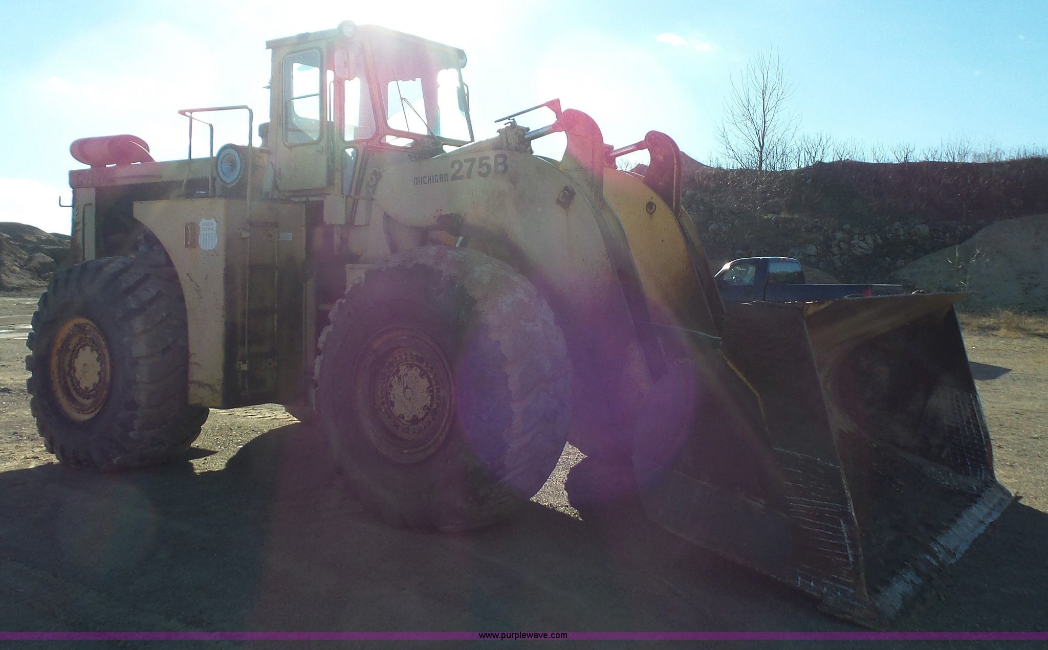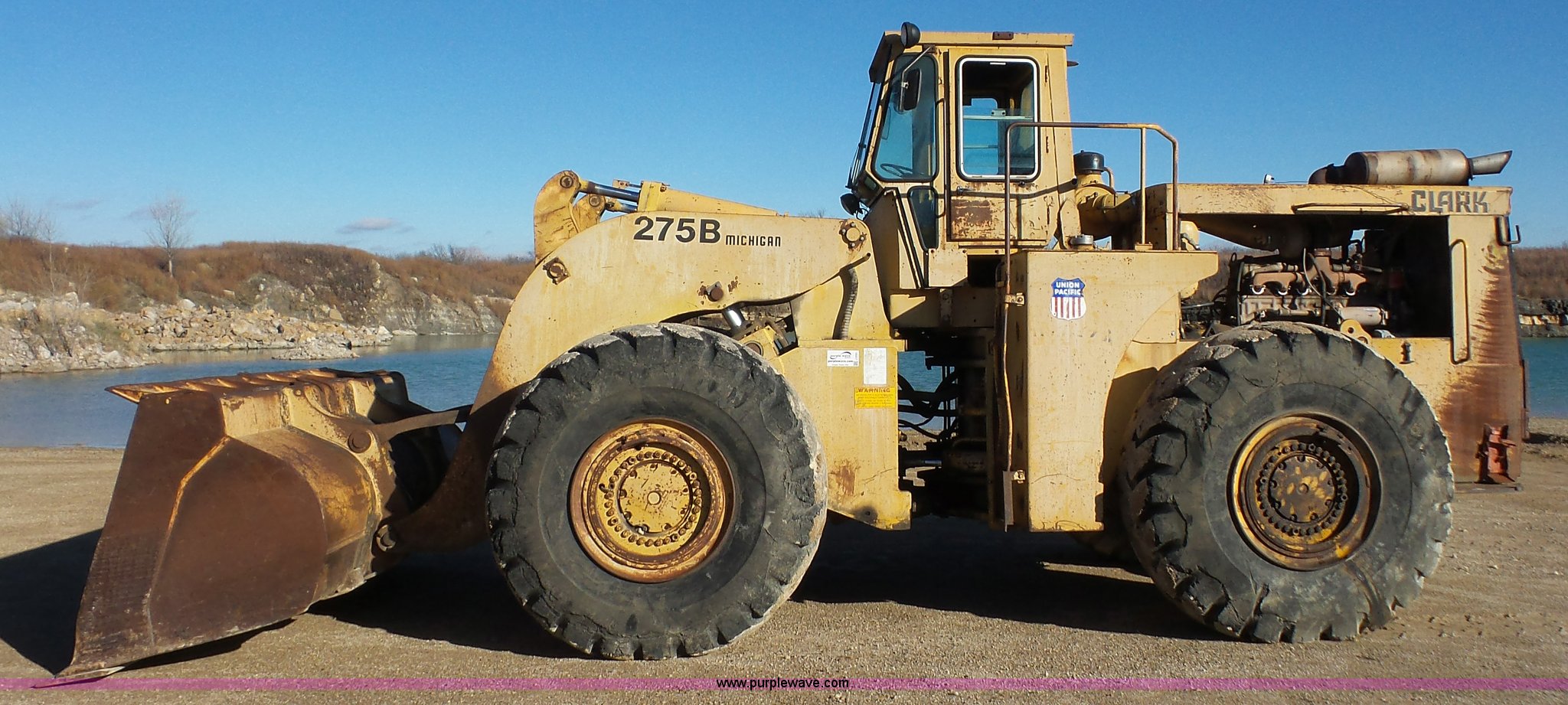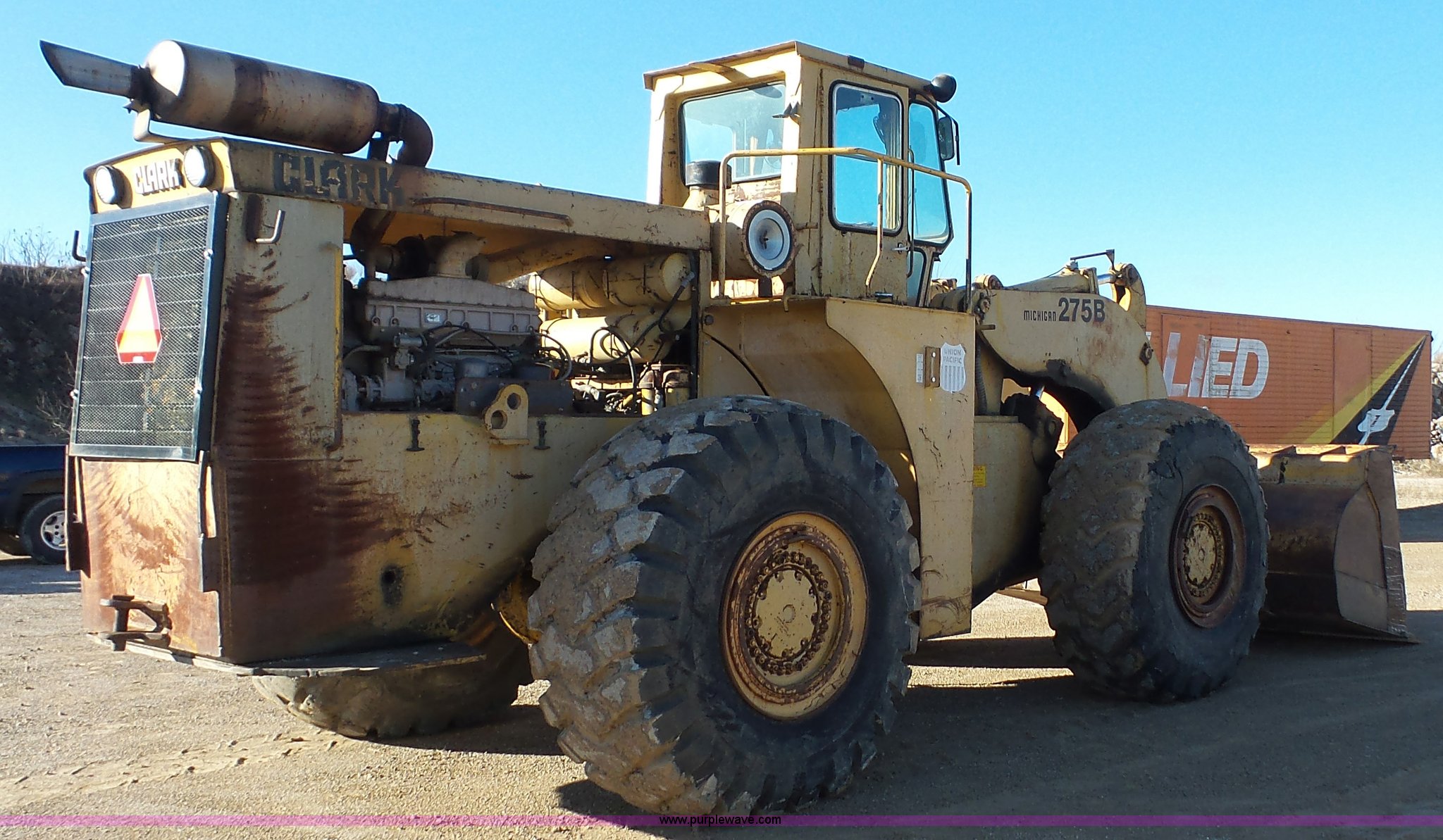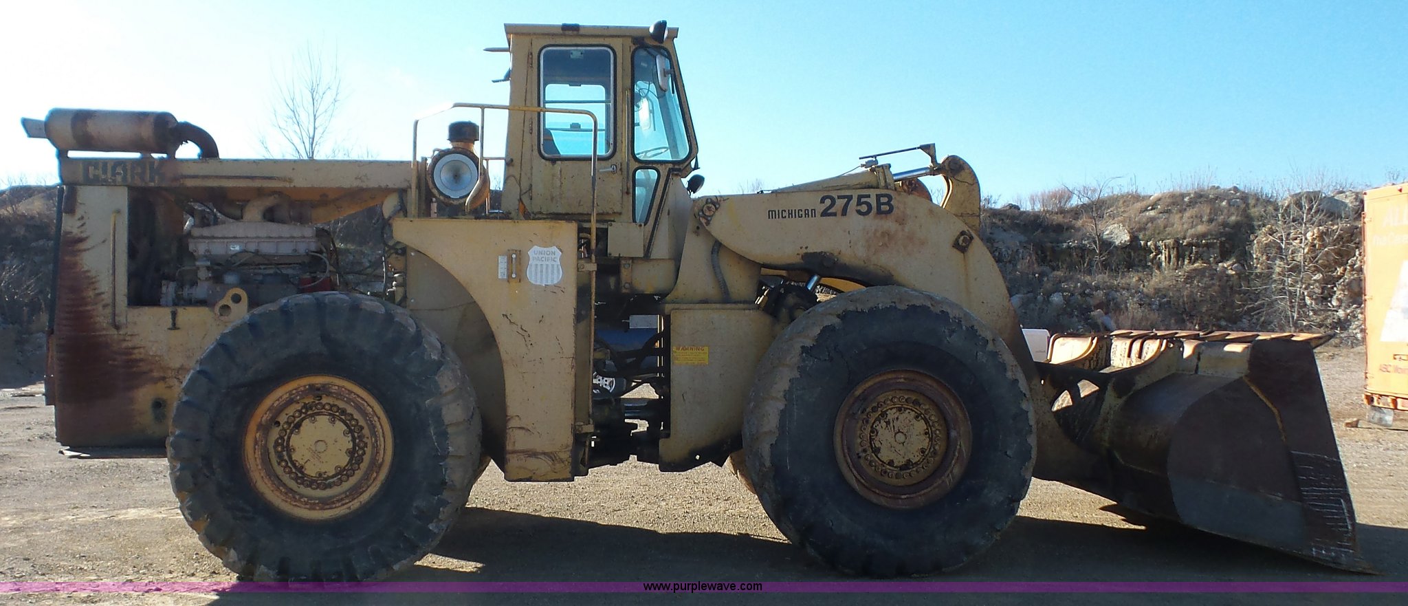 Purple Wave is selling a used Wheel Loader in Kansas. This item is a 1978 Michigan 275B wheel loader with the following: 4,095 hours on meter, Unknown actual hours, Cummins 5.9L L6 turbo diesel engine, Re-manufactured engine, Powershift transmission, 4F gears, Enclosed cab, 138"W general purpose bucket, Bolt-on cutting edge, 29.5-29 tires, 61,400 lbs. base operating weight, Serial 425D127C