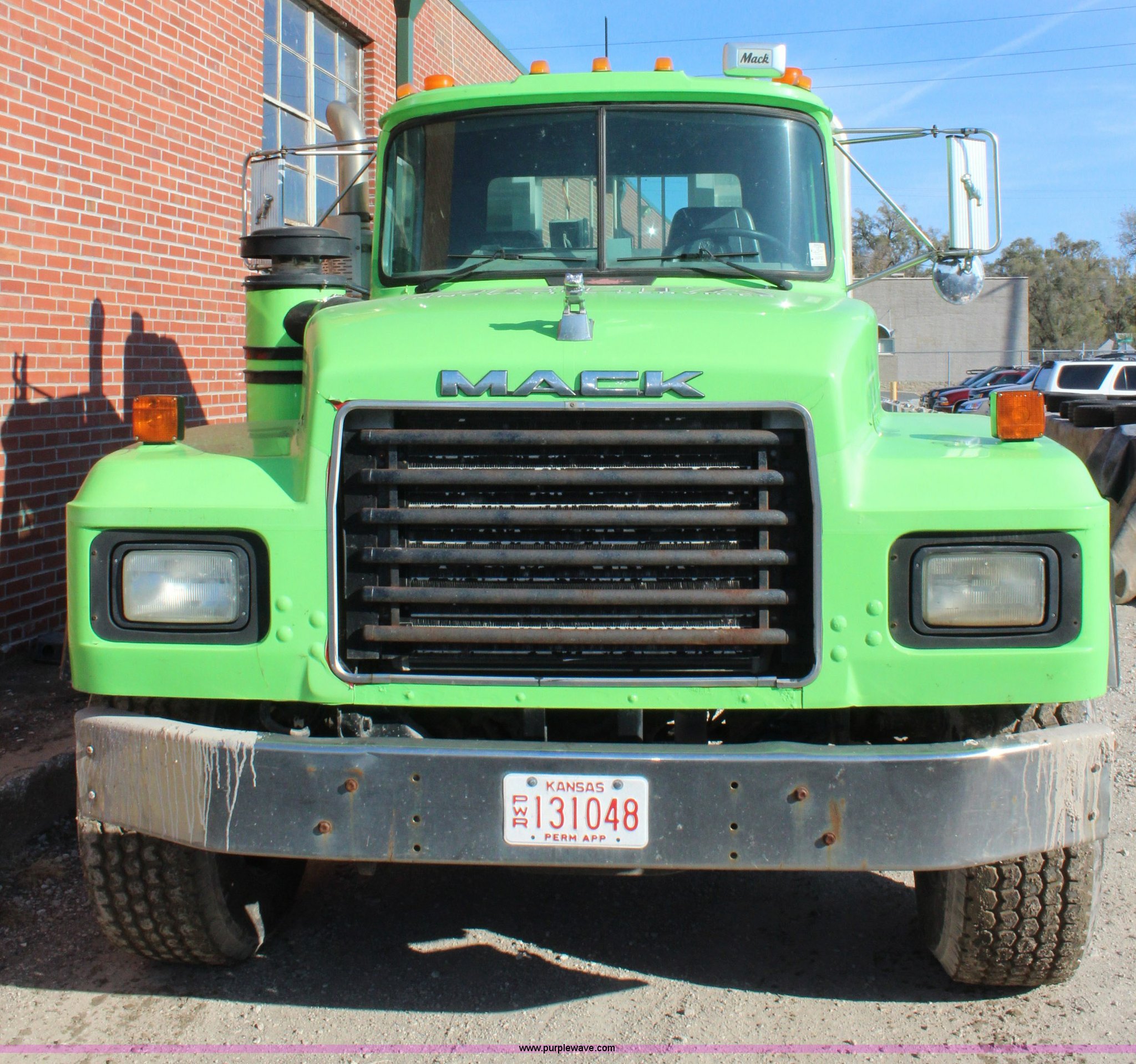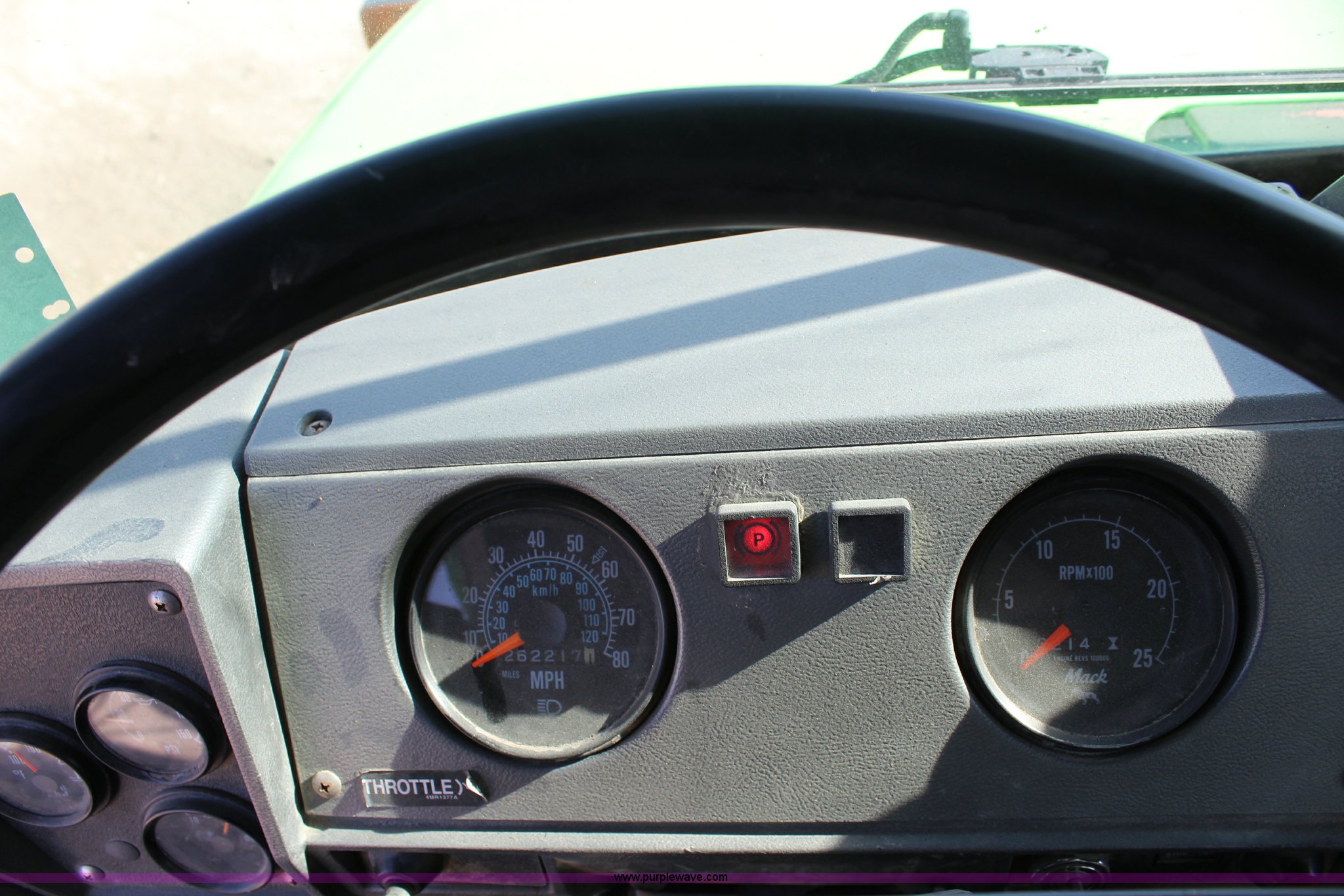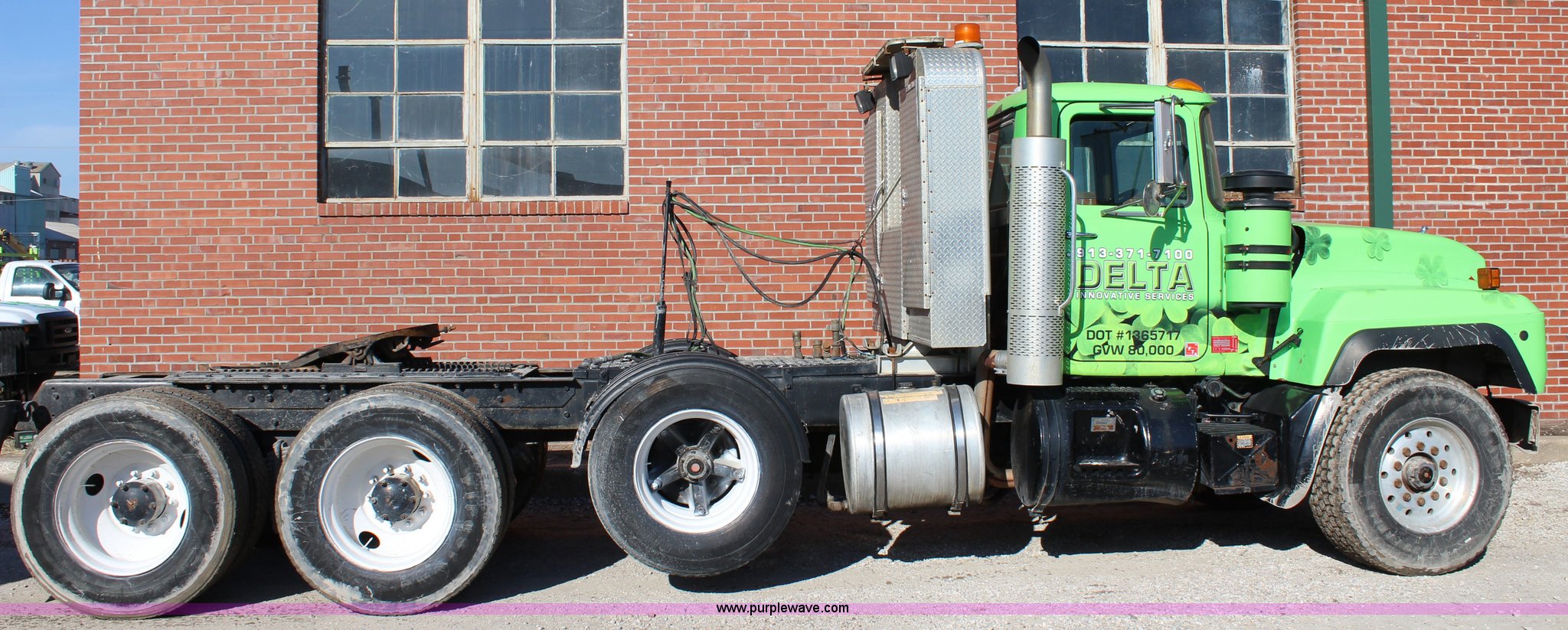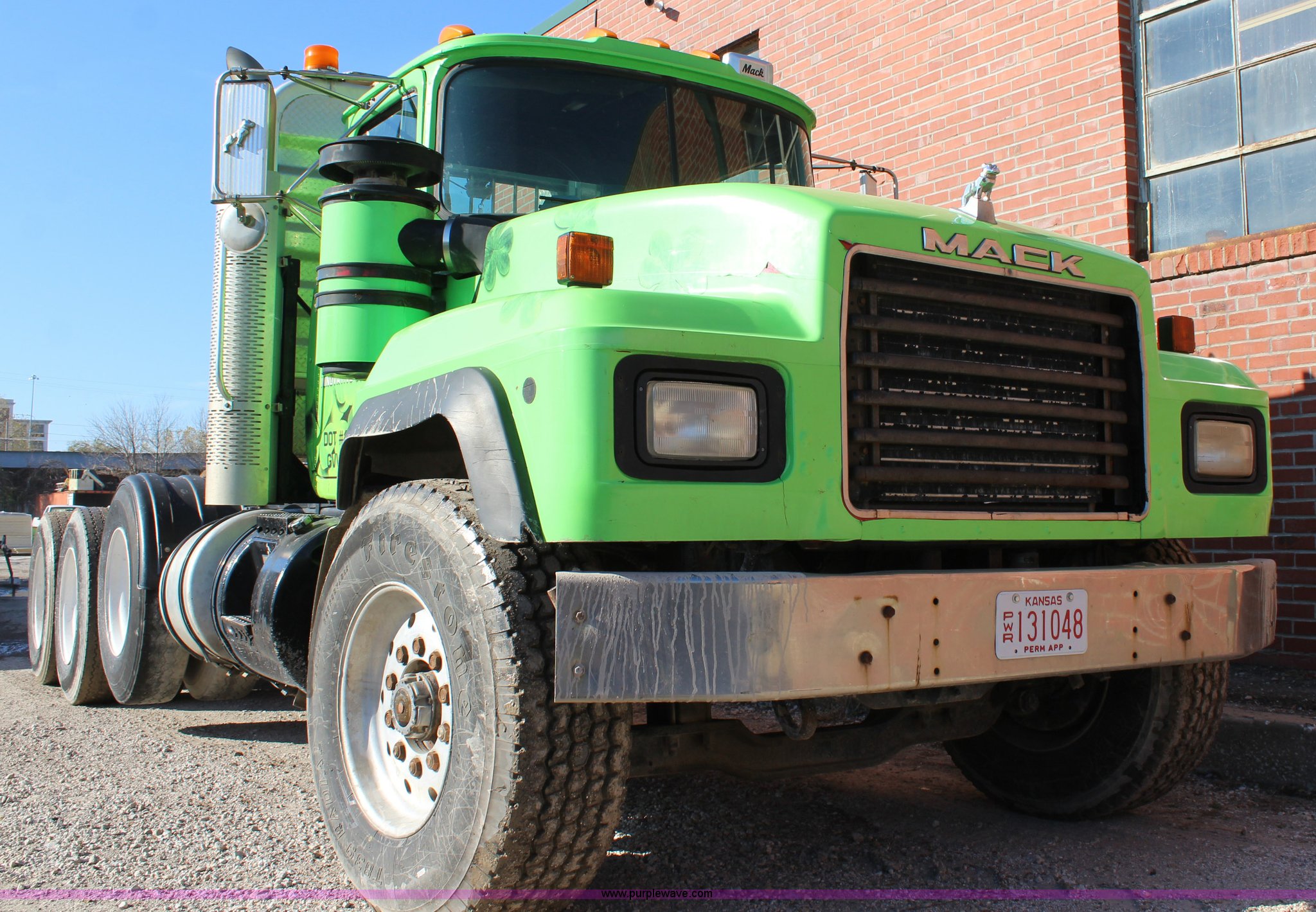 Purple Wave is selling a used Truck Tractor in Kansas. This item is a 2003 Mack RD600K semi truck with the following: 262,217 miles on odometer, 3,214 hours on meter, Mack six cylinder turbo diesel engine, Eaton Fuller 15 speed manual transmission, Triple axle, Inter-axle differential lock, AC and heat, AM/FM/cassette, Air suspension seat, Air ride cab, PTO, Wet kit, Glider kit, Aluminum headache rack, Steel deck plate, Sliding fifth wheel plate, Single exhaust stack, Dual fuel tanks, Camelback suspension, Air brakes, Air up/down pusher axle, 385/65R22.5 front tires, 11R22.5 pusher axle tires, 11R24.5 rear tires, FAWR 18,000 lbs, IAWR 20,000 lbs, RAWR 20,000 lbs, Seat torn