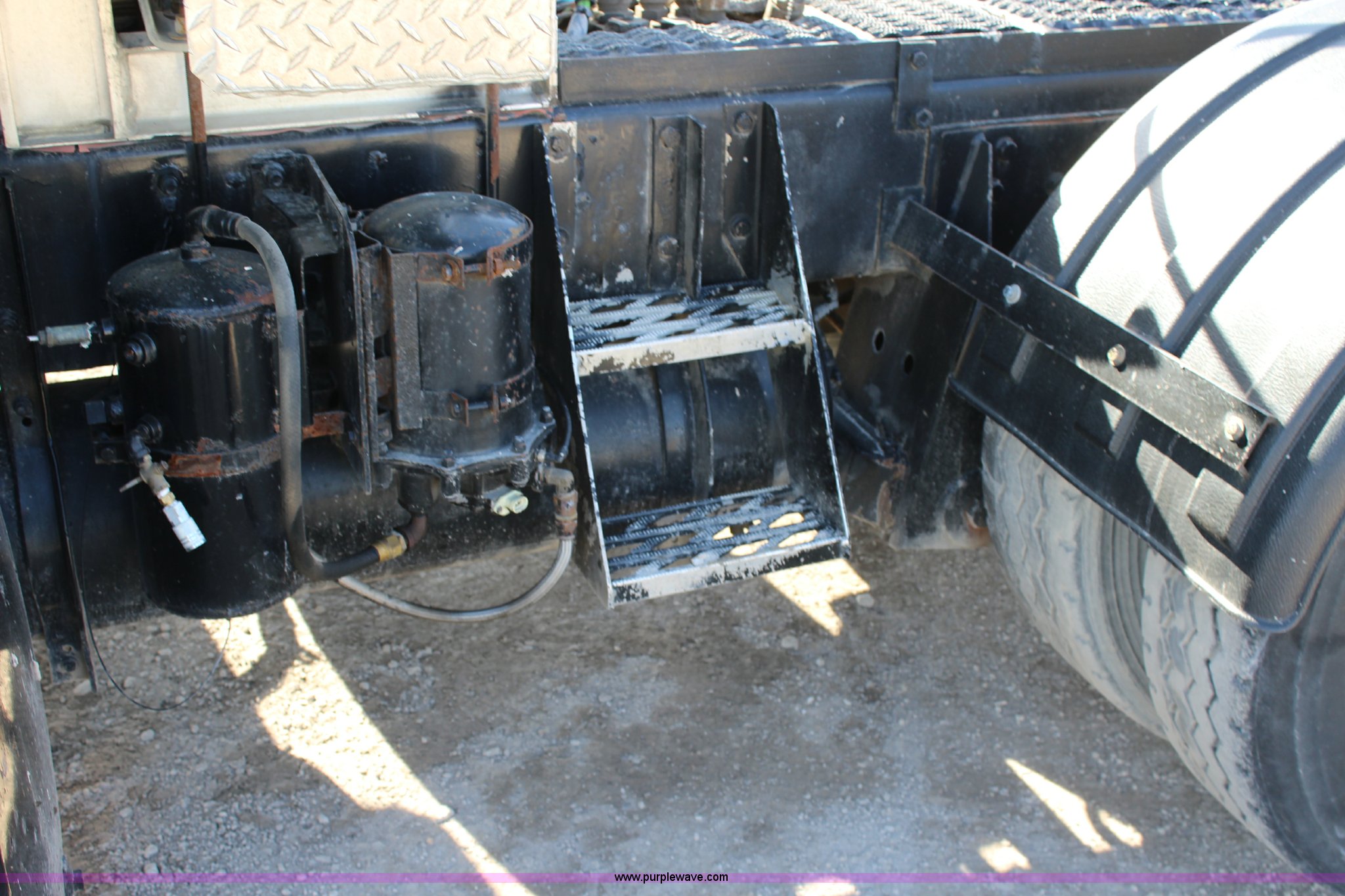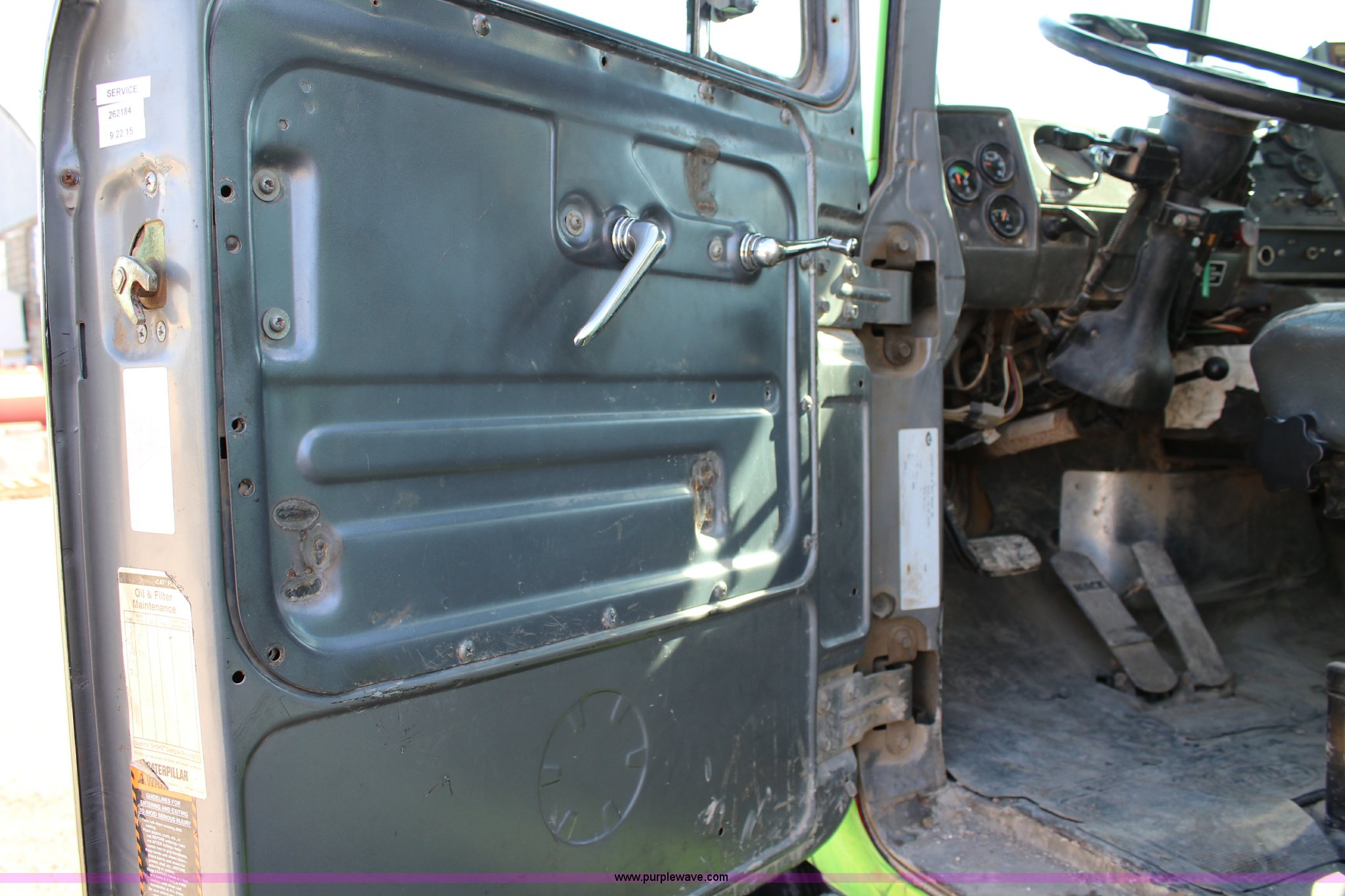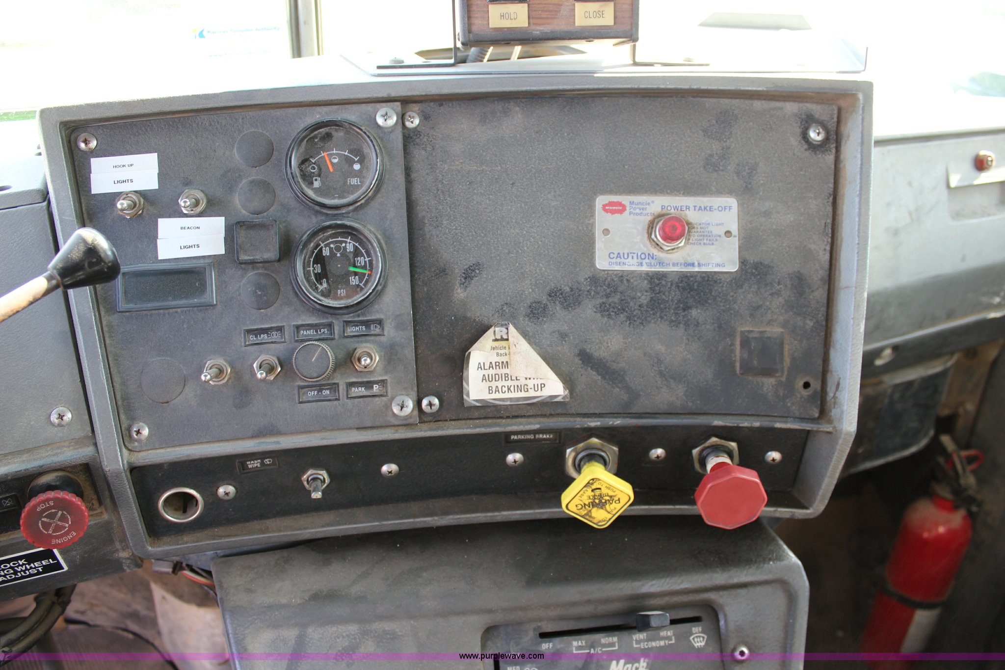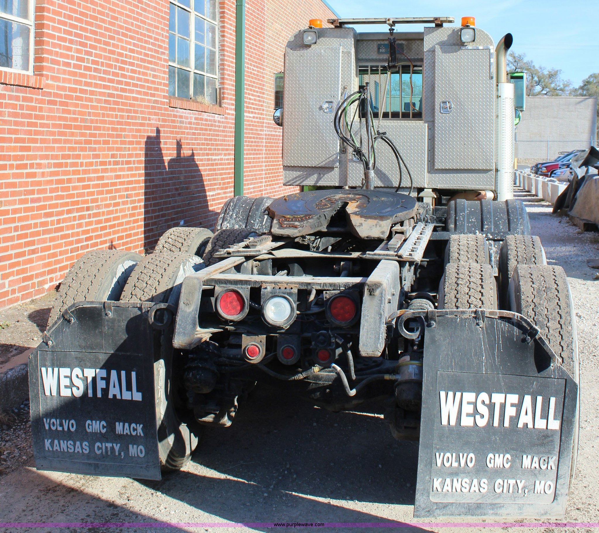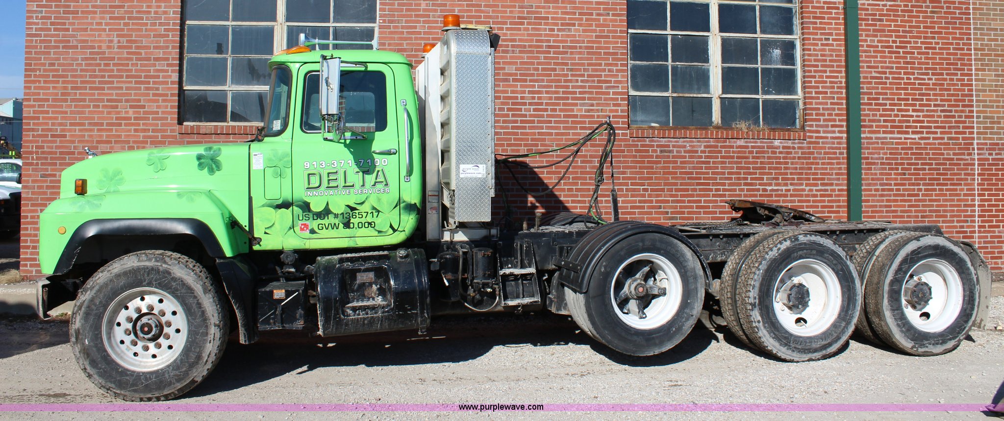 Purple Wave is selling a used Truck Tractor in Kansas. This item is a 2003 Mack RD600K semi truck with the following: 262,217 miles on odometer, 3,214 hours on meter, Mack six cylinder turbo diesel engine, Eaton Fuller 15 speed manual transmission, Triple axle, Inter-axle differential lock, AC and heat, AM/FM/cassette, Air suspension seat, Air ride cab, PTO, Wet kit, Glider kit, Aluminum headache rack, Steel deck plate, Sliding fifth wheel plate, Single exhaust stack, Dual fuel tanks, Camelback suspension, Air brakes, Air up/down pusher axle, 385/65R22.5 front tires, 11R22.5 pusher axle tires, 11R24.5 rear tires, FAWR 18,000 lbs, IAWR 20,000 lbs, RAWR 20,000 lbs, Seat torn