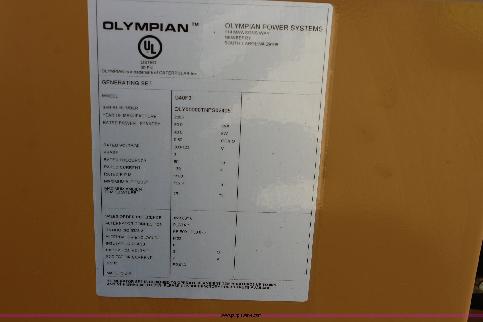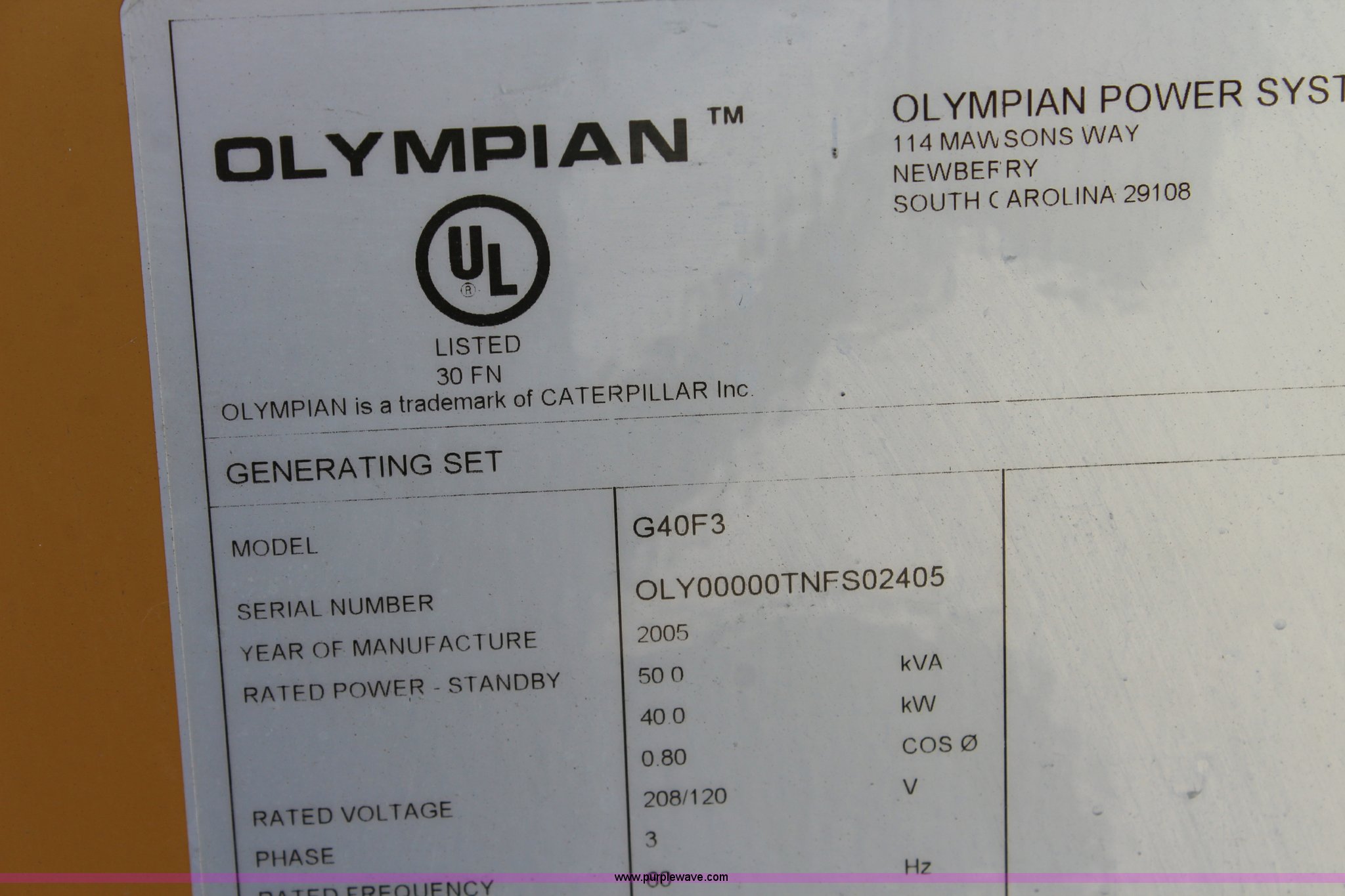 Purple Wave is selling a used Generator Set in Kansas. This item is a Olympian G40F3 generator with the following: 154 hours on meter, Six cylinder natural gas engine, 40 kW, Three phase, No battery, Operational when removed from service two years ago, Serial OLY00000TNFS02405