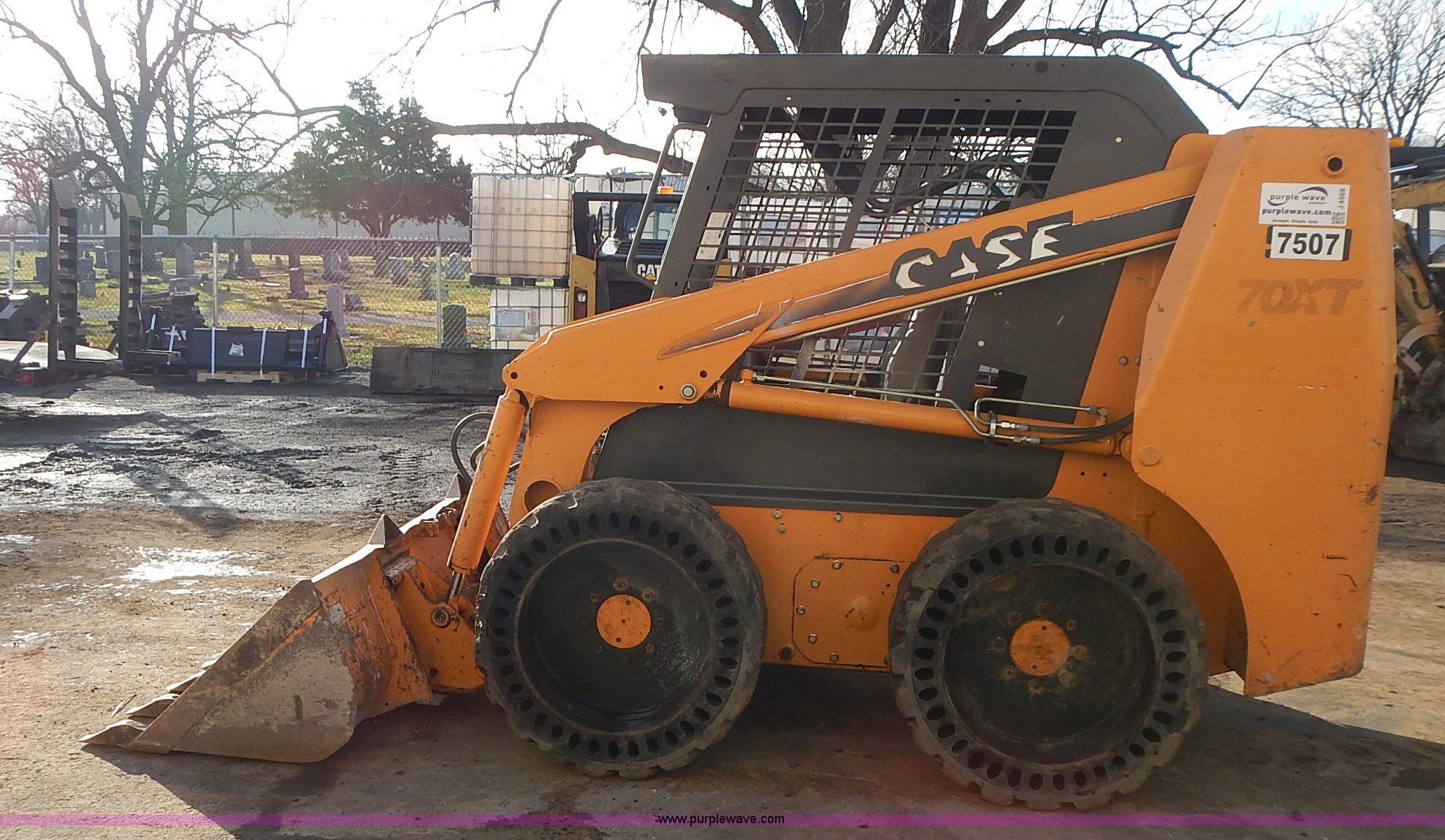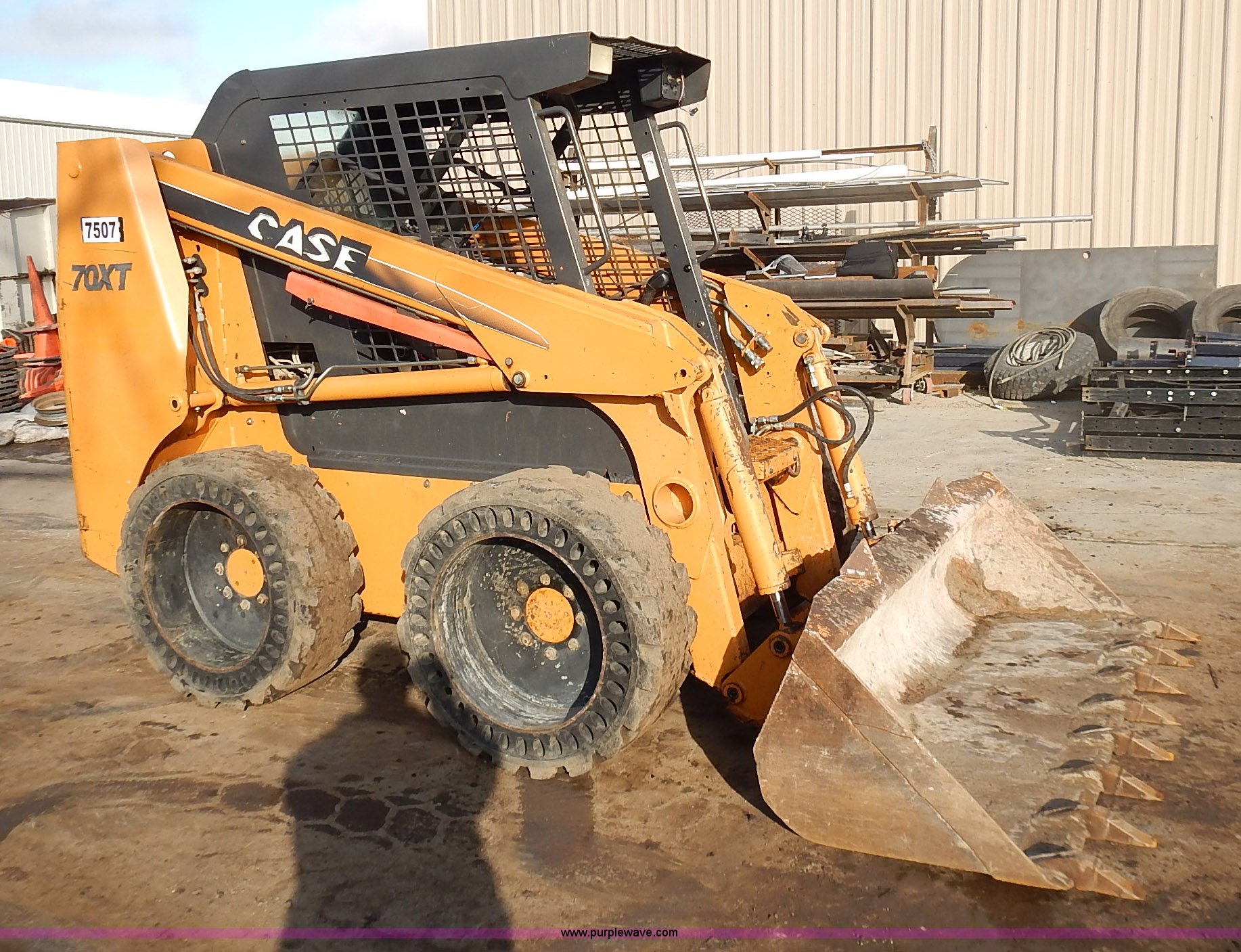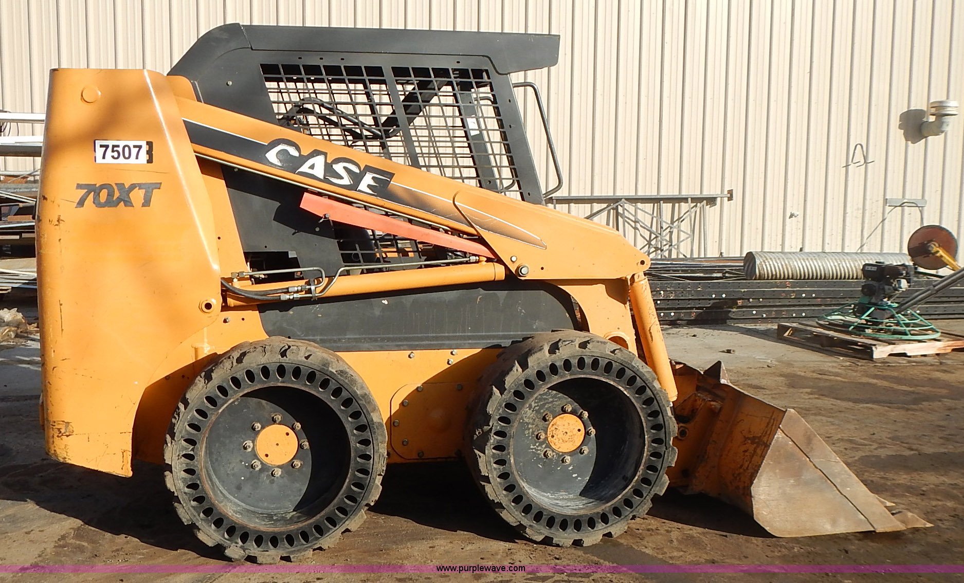 Purple Wave is selling a used Skid Steer Loader in Kansas. This item is a 2005 Case 70XT skid steer with the following: 1,479 hours on meter, Four cylinder turbo diesel engine, Hydrostatic transmission, Open station/canopy, Joystick controls, Front work lights, Block heater, Case 6'W bucket, Weld-on cutting edge, (8) bolt-on teeth, .39 cubic yard capacity, Auxiliary hydraulics, Solid tires, 6,906 lbs. base operating weight, One work light missing, Seat damaged, Serial JAF416441, Unit# 7507