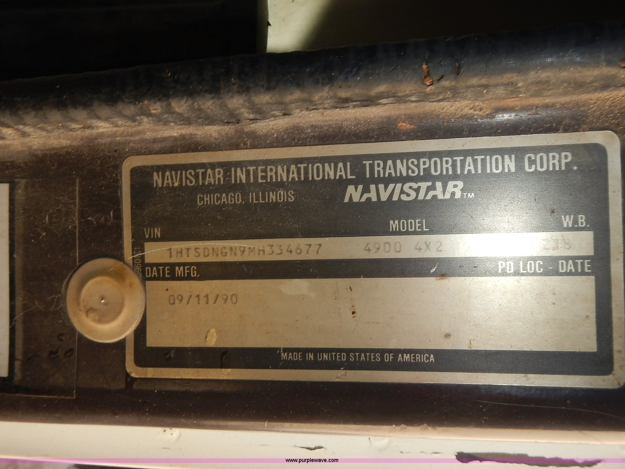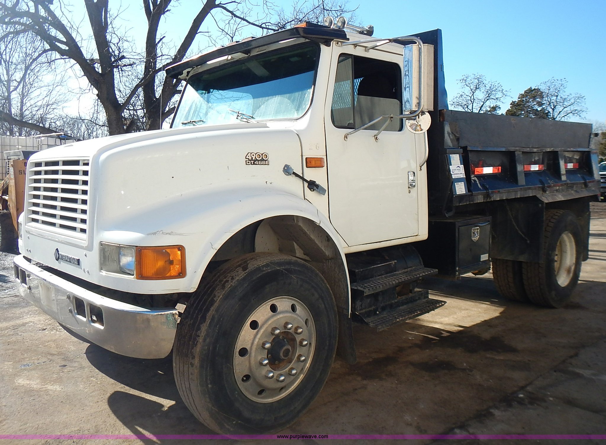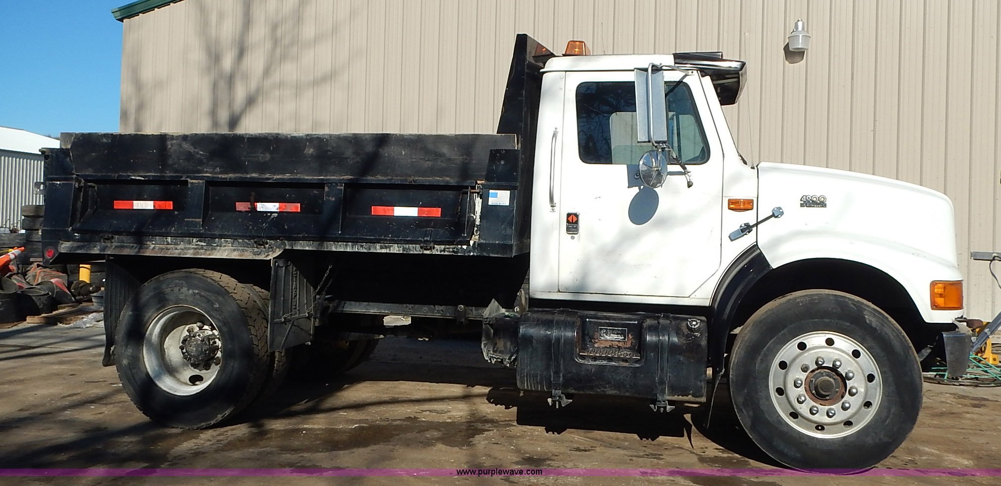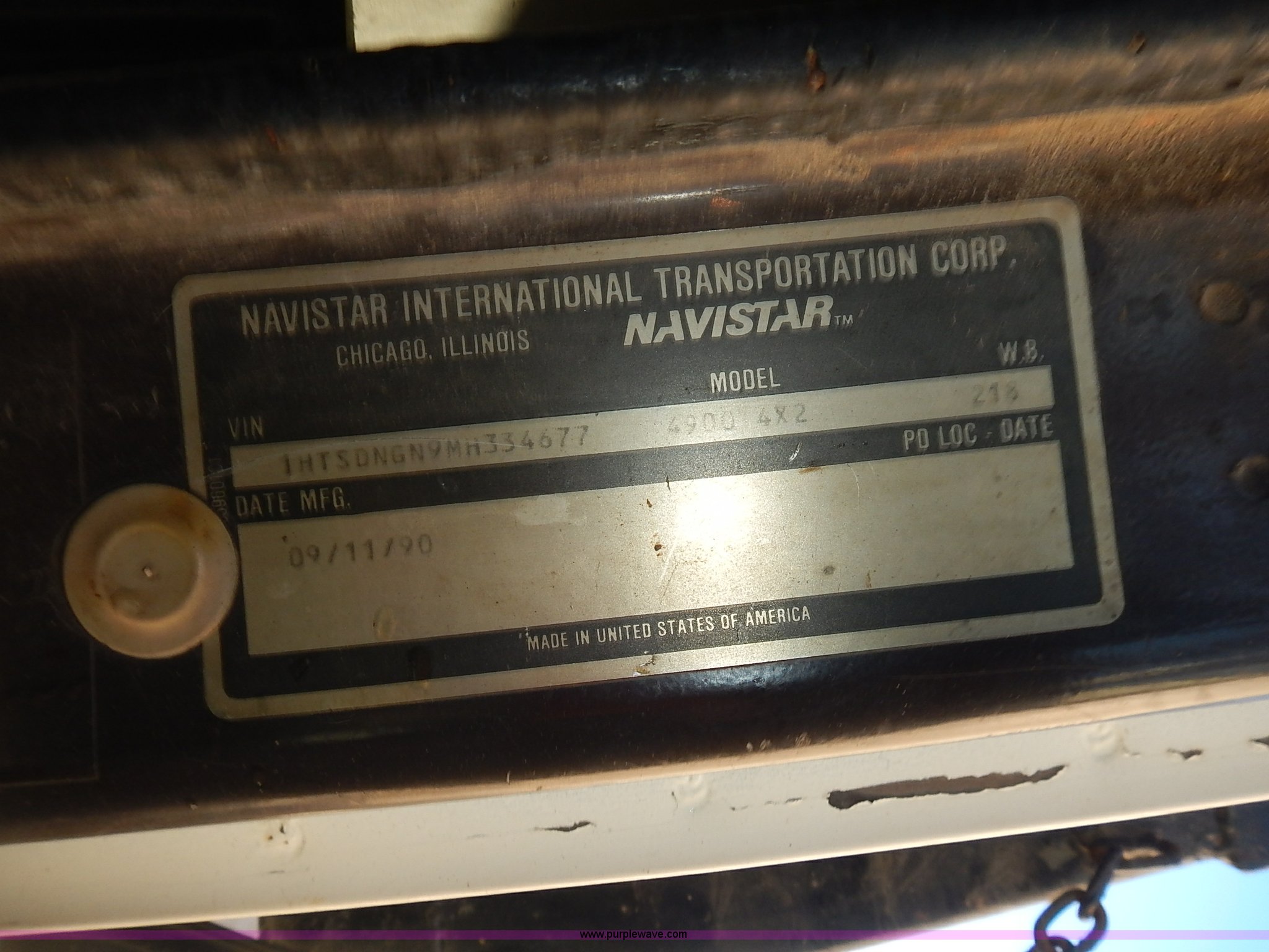 Purple Wave is selling a used Construction Dump Truck in Kansas. This item is a 1991 International 4900 dump truck with the following: 57,029 miles on odometer, Odometer has been changed, International DT466 736L L6 diesel engine, 230 HP, Seven speed manual transmission, Heat, AM/FM, Air suspension seat, Block heater, Exterior visor, 11'L x 91"W steel dump bed, 16" folding side boards, Manual operated end gate, Tool boxes, 68 gallon fuel tank, Backup alarm, Pintle hitch, Trailer wiring, Spring suspension, Air brakes, 158" wheelbase, 11R22.5 tires, Dents and scratches