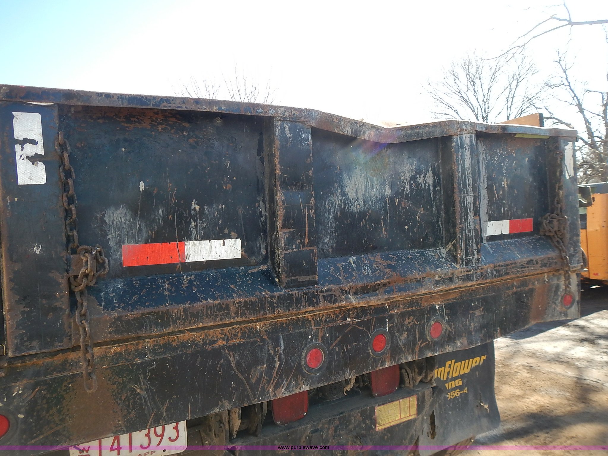 1991 International 4900 dump truck. 57,029 miles on odometer Odometer has been changed, International DT466 736L L6 diesel engine 230 HP, Seven speed manual transmission, Heat, AM/FM, Air suspension seat, Block heater, Exterior visor, 11'L x 91"W steel dump bed 16" folding side boards, Manual operated end gate, Tool boxes, 68 gallon fuel tank, Backup alarm, Pintle hitch, Trailer wiring, Spring suspension, Air brakes, 158" wheelbase, 11R22.5 tires, Dents and scratches. Vehicle has an E-Title in the State of Kansas. Buyer will receive a paper title within 30 days from verification of funds. 1HTSDNGN9MH334677. View equipment video. Sunflower Paving. 1457 N. 1823 Road. Lawrence, KS 66044