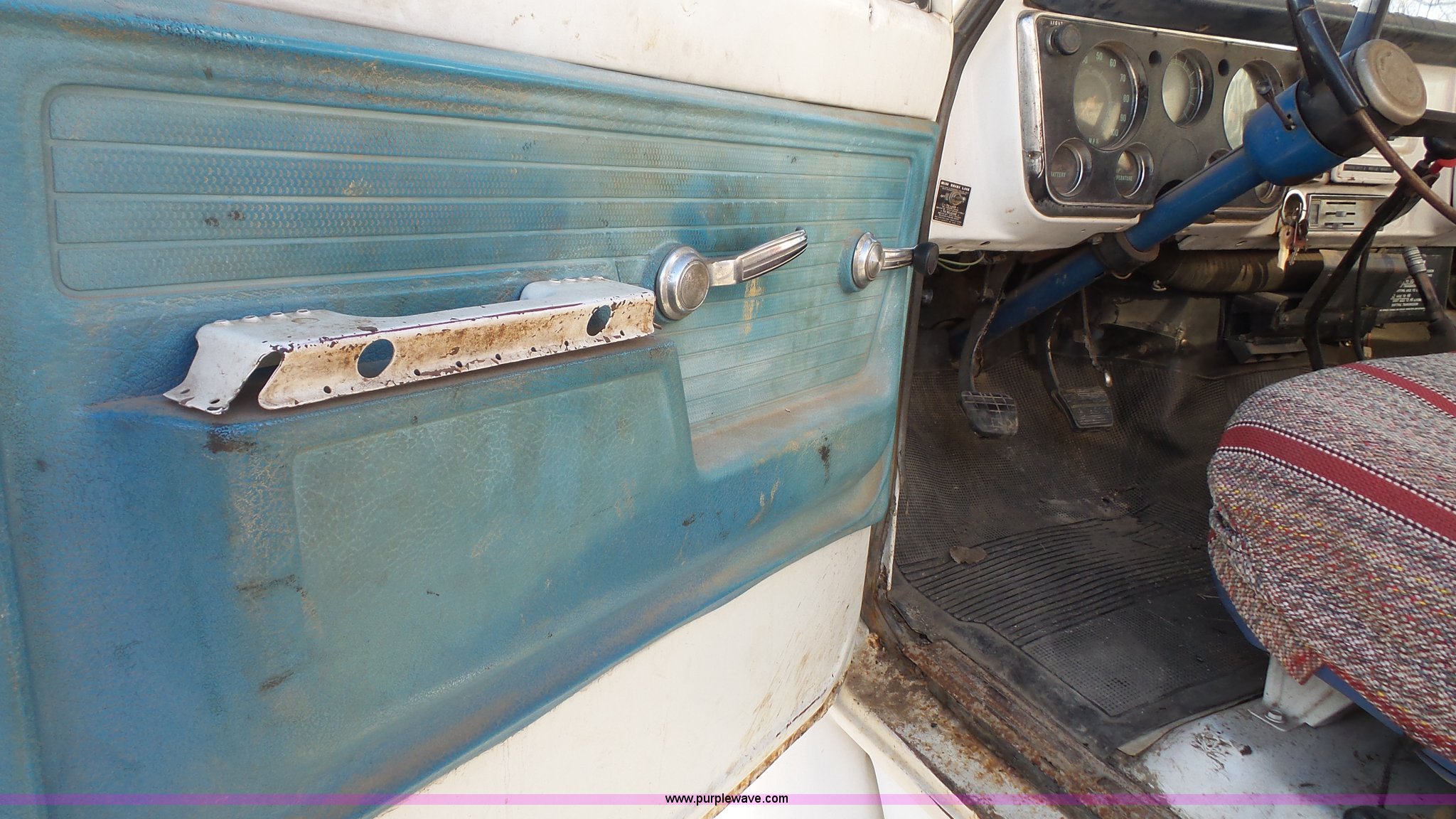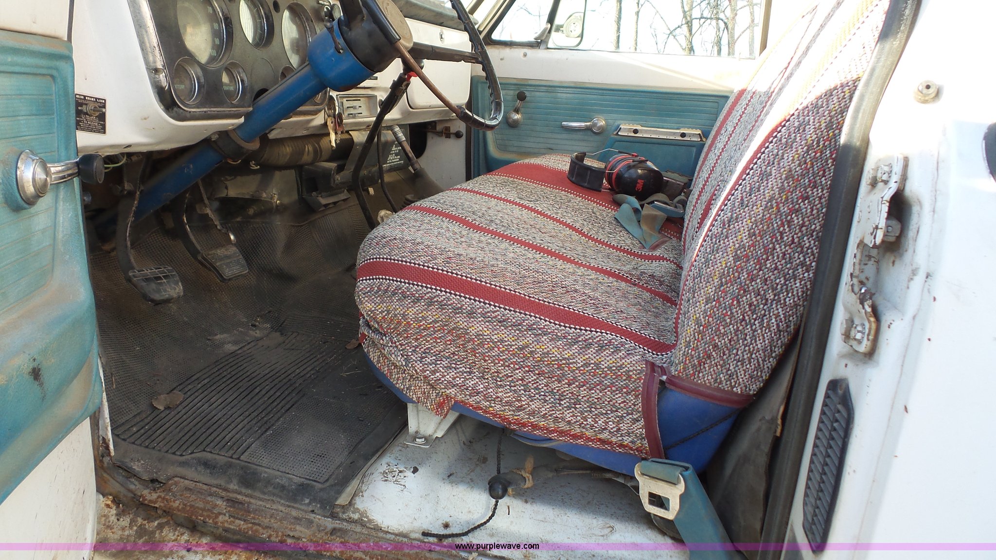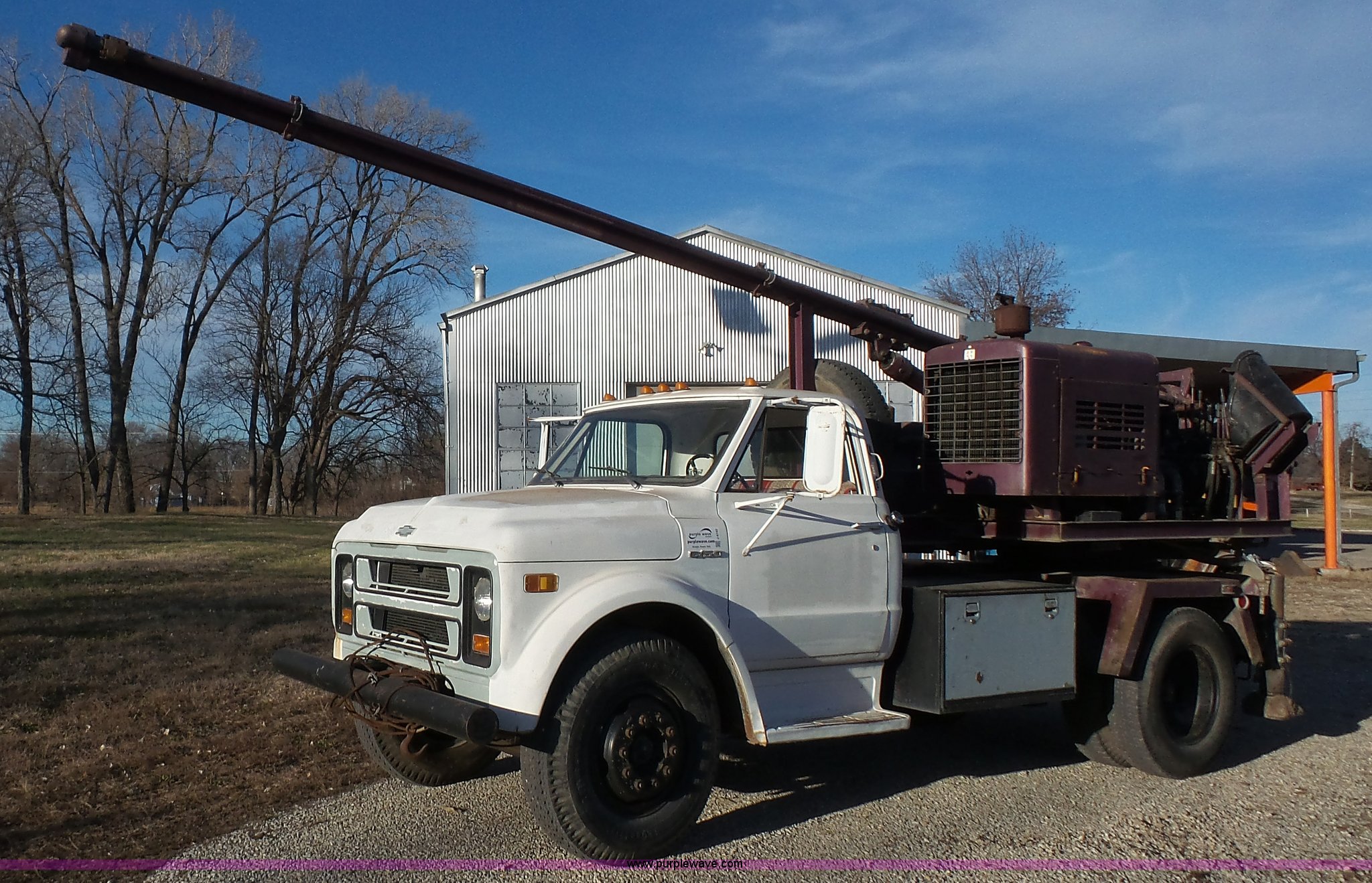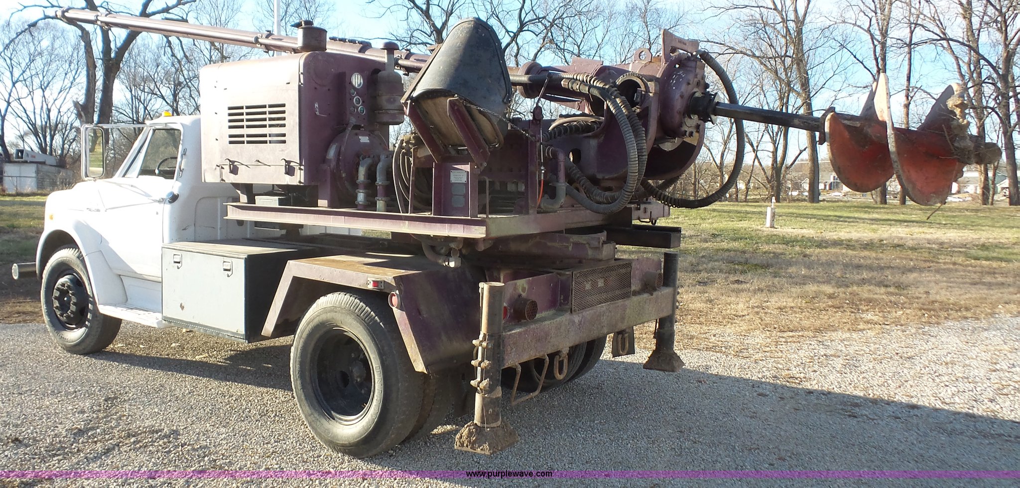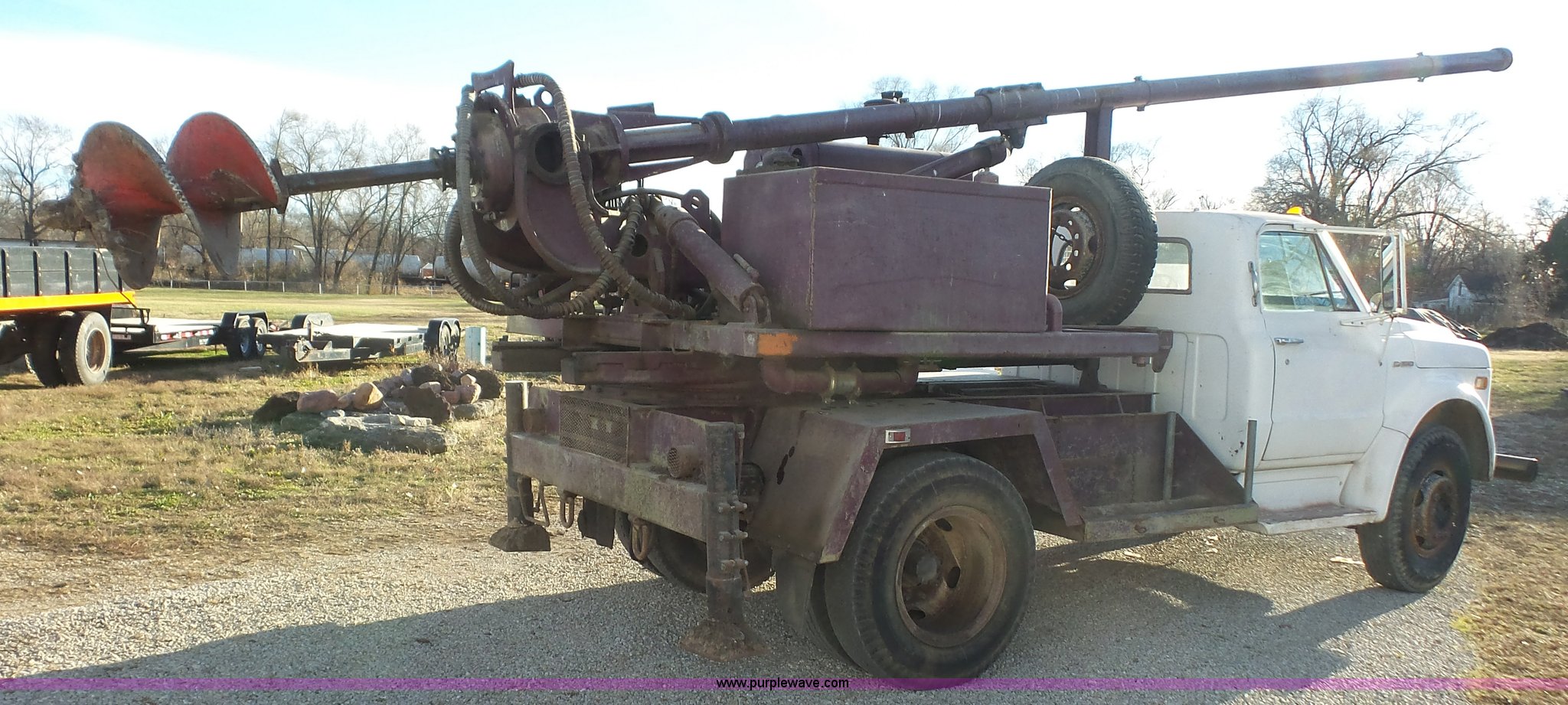 Purple Wave is selling a used Bucket Truck in Kansas. This item is a 1972 Chevrolet C50 hydra digger truck with the following: 91,638 miles on odometer, 350 C.I.D. gas engine, Four speed manual transmission, Suspension seat, 1972 Hughes hydra-digger, Serial 258, 3,314 hours on meter, Six cylinder gas engine, Outriggers, 20' maximum digging depth, (3) 16" bits, 20" combination bit, 20" core bit, 24" rock bit, 24" soil bit, Spring suspension, Hydraulic brakes, 9.00-20 tires, GVWR 22,000 lbs, FAWR 7,000 lbs, RAWR 15,000 lbs