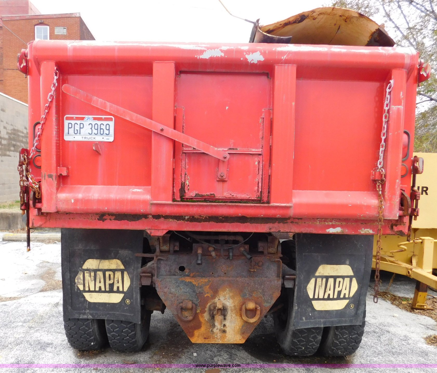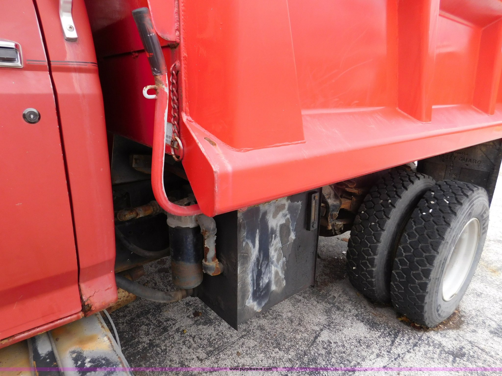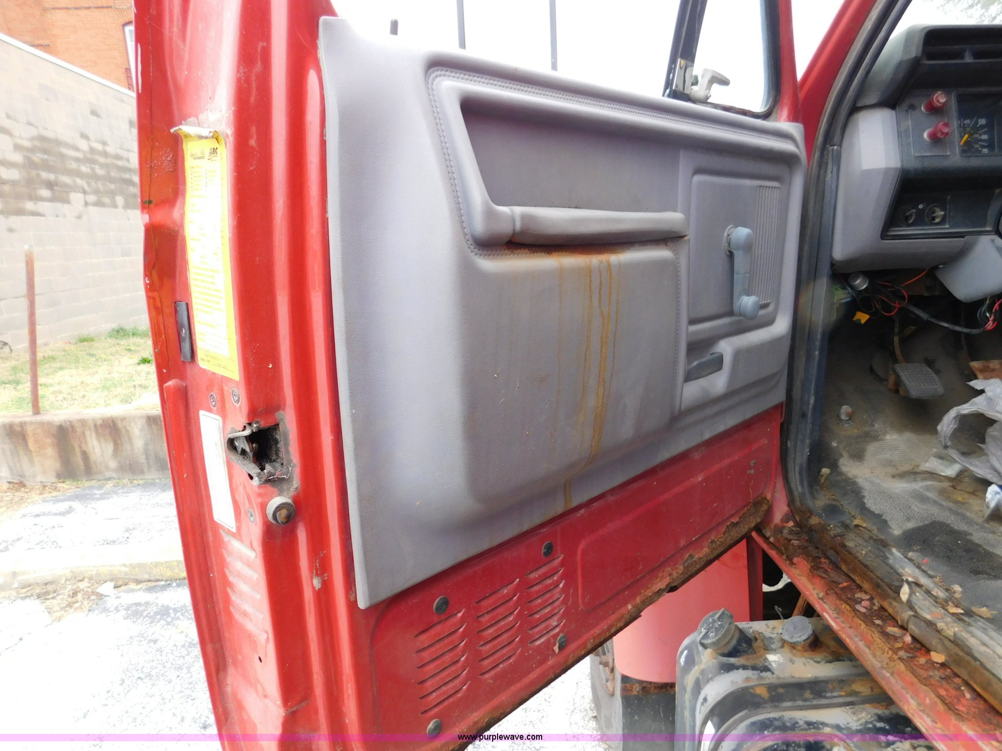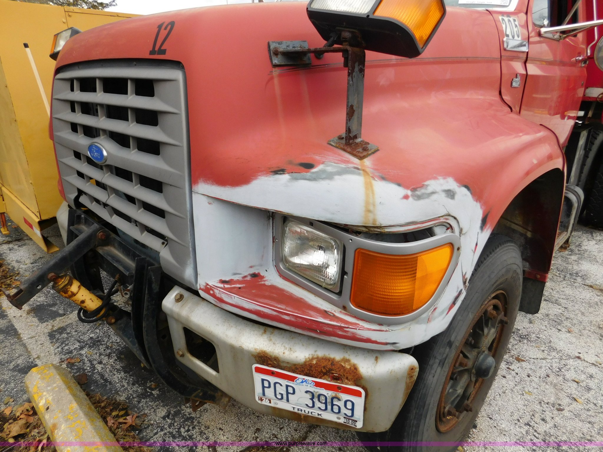 Purple Wave is selling a used Construction Dump Truck in Illinois. This item is a 1995 Ford F700 dump truck with the following: 81,197 miles on odometer, Ford 7.0L V8 gas engine, Five speed manual transmission, Steel dump bed, Spring suspension, Pintle hitch, 10R22.5 front tires, 295/75R22.5 rear tires, GVWR 26,000 lbs, Interior/exterior cosmetic damage