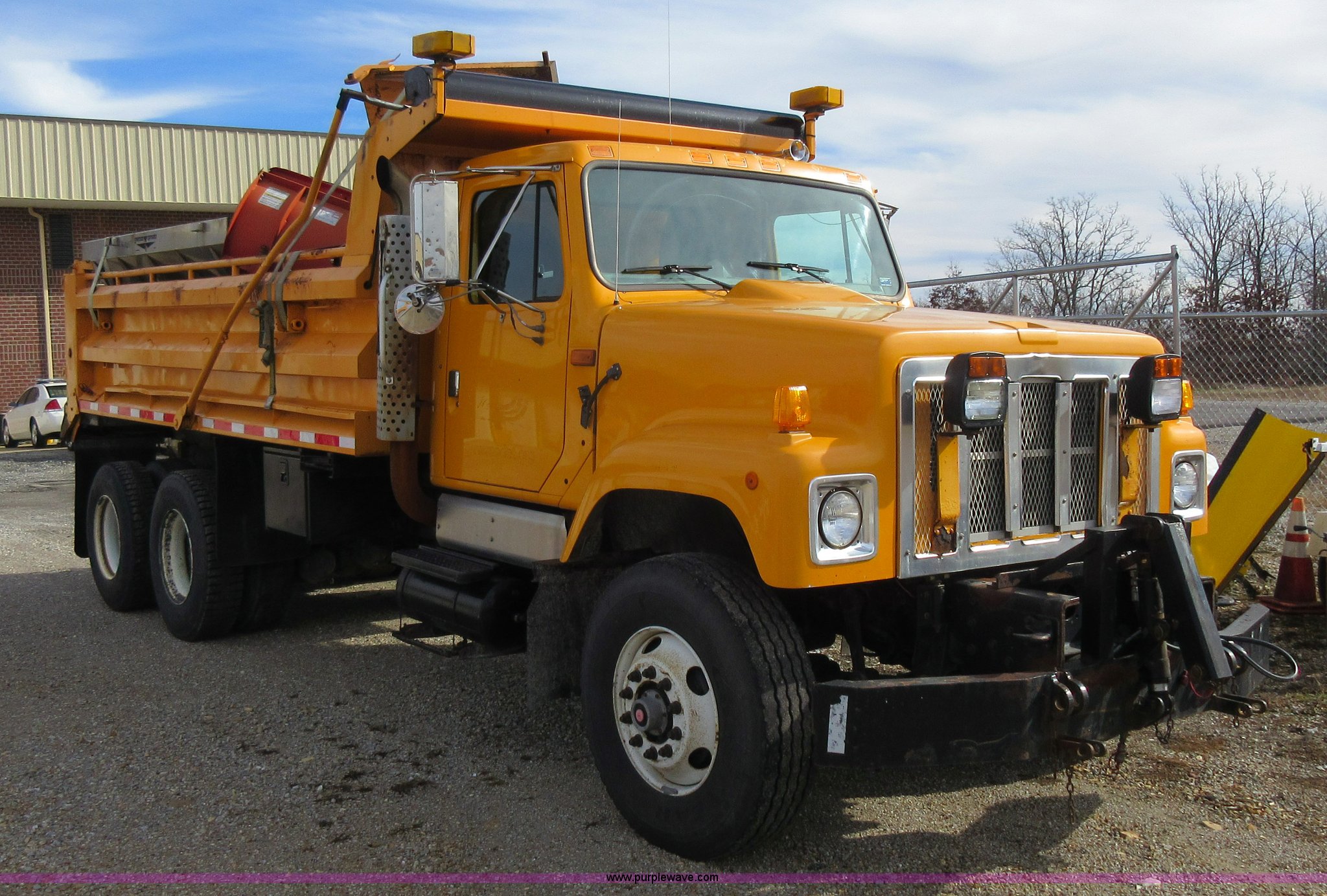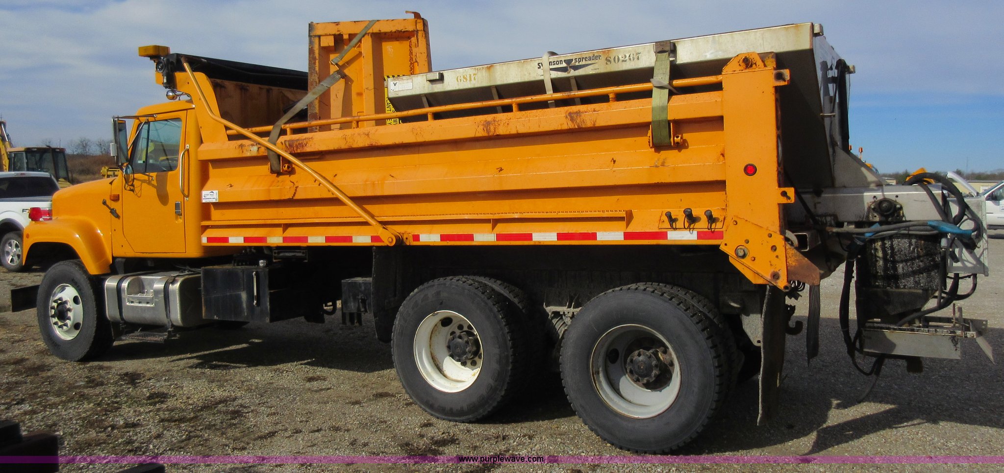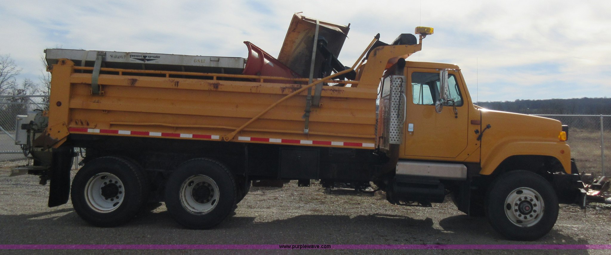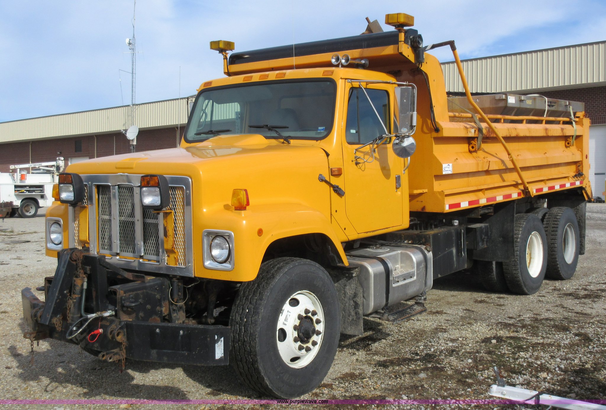 Purple Wave is selling a used Construction Dump Truck in Missouri. This item is a 2002 International F2554 dump truck with the following: 138,847 miles on odometer, 7,597 hours on meter, International DT530 8.7L L6 diesel engine, Automatic transmission, Heat, Cruise, AM/FM, Power windows, Heated mirrors, Air suspension seat, PTO, 16'L x 8'W dump bed, 36"H side boards, Western snow plow, Swensen stainless steel spreader, Hydraulic driven, Pintle hitch, Spring suspension, Air brakes, 216" wheelbase, 11R22.5 front tires, 315/80R22.5 rear tires, Hole in cab floor, CB is not included, Unit# 6827