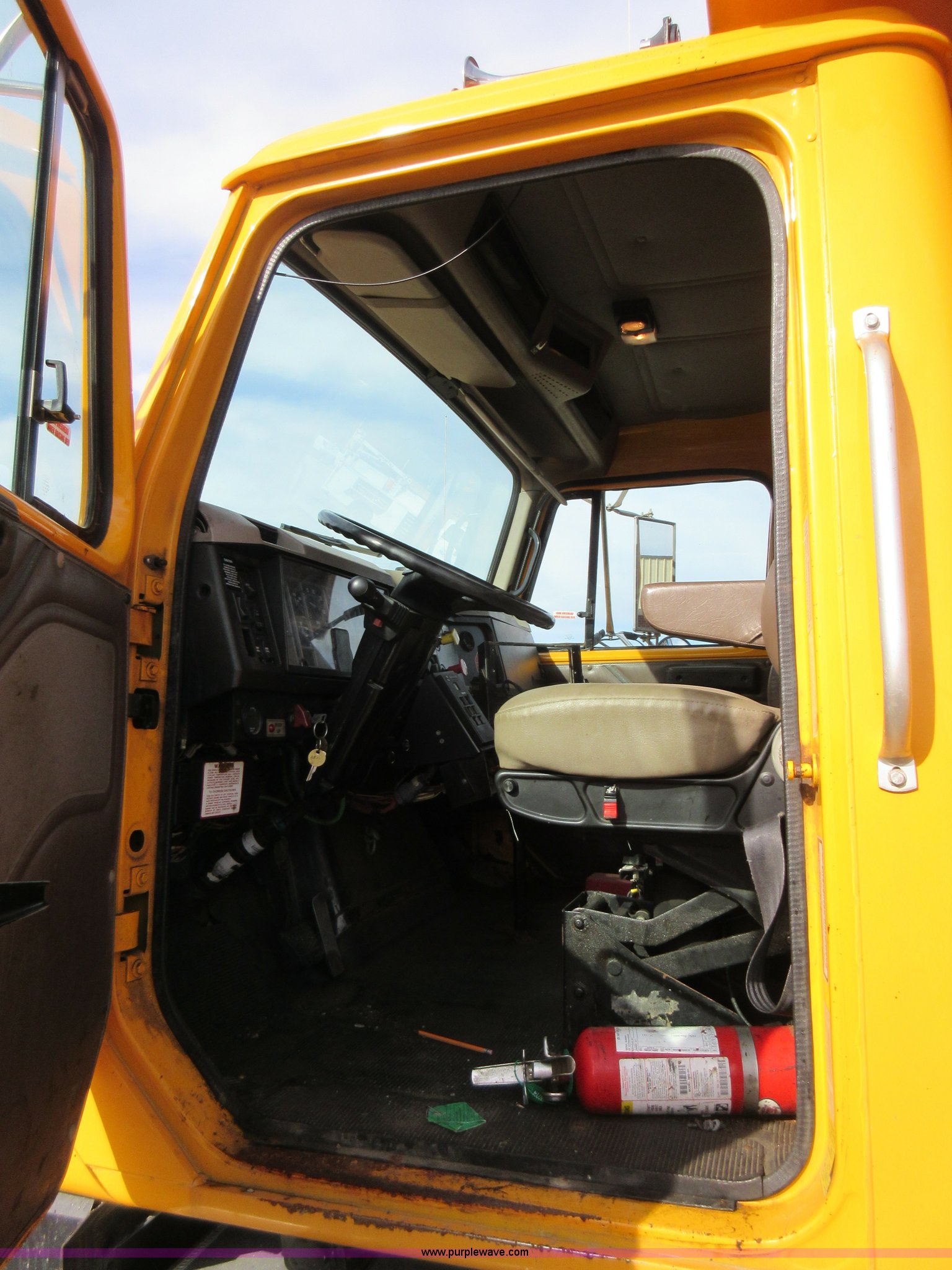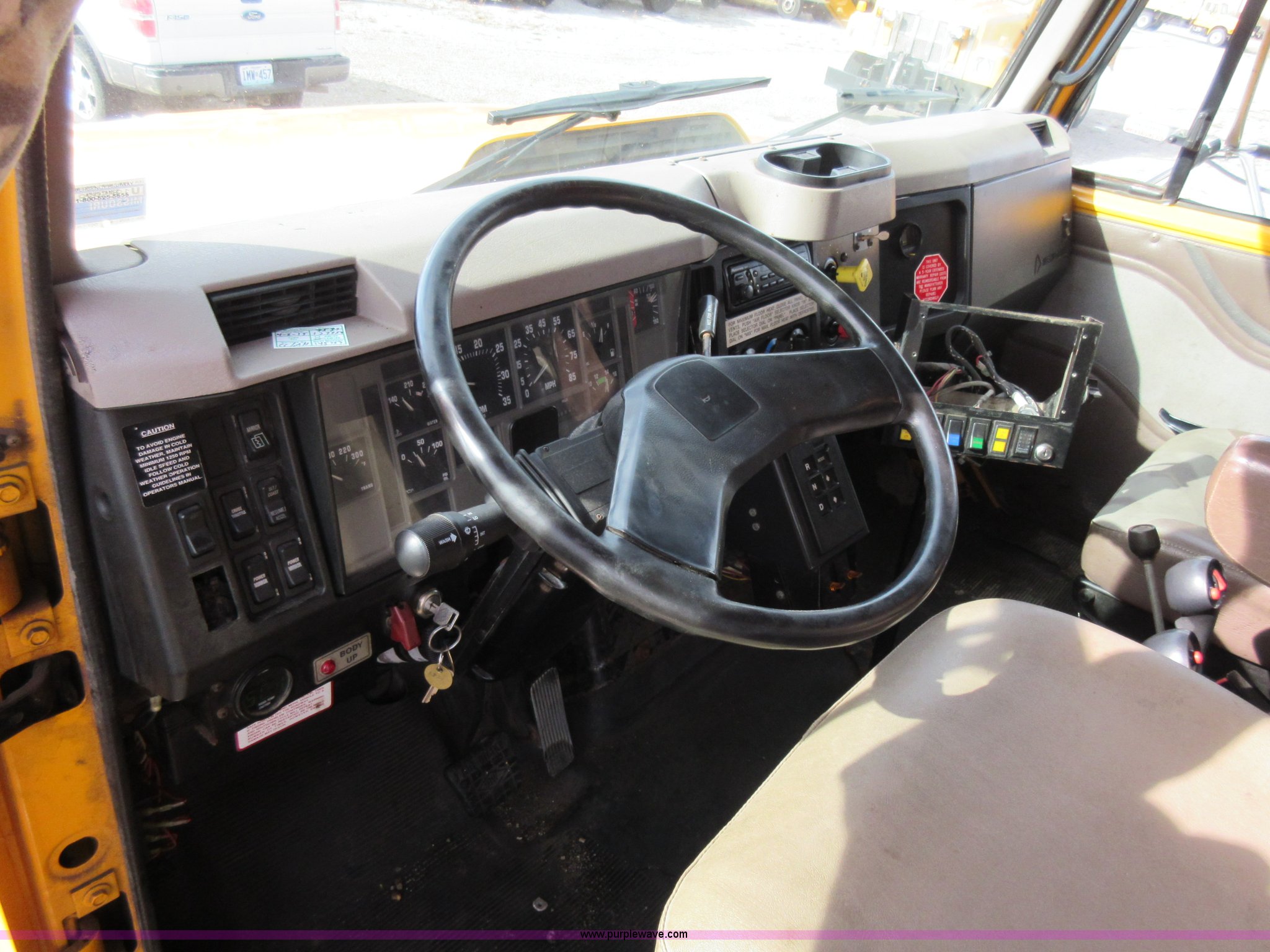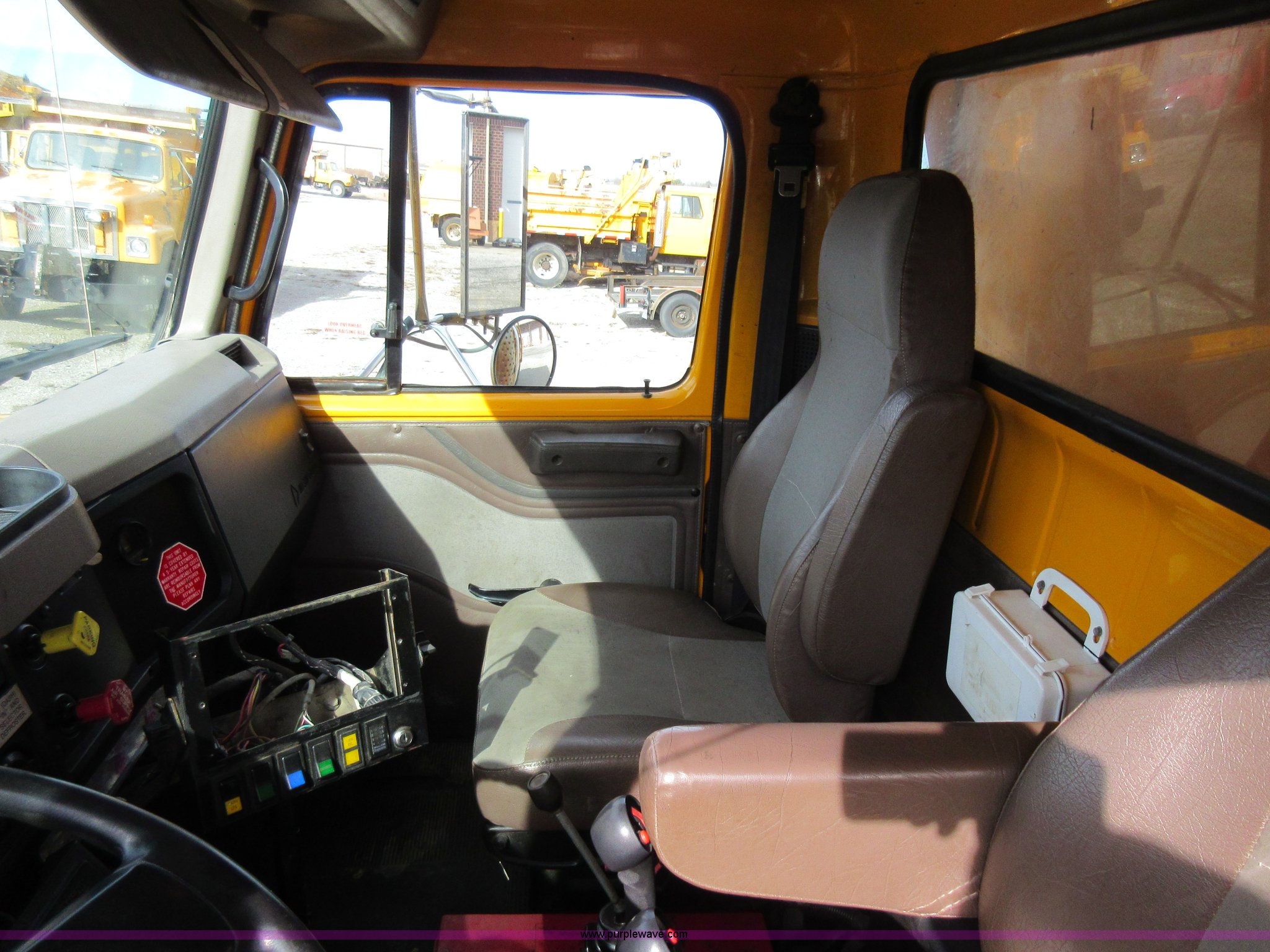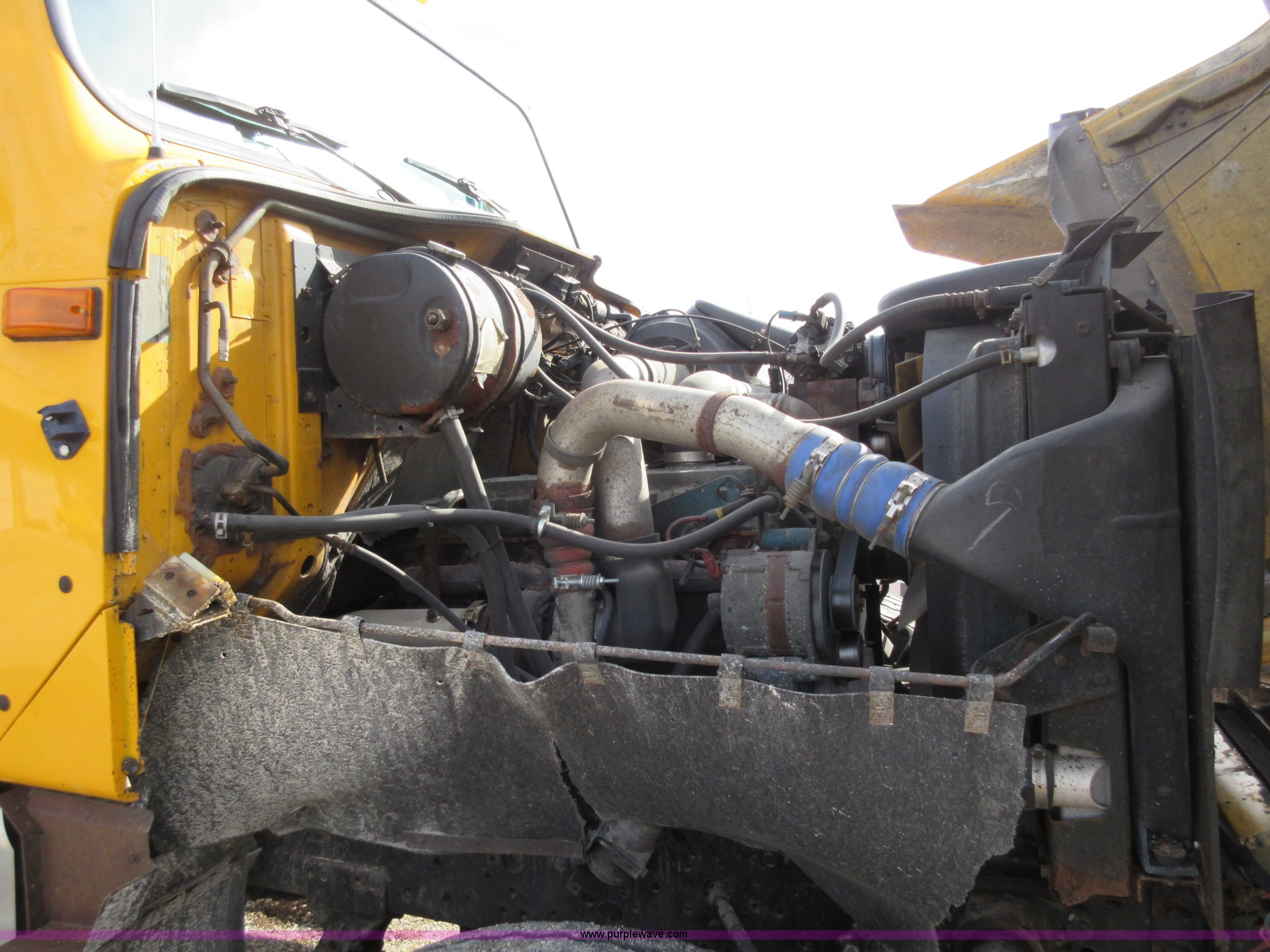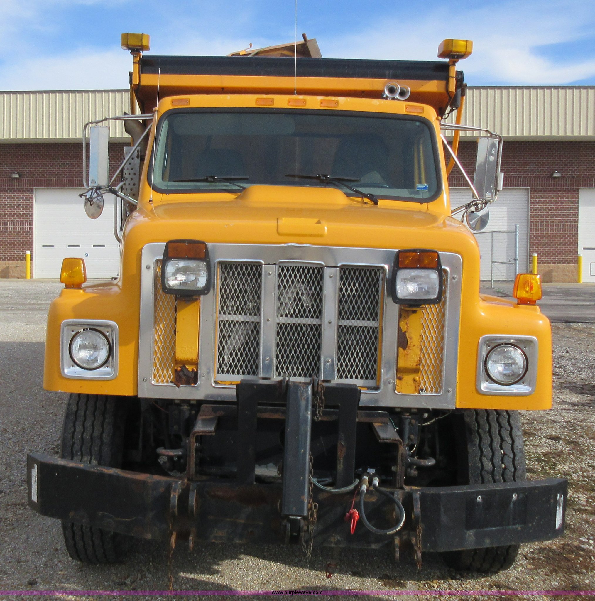 Purple Wave is selling a used Construction Dump Truck in Missouri. This item is a 2002 International F2554 dump truck with the following: 138,847 miles on odometer, 7,597 hours on meter, International DT530 8.7L L6 diesel engine, Automatic transmission, Heat, Cruise, AM/FM, Power windows, Heated mirrors, Air suspension seat, PTO, 16'L x 8'W dump bed, 36"H side boards, Western snow plow, Swensen stainless steel spreader, Hydraulic driven, Pintle hitch, Spring suspension, Air brakes, 216" wheelbase, 11R22.5 front tires, 315/80R22.5 rear tires, Hole in cab floor, CB is not included, Unit# 6827