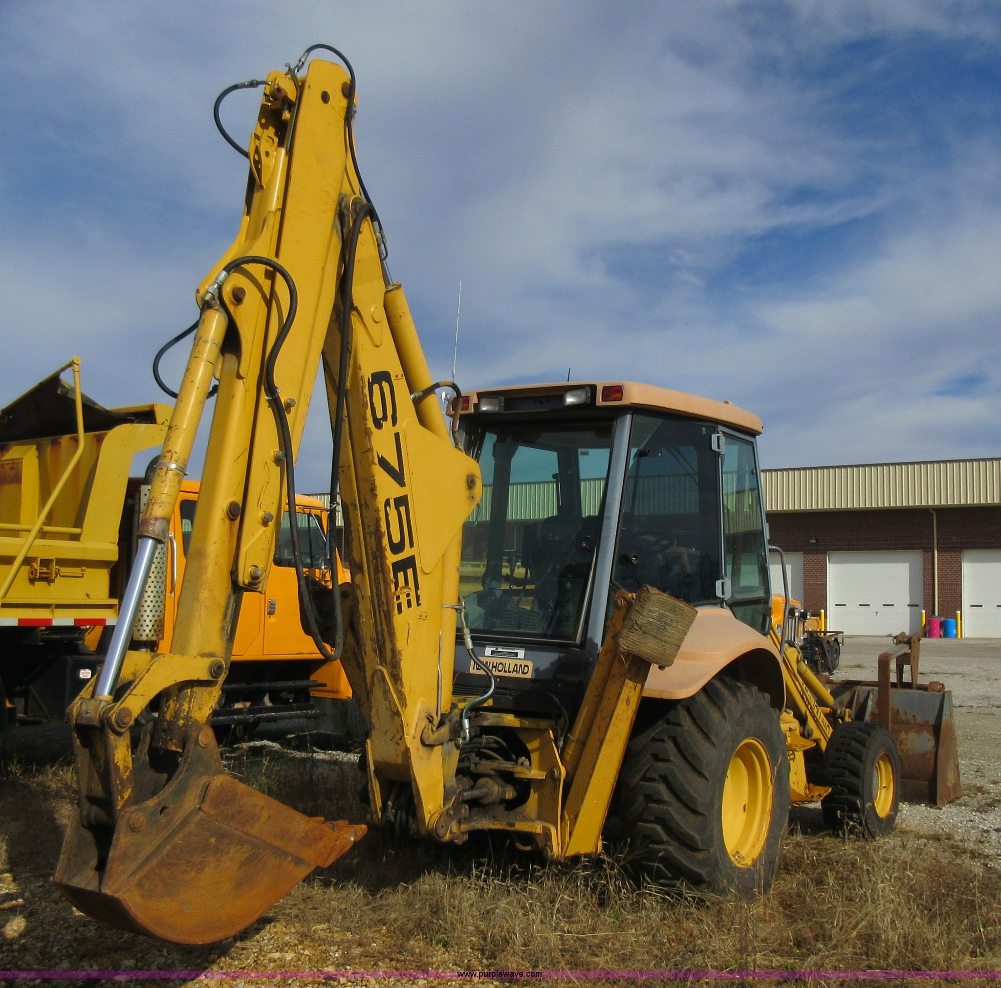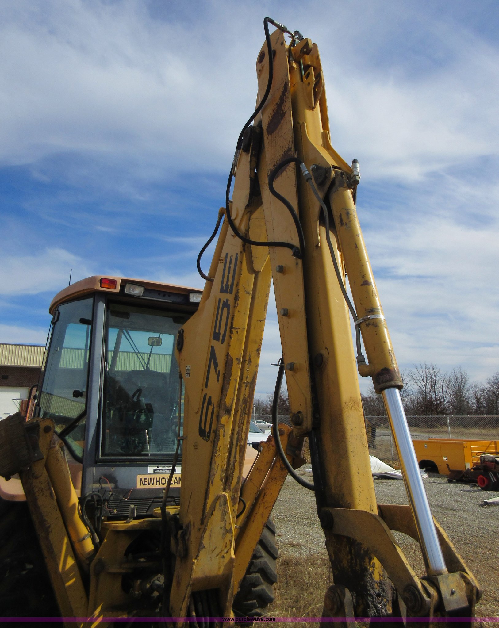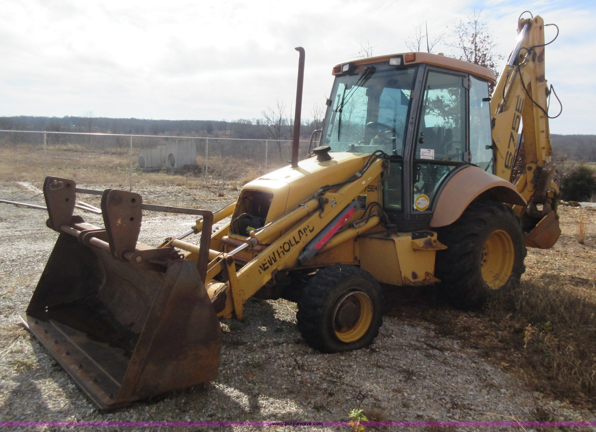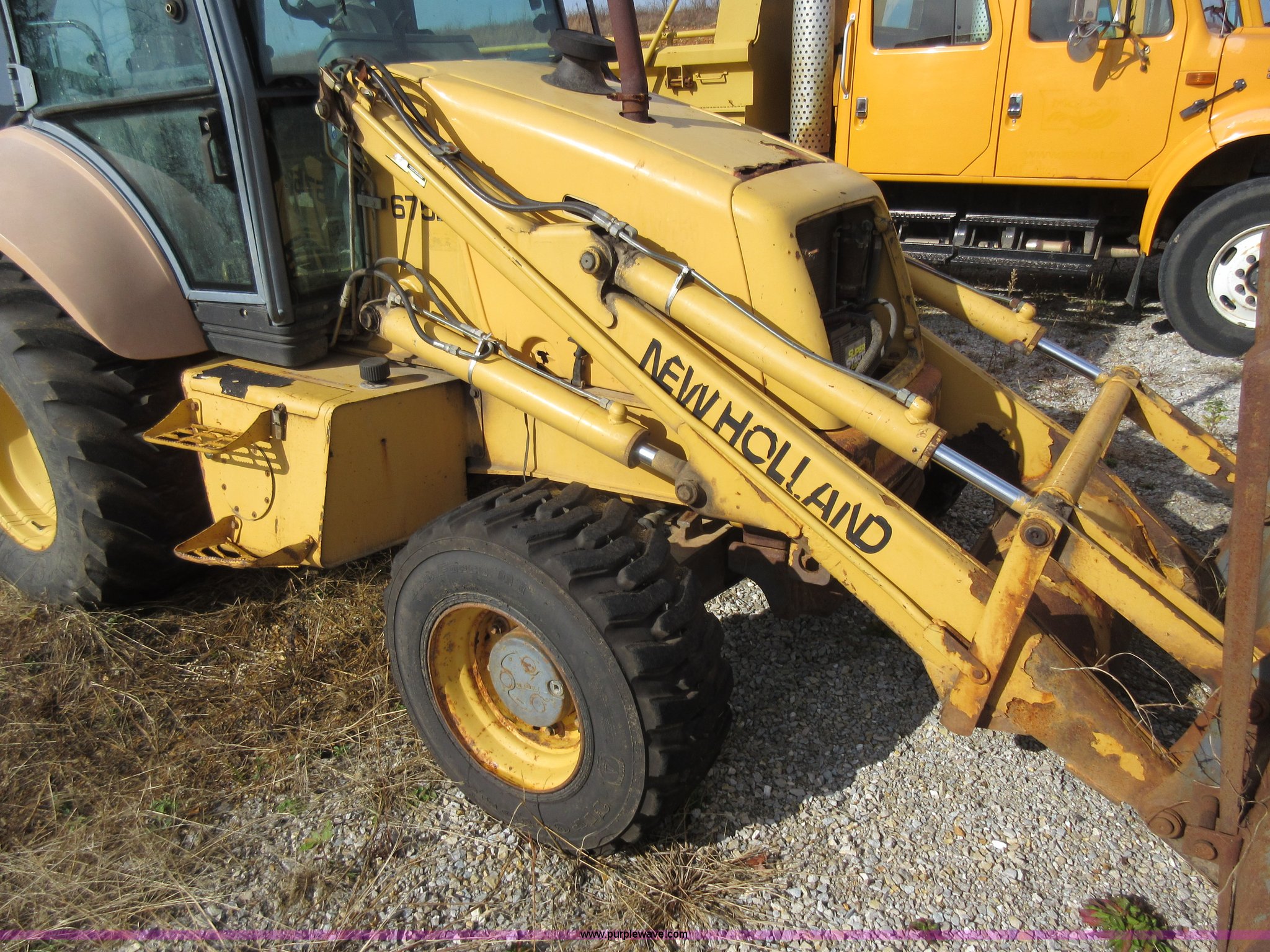 Purple Wave is selling a used Tractor Loader Backhoe in Missouri. This item is a 1999 New Holland 675E backhoe with the following: 3,904 hours on meter, Four cylinder diesel engine, Four speed transmission, Four wheel drive, EROPS, Heat, Joystick loader controls, Front and rear work lights, 88"W loader bucket, 17"W backhoe bucket, (4) teeth, 44"L x 3"W x 1.5"thick pallet forks, 12-16.5 front tires, 19.5-24 rear tires, 14,341 lbs. base operating weight, Flat tires, Serial 031021051, Unit# 05756