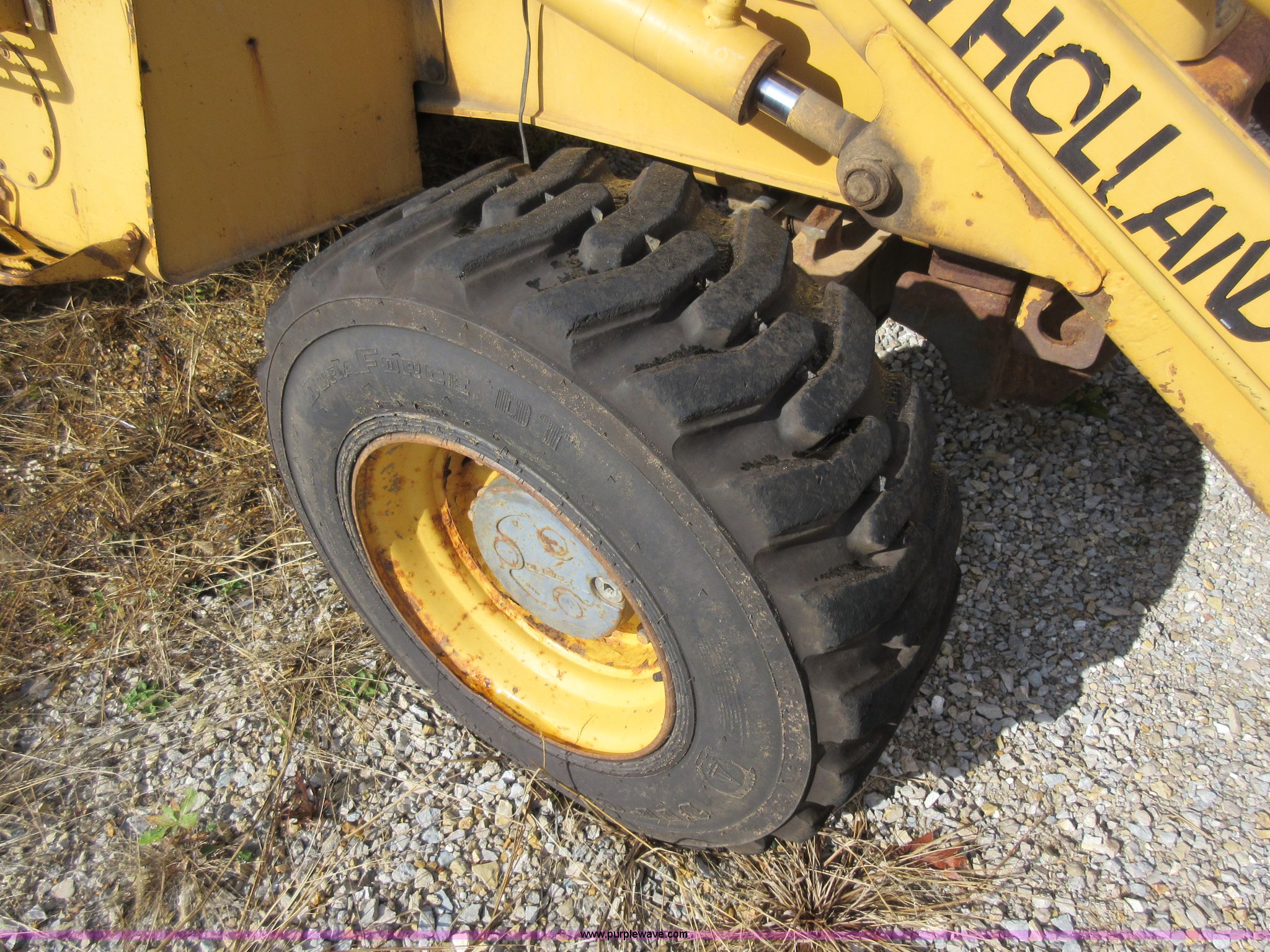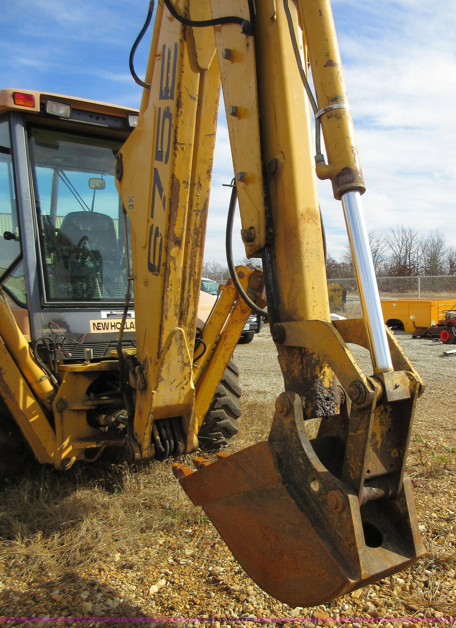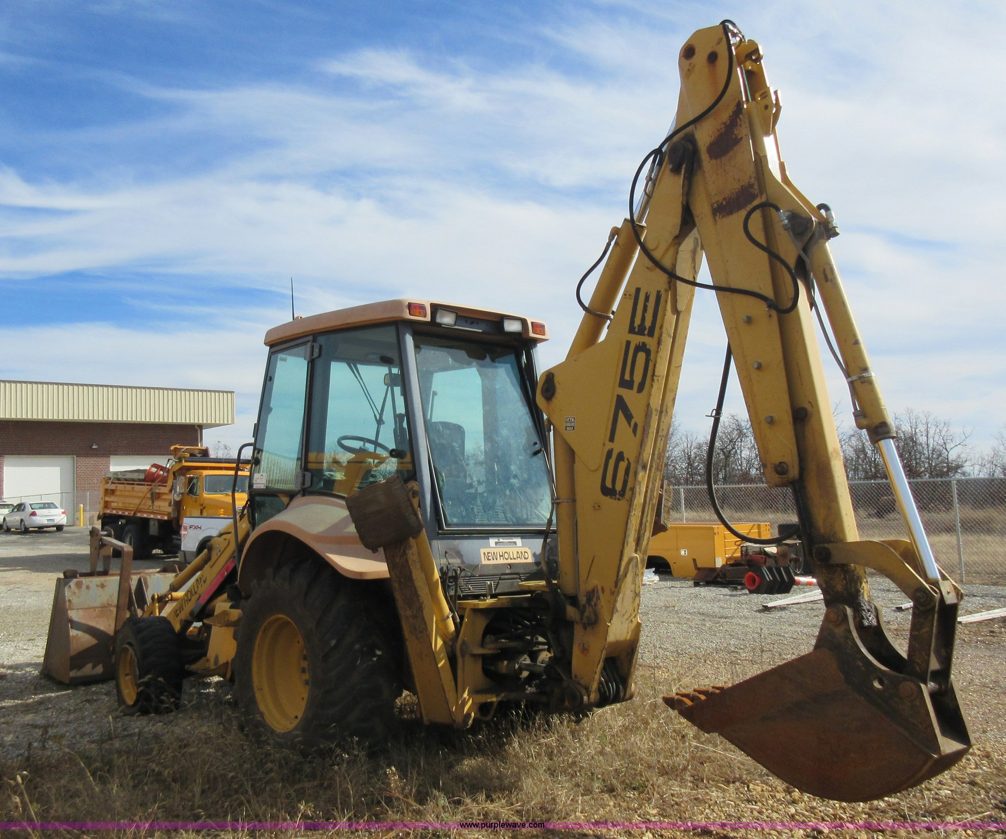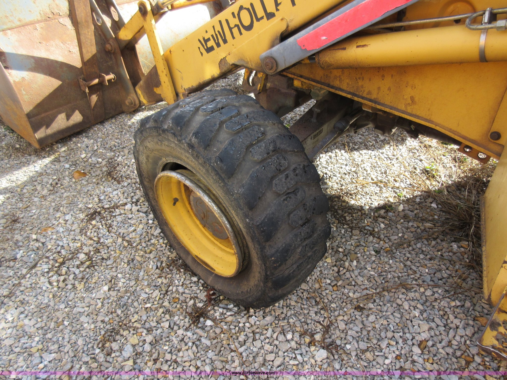 Purple Wave is selling a used Tractor Loader Backhoe in Missouri. This item is a 1999 New Holland 675E backhoe with the following: 3,904 hours on meter, Four cylinder diesel engine, Four speed transmission, Four wheel drive, EROPS, Heat, Joystick loader controls, Front and rear work lights, 88"W loader bucket, 17"W backhoe bucket, (4) teeth, 44"L x 3"W x 1.5"thick pallet forks, 12-16.5 front tires, 19.5-24 rear tires, 14,341 lbs. base operating weight, Flat tires, Serial 031021051, Unit# 05756