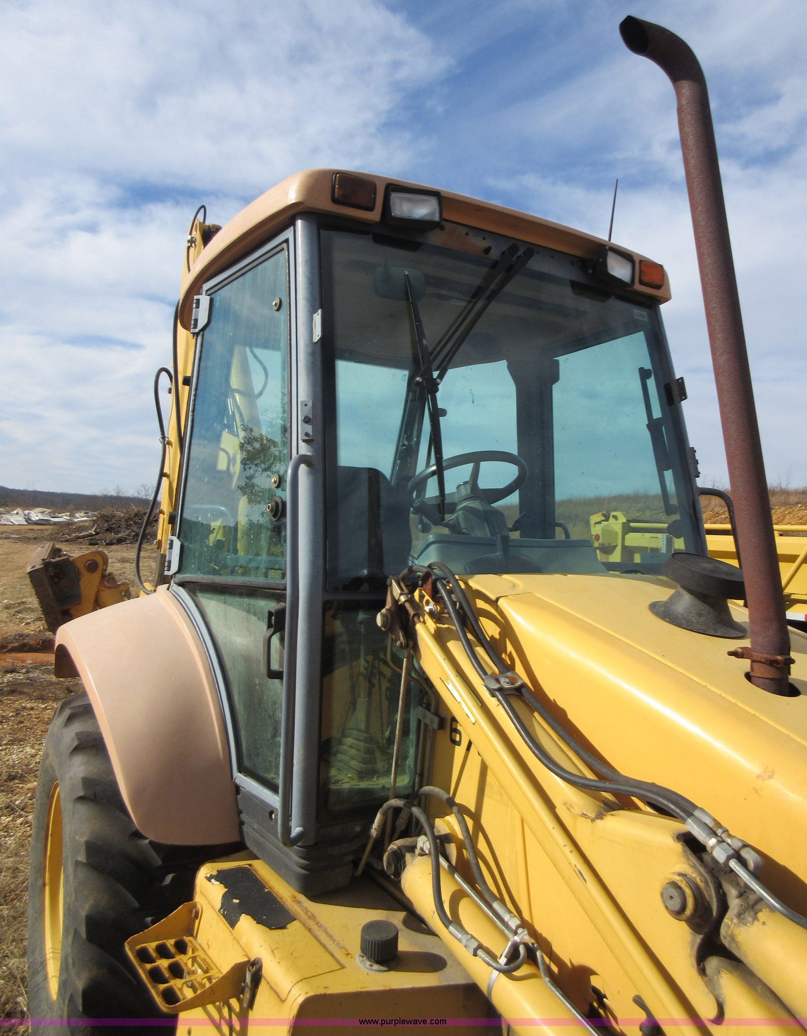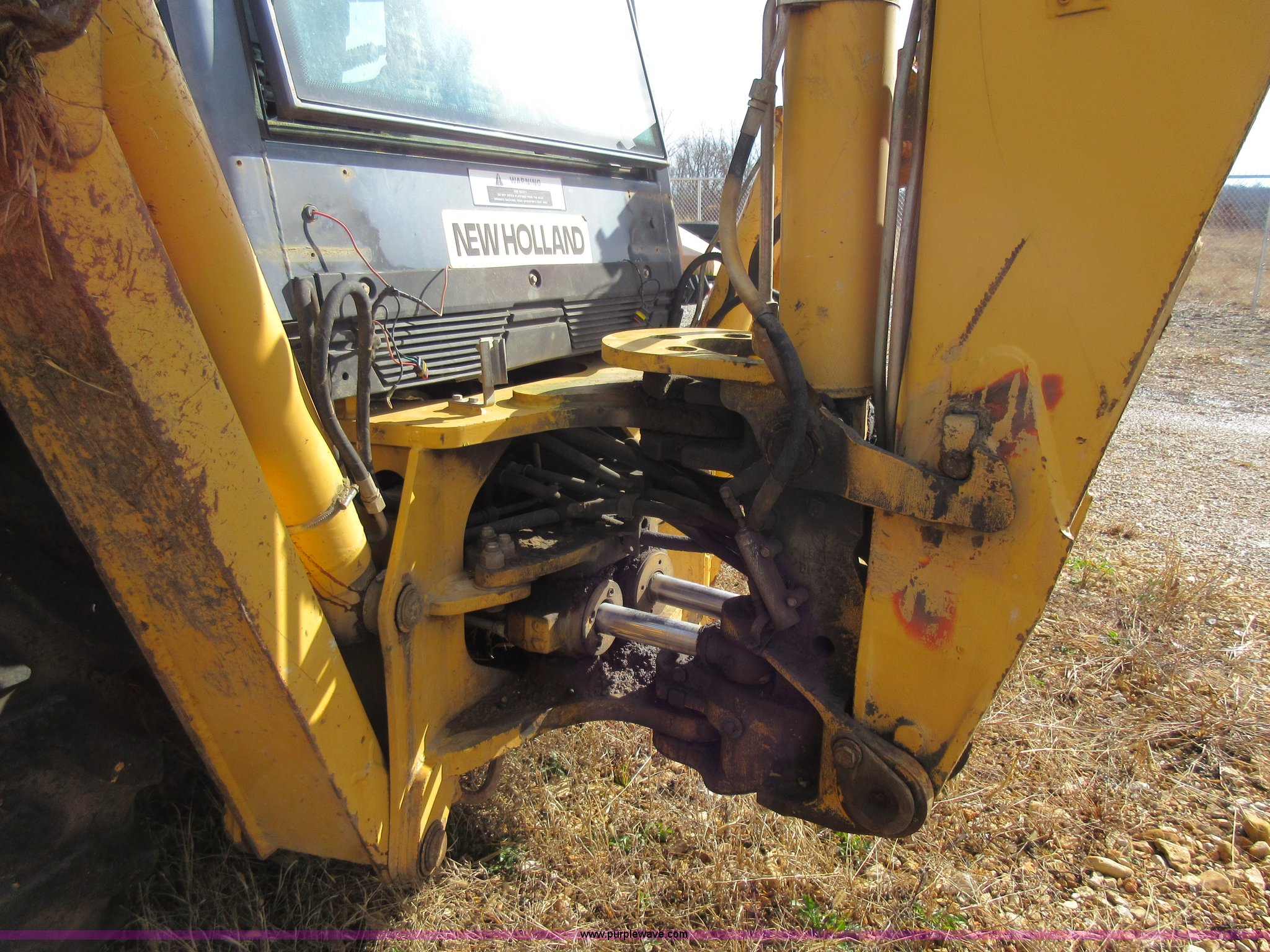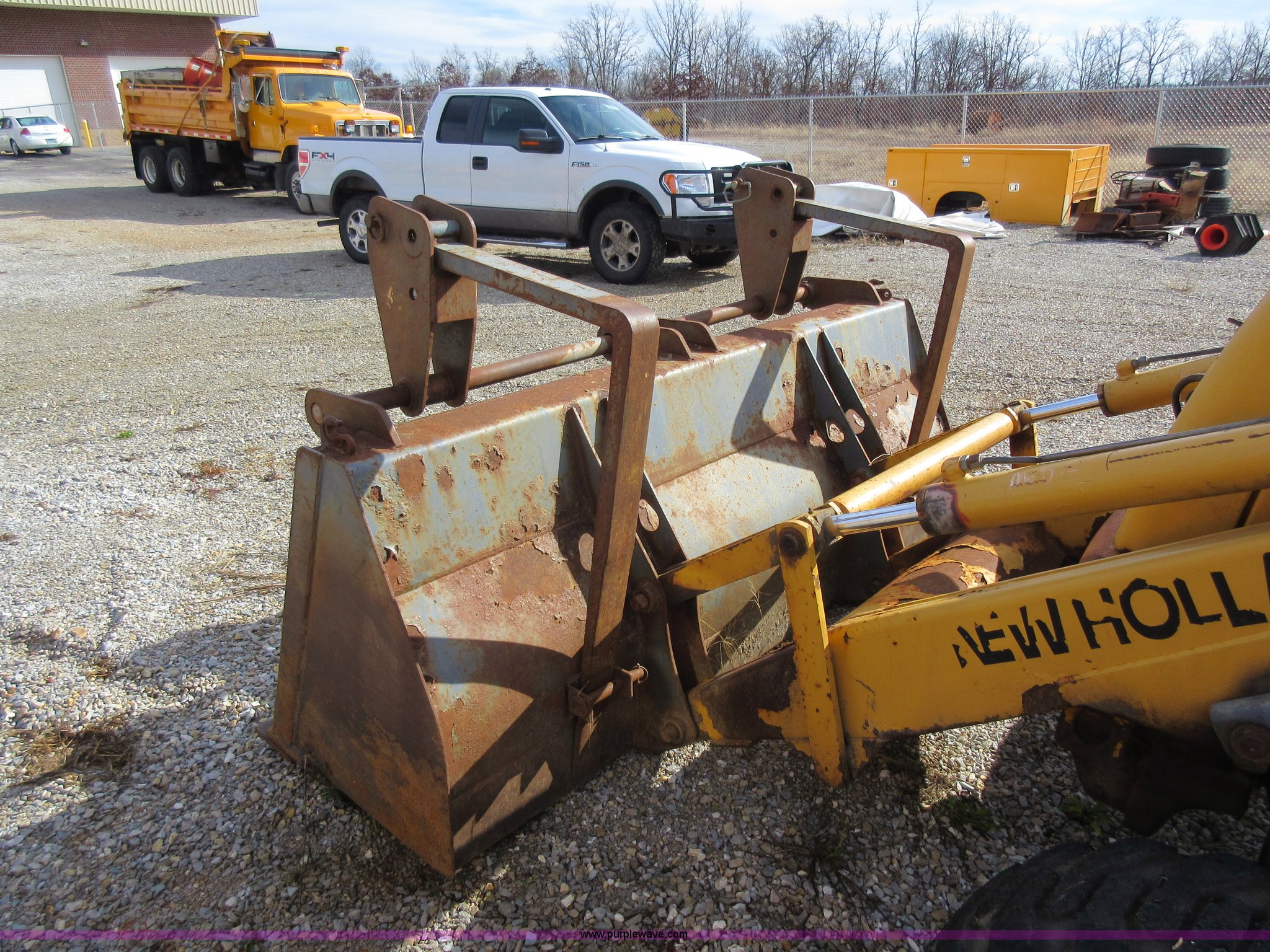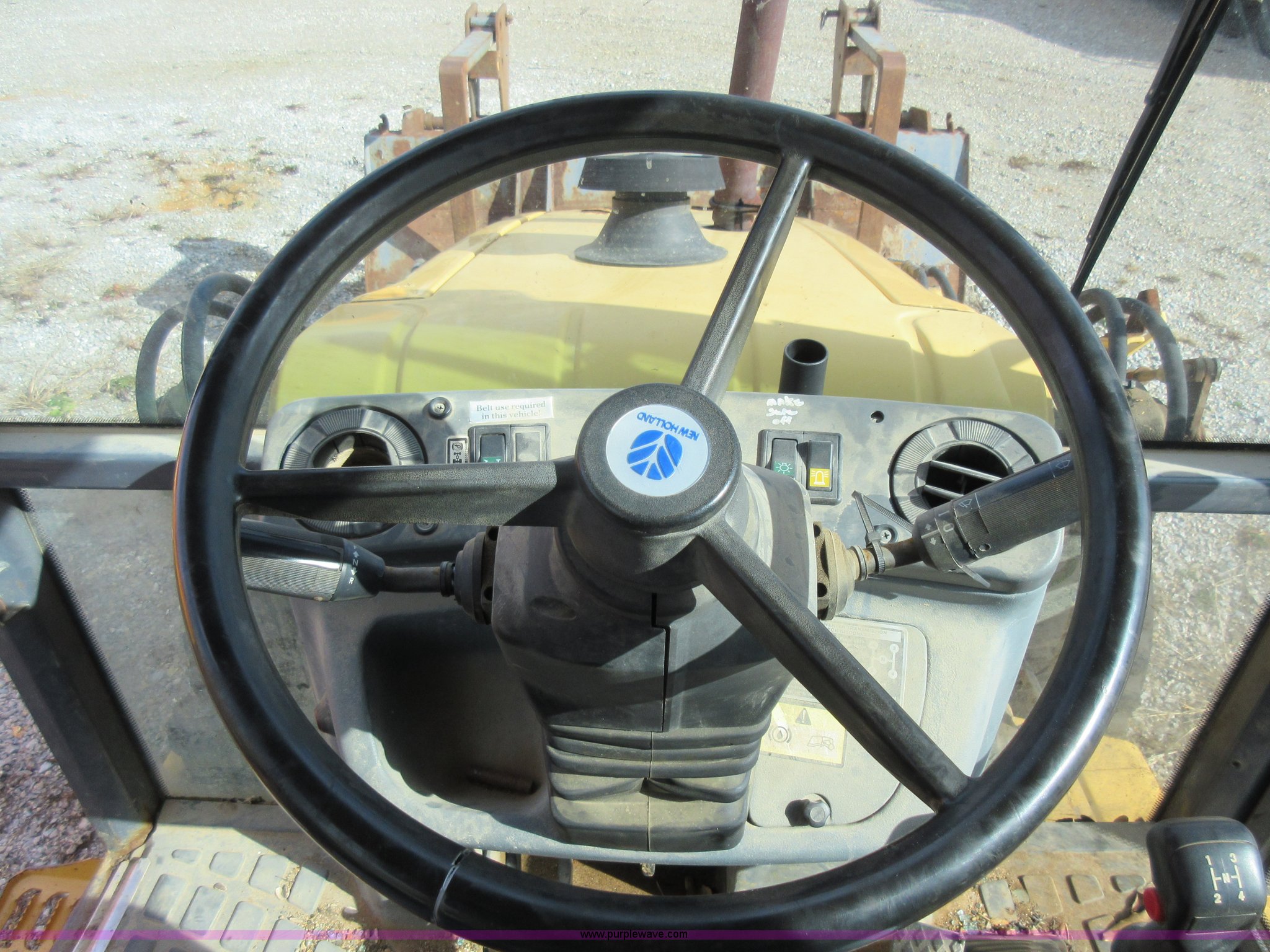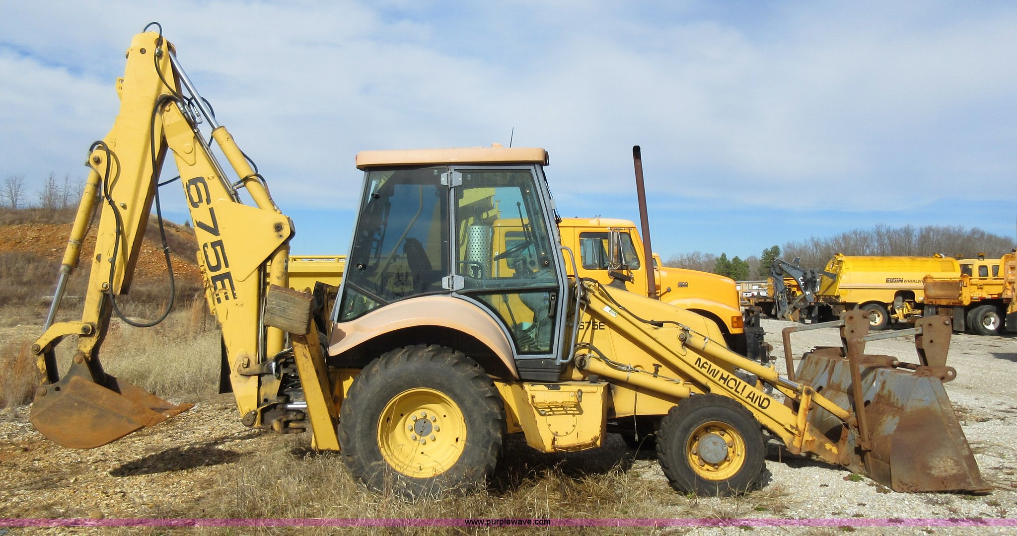 Purple Wave is selling a used Tractor Loader Backhoe in Missouri. This item is a 1999 New Holland 675E backhoe with the following: 3,904 hours on meter, Four cylinder diesel engine, Four speed transmission, Four wheel drive, EROPS, Heat, Joystick loader controls, Front and rear work lights, 88"W loader bucket, 17"W backhoe bucket, (4) teeth, 44"L x 3"W x 1.5"thick pallet forks, 12-16.5 front tires, 19.5-24 rear tires, 14,341 lbs. base operating weight, Flat tires, Serial 031021051, Unit# 05756
