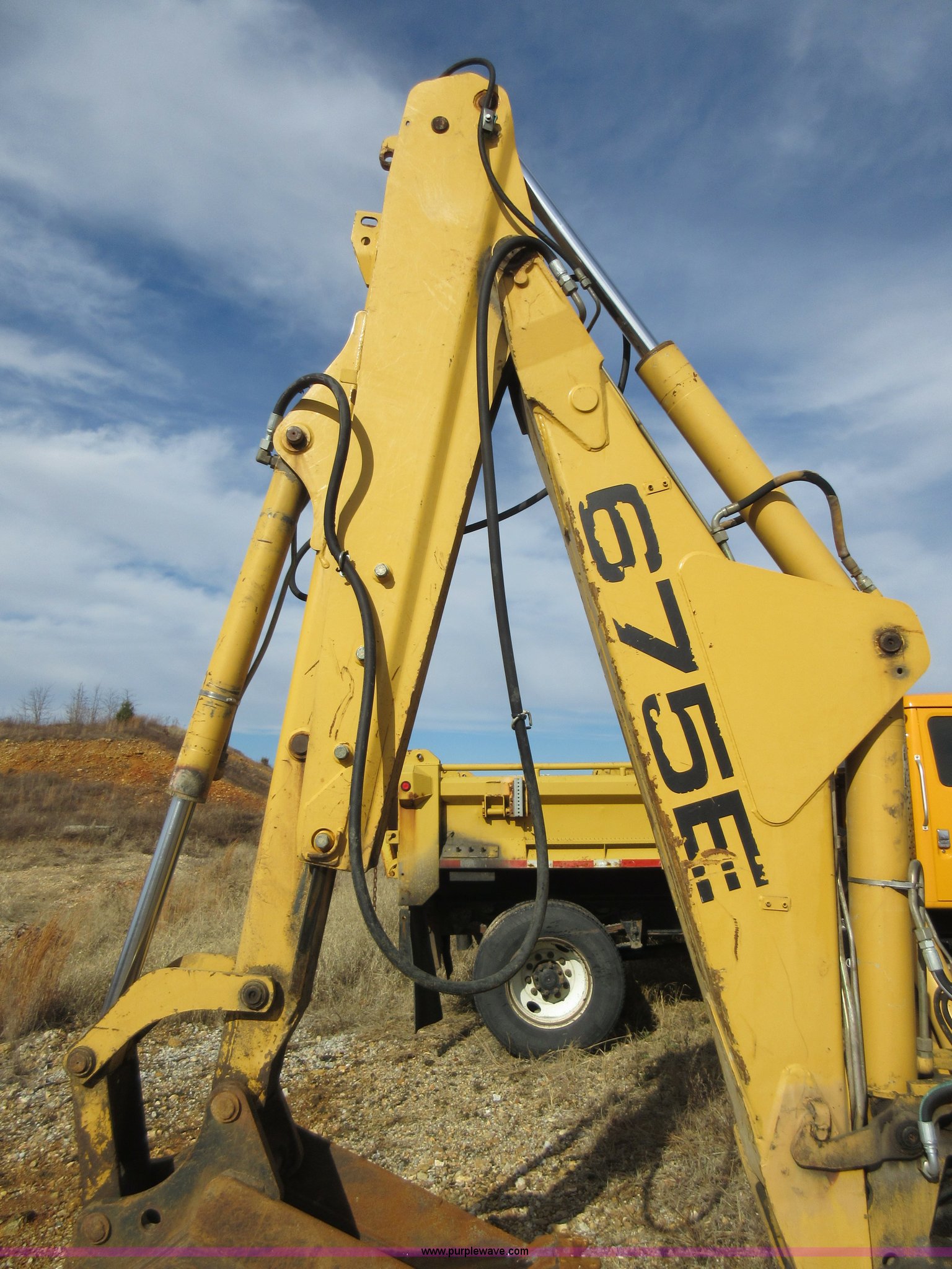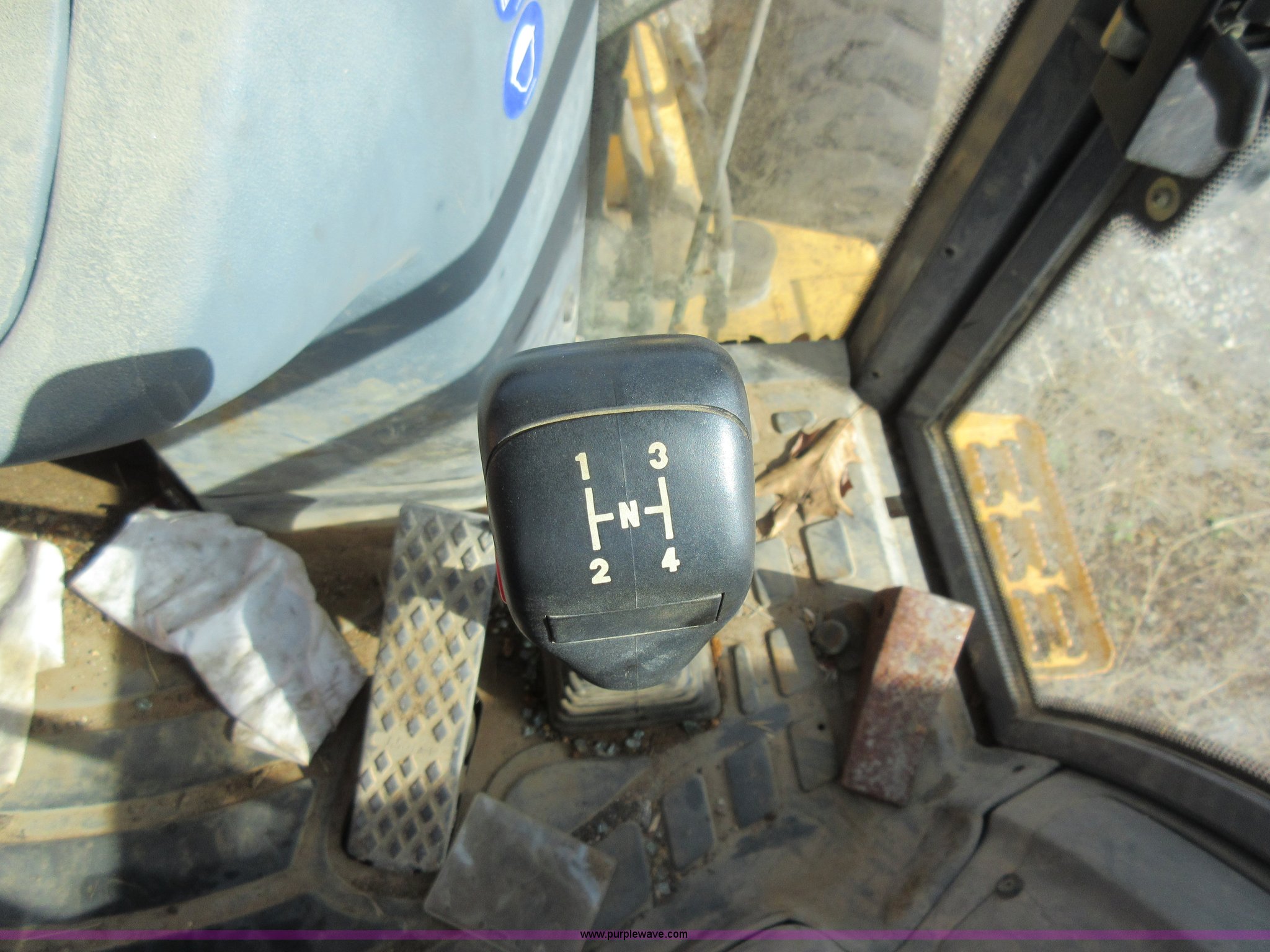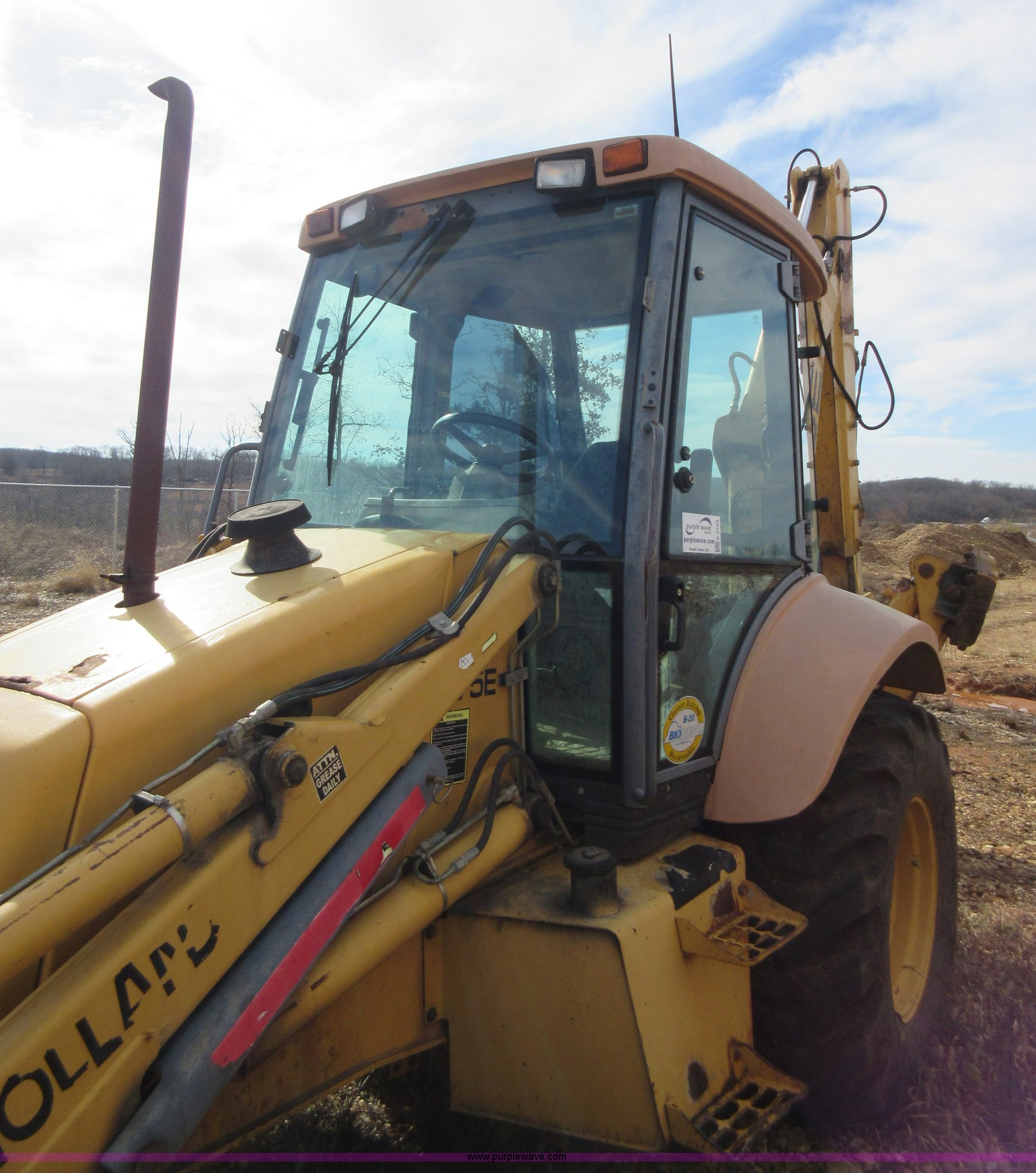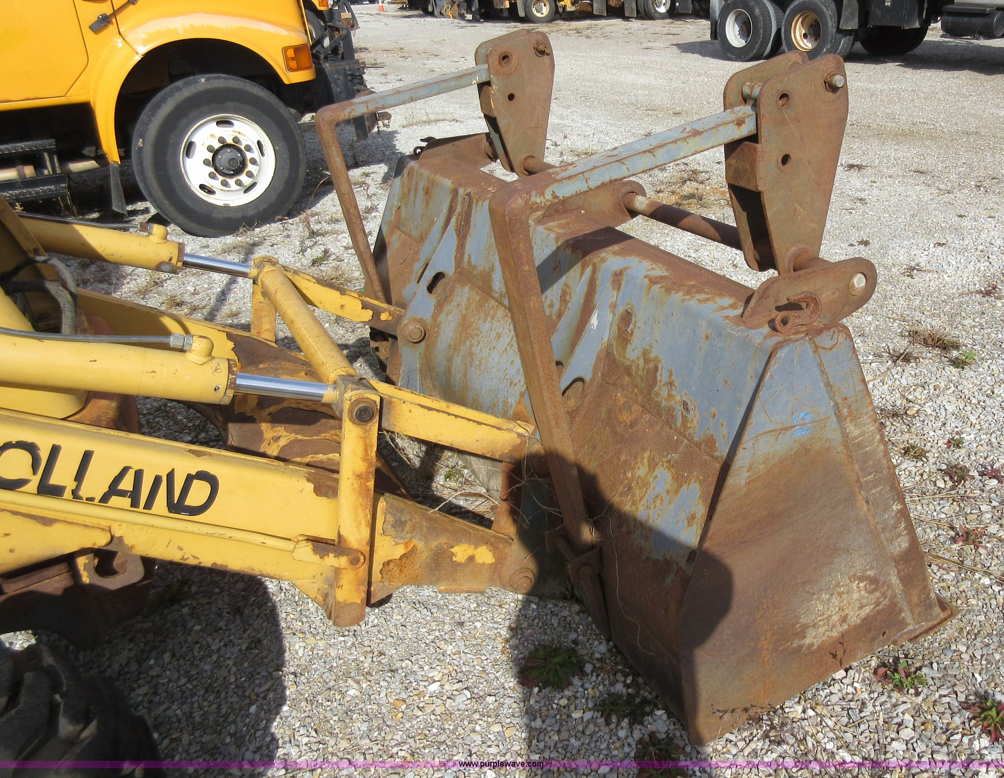 Purple Wave is selling a used Tractor Loader Backhoe in Missouri. This item is a 1999 New Holland 675E backhoe with the following: 3,904 hours on meter, Four cylinder diesel engine, Four speed transmission, Four wheel drive, EROPS, Heat, Joystick loader controls, Front and rear work lights, 88"W loader bucket, 17"W backhoe bucket, (4) teeth, 44"L x 3"W x 1.5"thick pallet forks, 12-16.5 front tires, 19.5-24 rear tires, 14,341 lbs. base operating weight, Flat tires, Serial 031021051, Unit# 05756