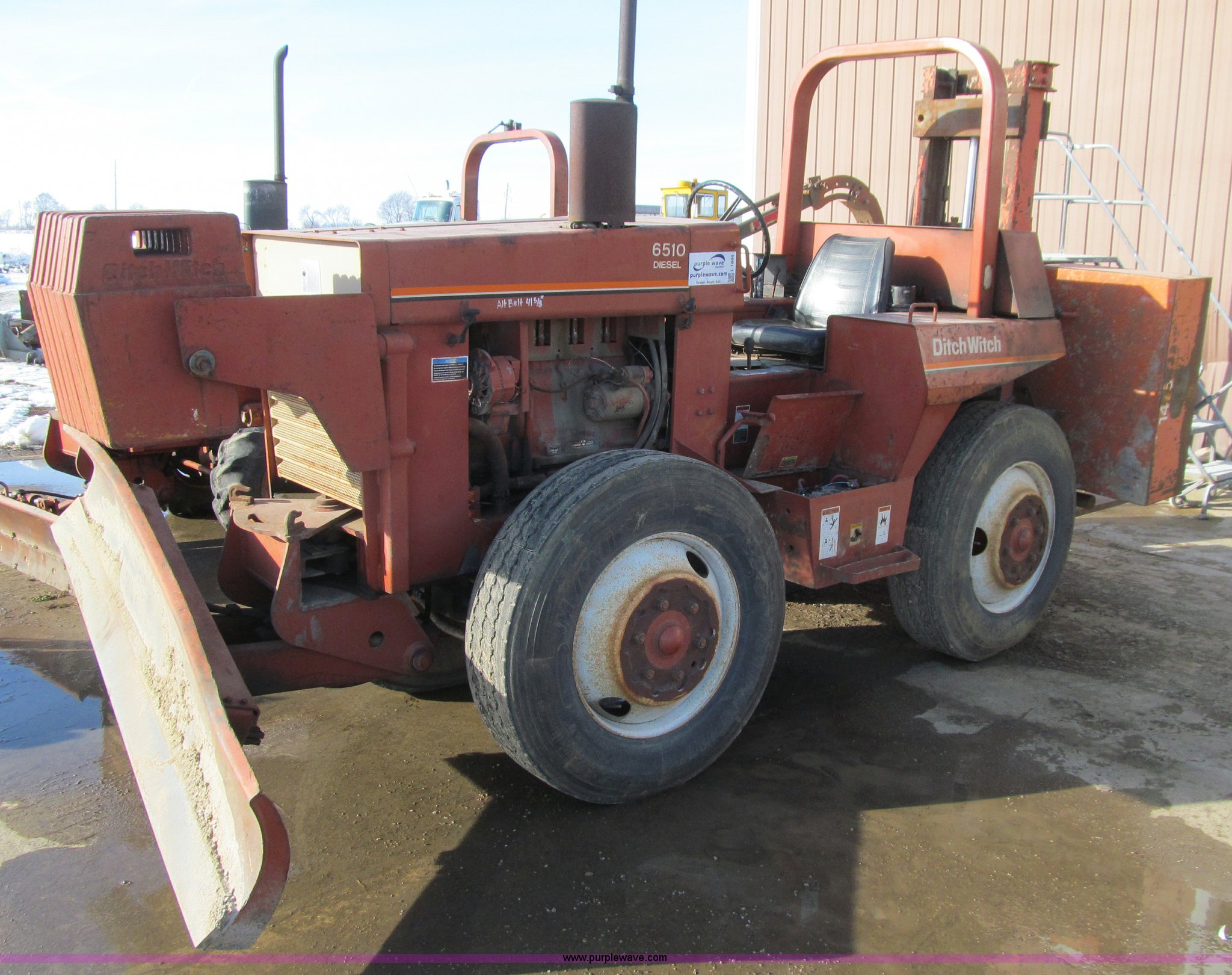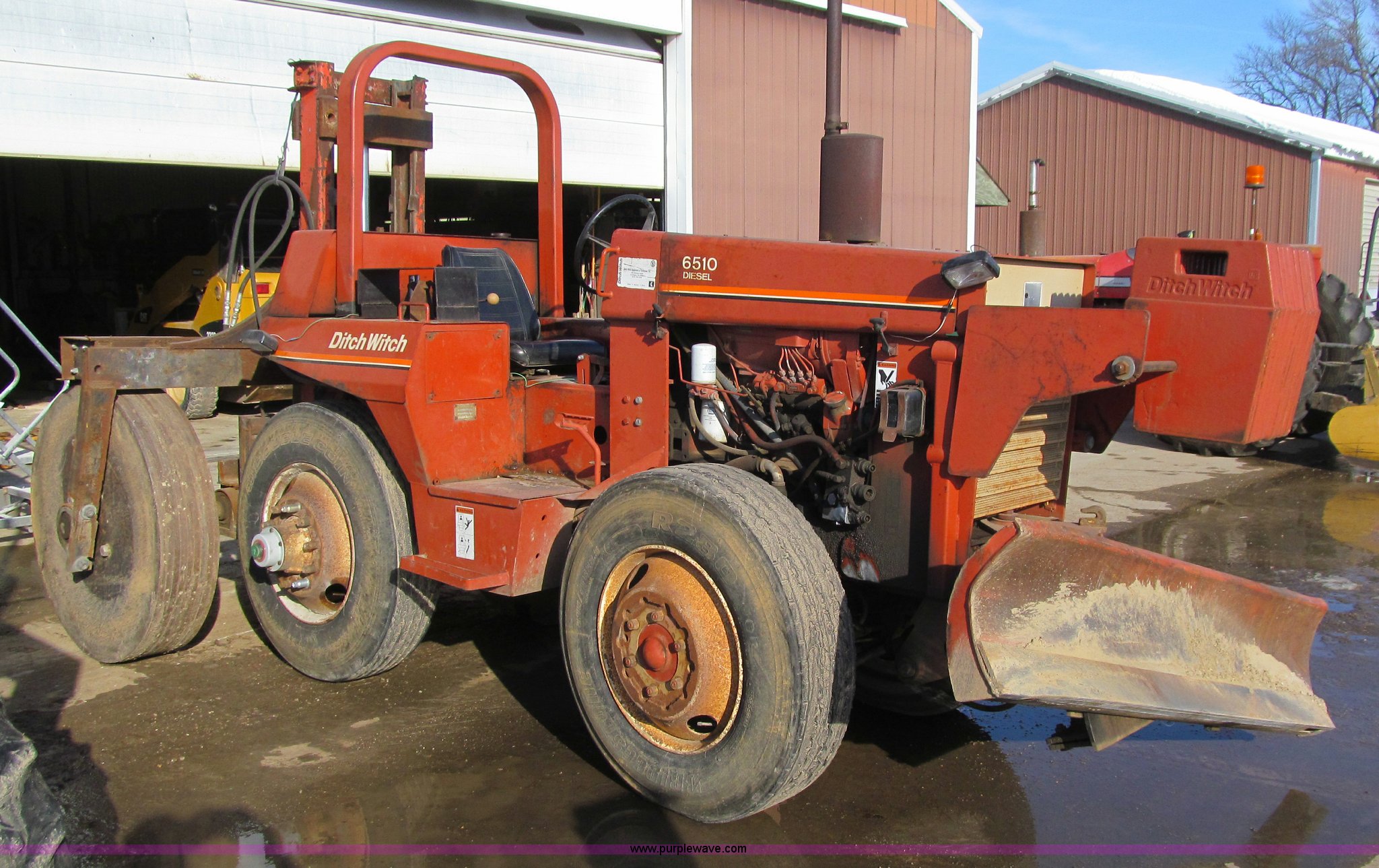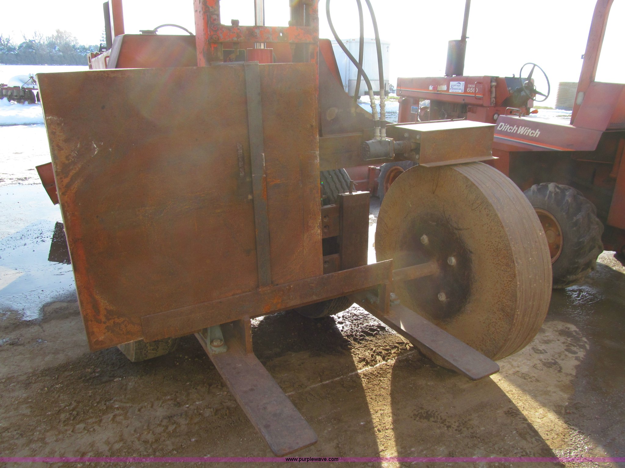 Purple Wave is selling a used Trencher or Rock Saw in Iowa. This item is a 1984 Ditch Witch 6510 trencher with the following: Deutz F4L912 four cylinder diesel engine, 72.5 HP, Manual transmission, 4F-1R gears, Creep control, OROPS, Front weights, 72"W six way back fill blade, Vibratory trench compaction wheel, 9"W x 42" diameter, Rear forklift attachment, Counter weights, 295/75R22.5 tires, Serial 655330