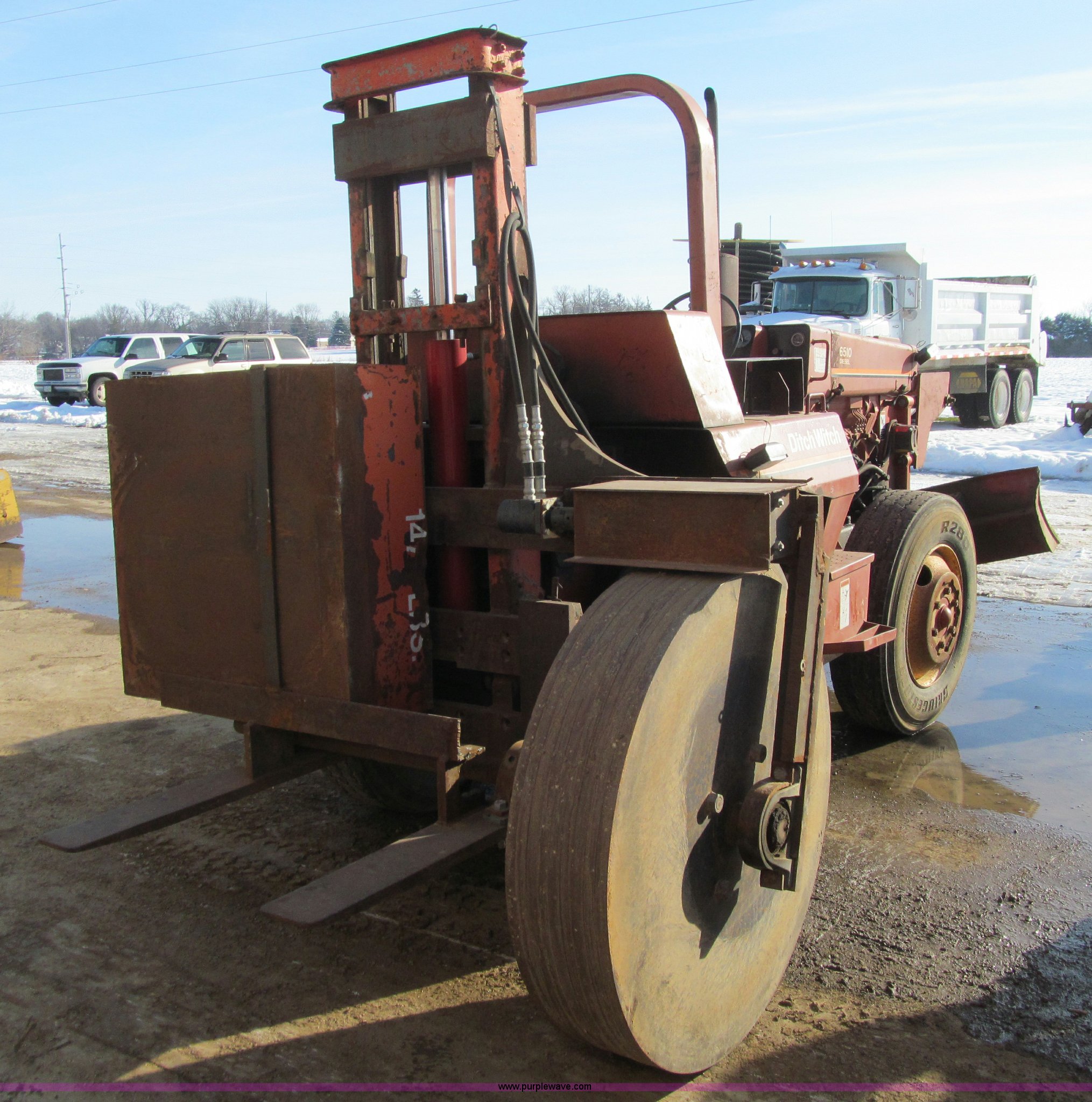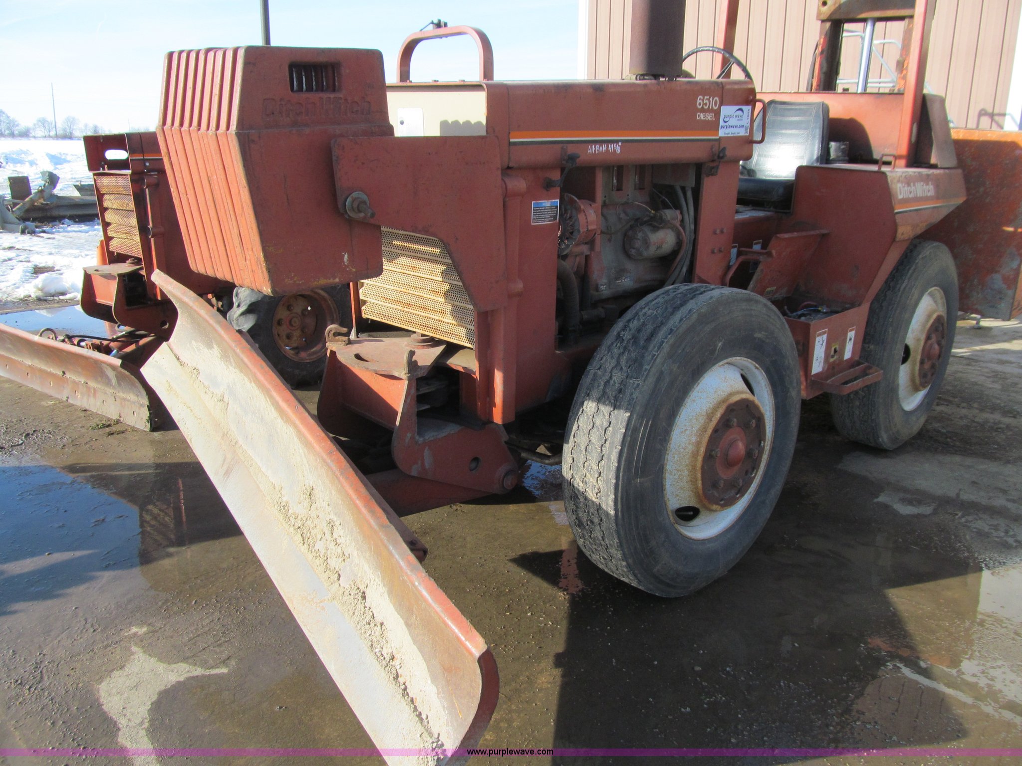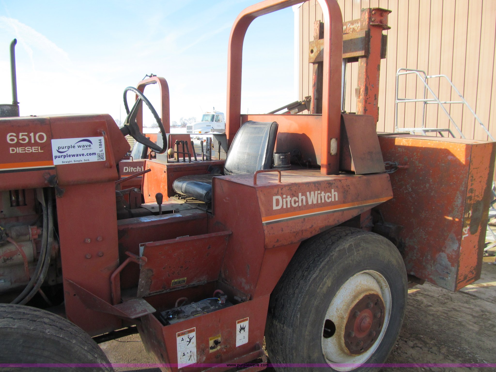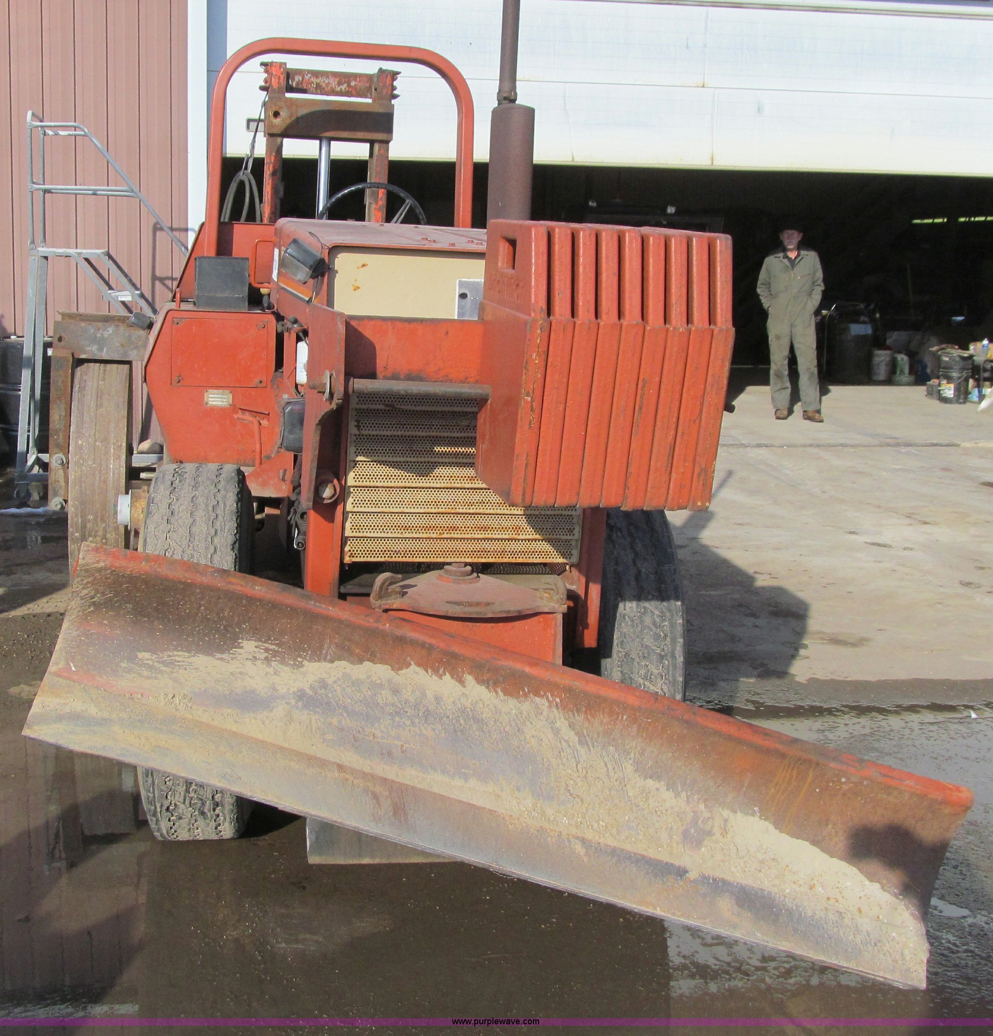 Purple Wave is selling a used Trencher or Rock Saw in Iowa. This item is a 1984 Ditch Witch 6510 trencher with the following: Deutz F4L912 four cylinder diesel engine, 72.5 HP, Manual transmission, 4F-1R gears, Creep control, OROPS, Front weights, 72"W six way back fill blade, Vibratory trench compaction wheel, 9"W x 42" diameter, Rear forklift attachment, Counter weights, 295/75R22.5 tires, Serial 655330