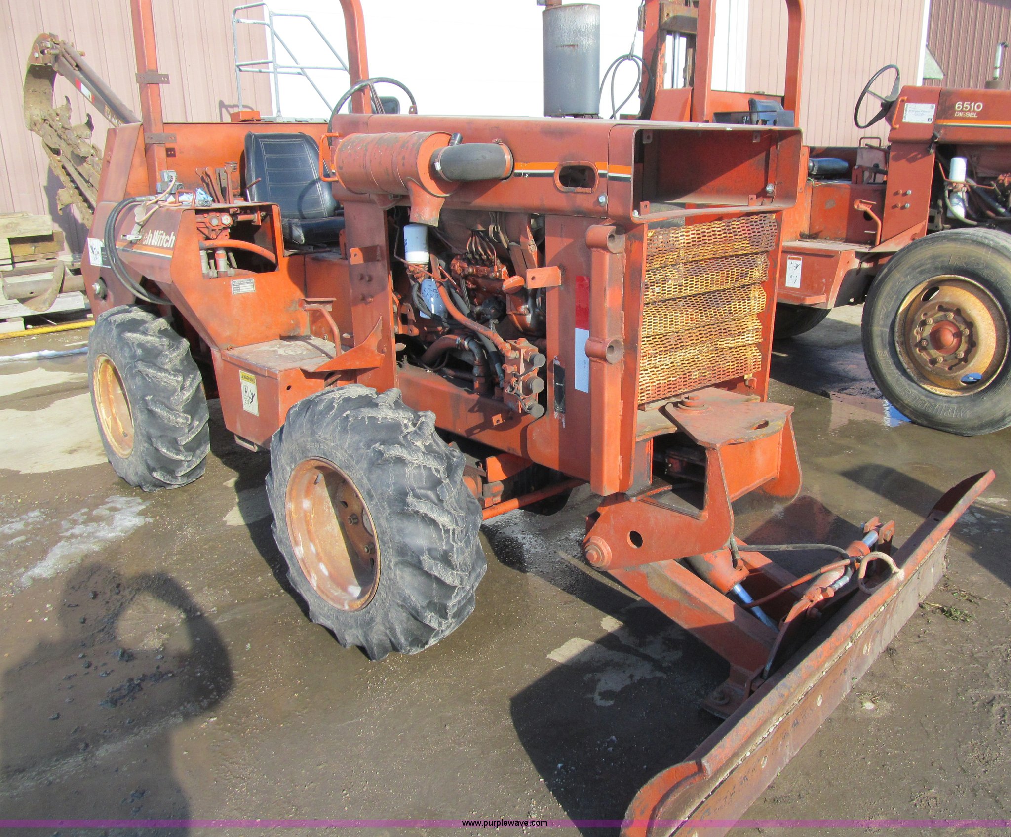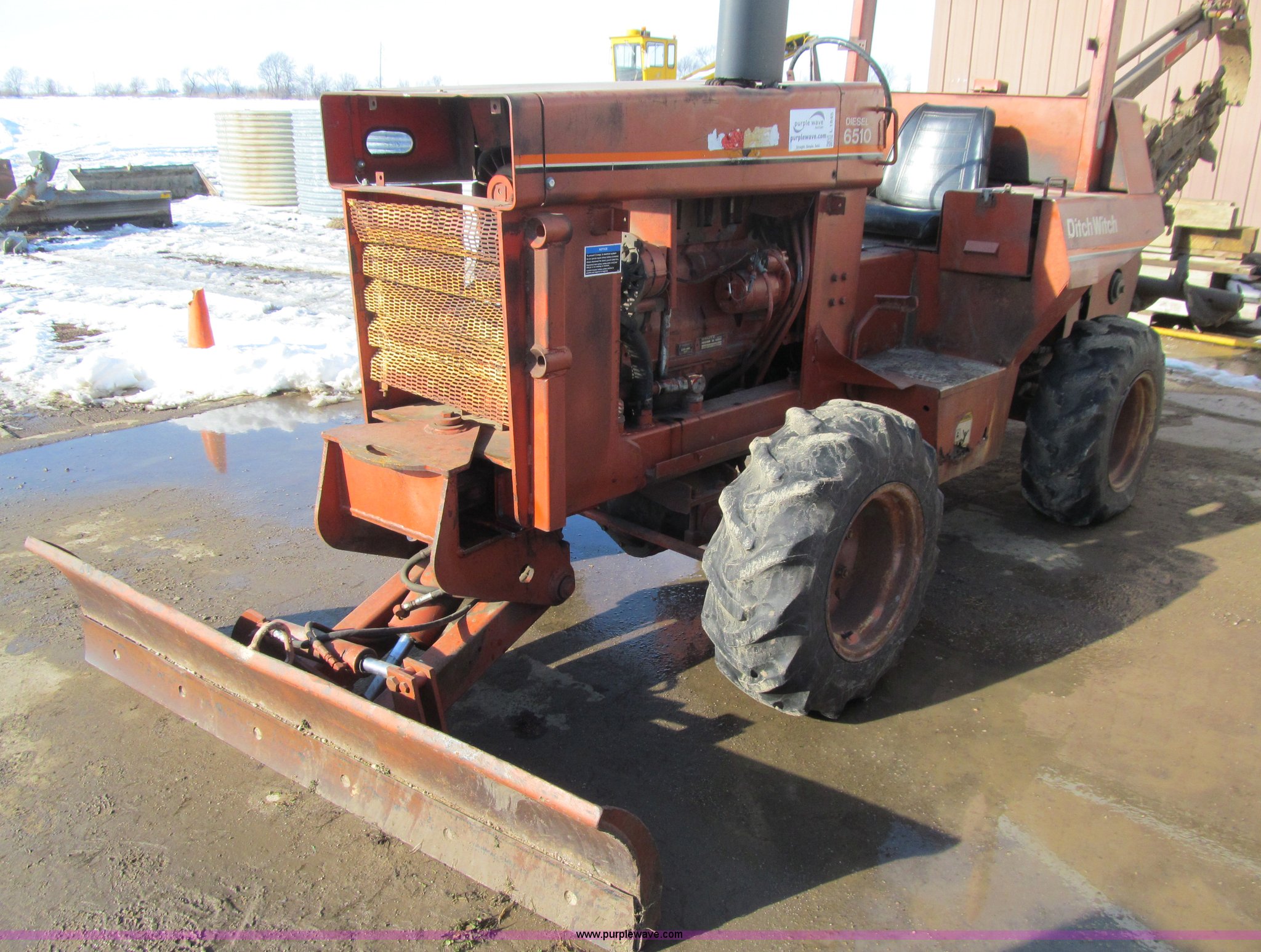 Purple Wave is selling a used Trencher or Rock Saw in Iowa. This item is a 1984 Ditch Witch 6510 trencher with the following: 87 hours on meter, Deutz F4L912 four cylinder diesel engine, 72.5 HP, Manual transmission, 4F-1R gears, Creep control, Four wheel drive, OROPS, 72"W six way back fill blade, A610 trencher, 6" trench width, Crumber shoe, Serial 628272, 9.5-16 tires, Serial 654166
