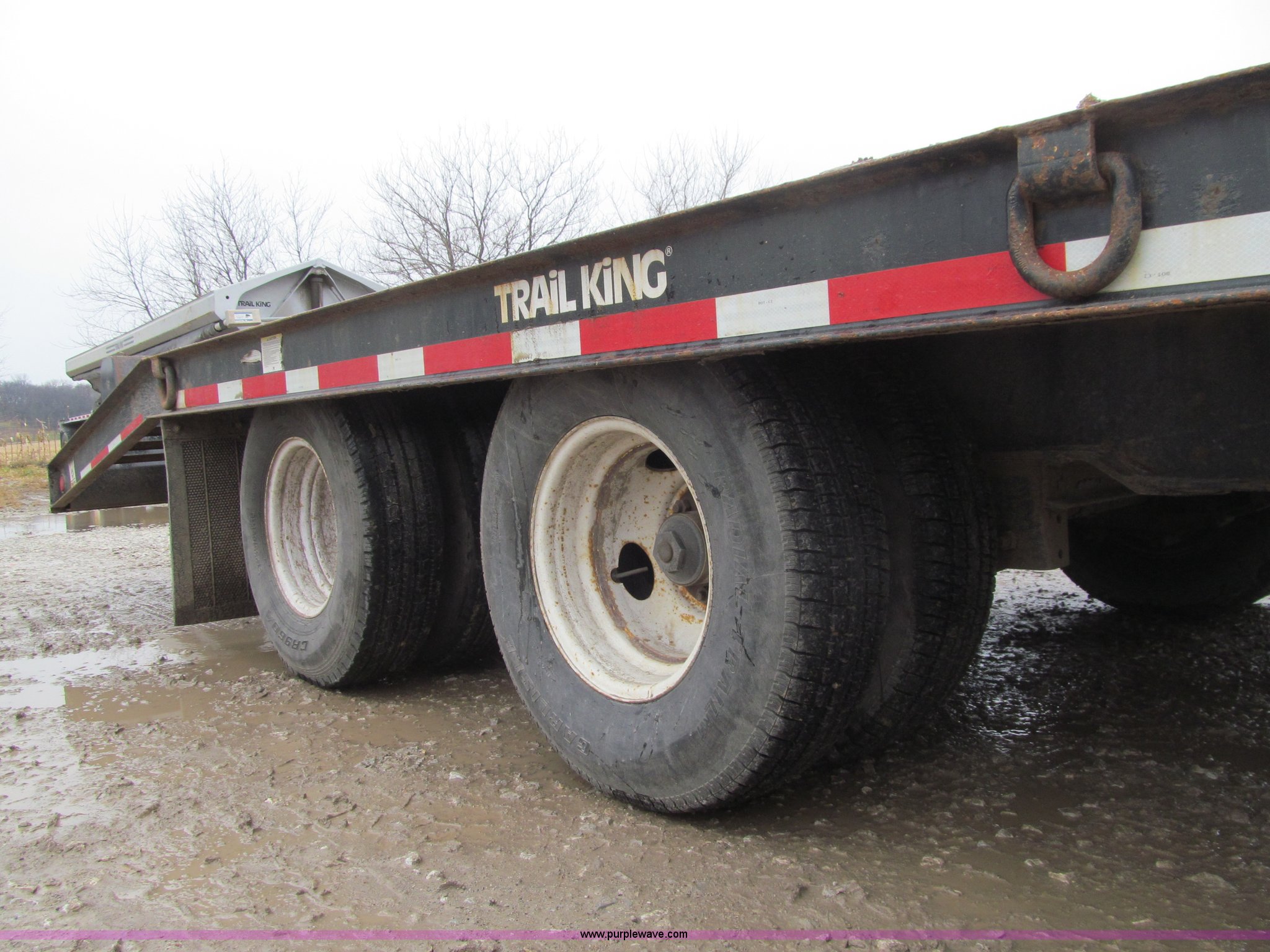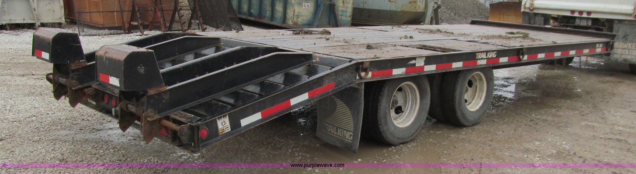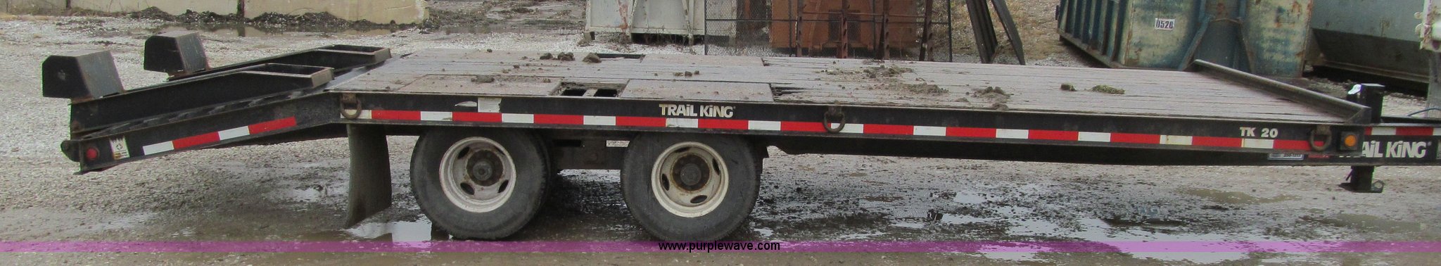 Purple Wave is selling a used Equip. Trailer in Iowa. This item is a 2008 Trail King TK-20LP-2400 equipment trailer with the following: 19'L x 102"W deck, 5'L x 102"W beaver tail, 5'L x 19"W ramps, Tool storage, (4) tie downs per side, Tongue mounted jack stand, Safety chains, Adjustable height pintle hitch, Electric brakes, Tandem axle, ST235/85R16 tires, GVWR 25,950 lbs, GAWR 10,000 lbs per axle
