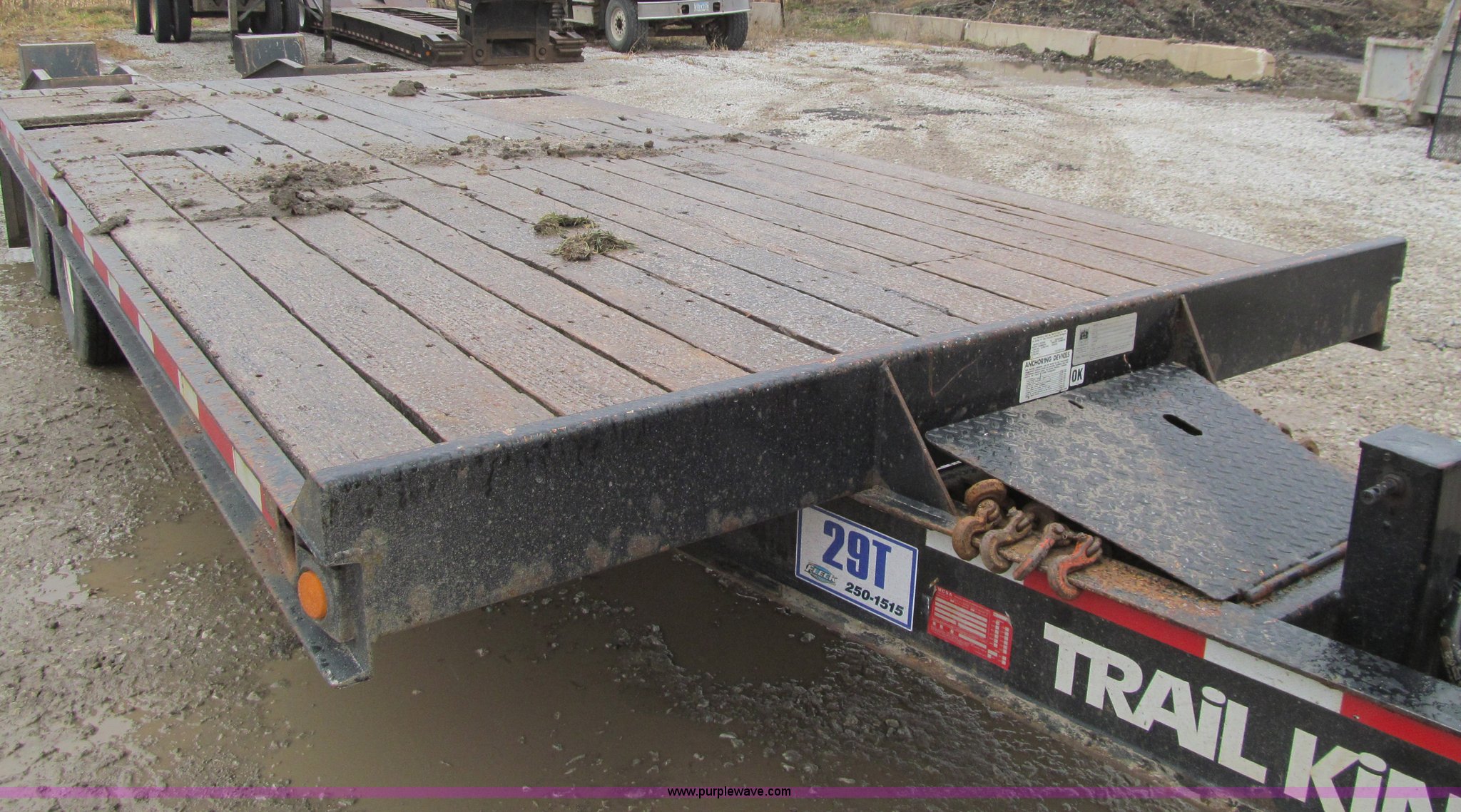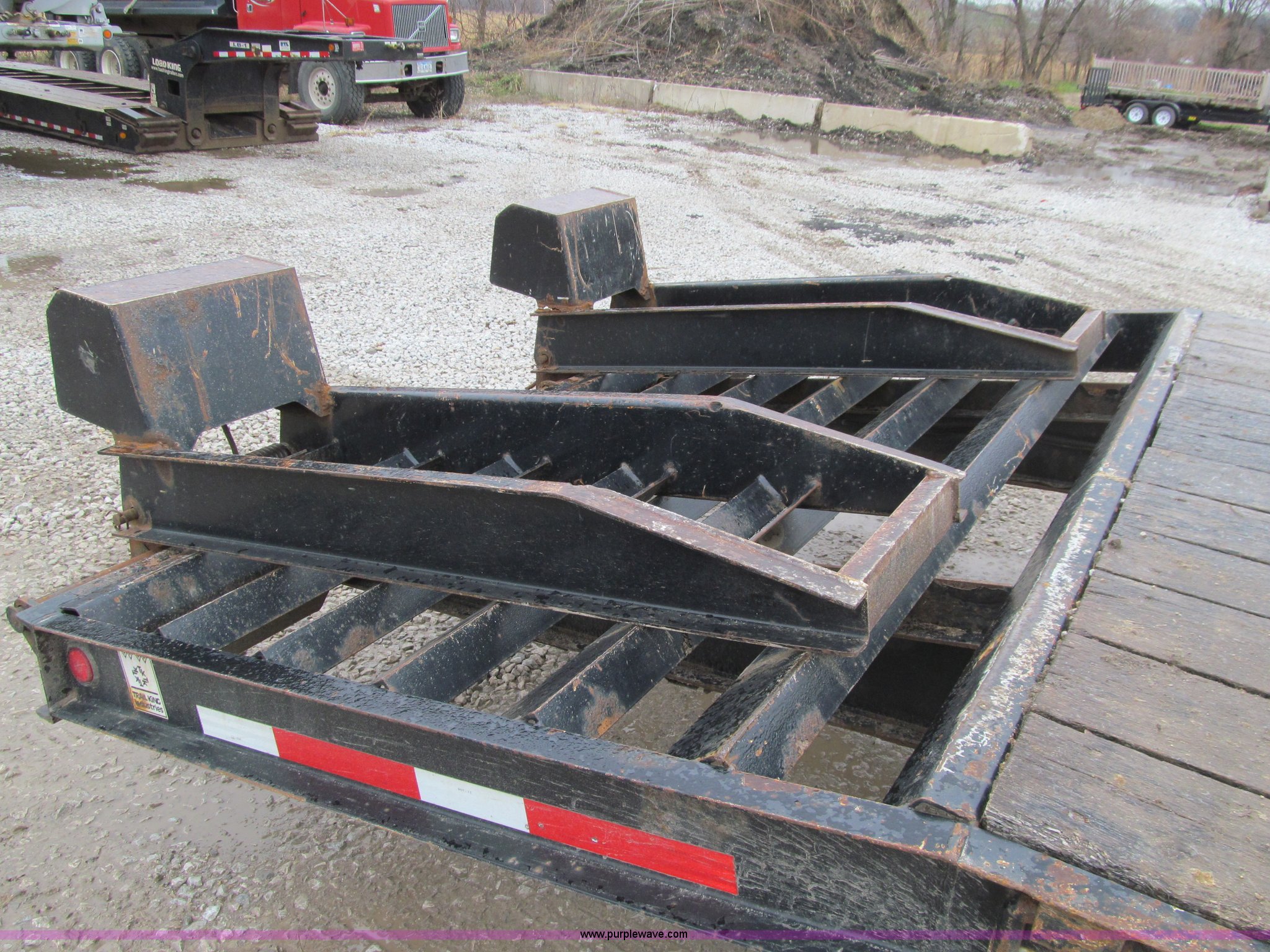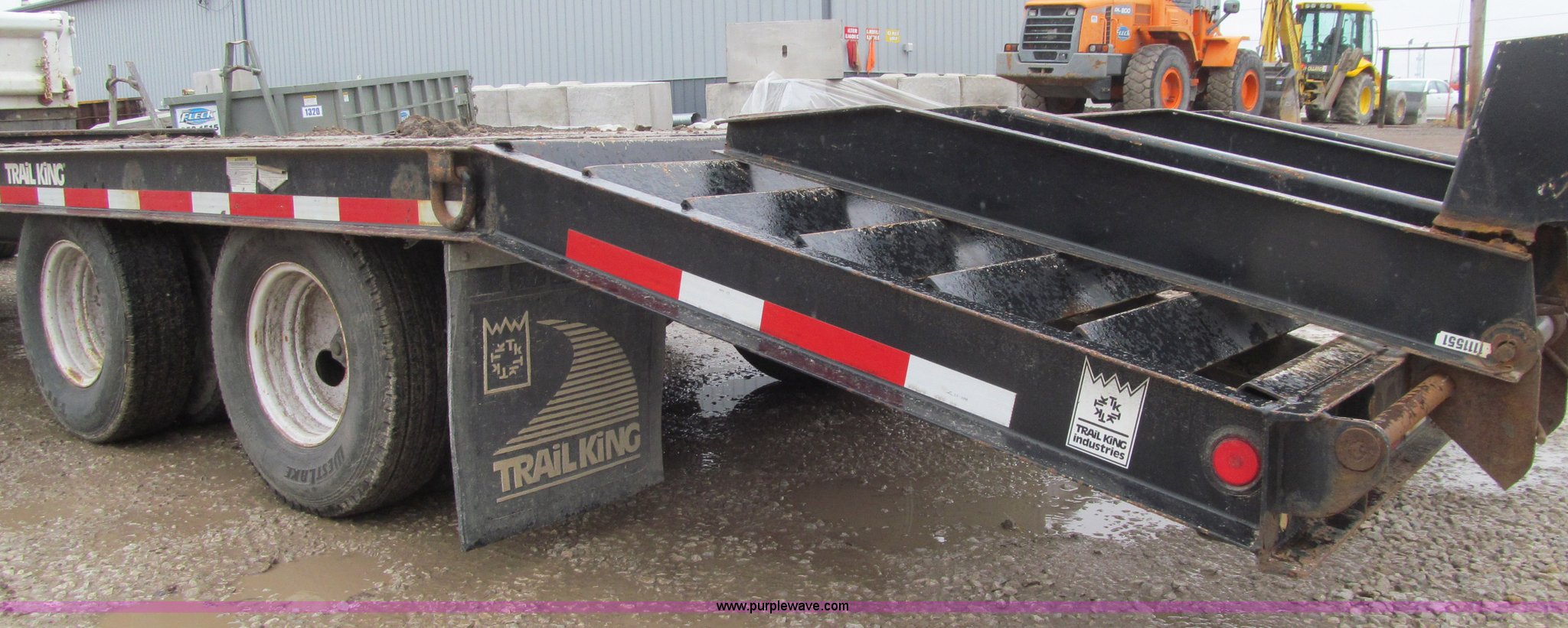 Purple Wave is selling a used Equip. Trailer in Iowa. This item is a 2008 Trail King TK-20LP-2400 equipment trailer with the following: 19'L x 102"W deck, 5'L x 102"W beaver tail, 5'L x 19"W ramps, Tool storage, (4) tie downs per side, Tongue mounted jack stand, Safety chains, Adjustable height pintle hitch, Electric brakes, Tandem axle, ST235/85R16 tires, GVWR 25,950 lbs, GAWR 10,000 lbs per axle