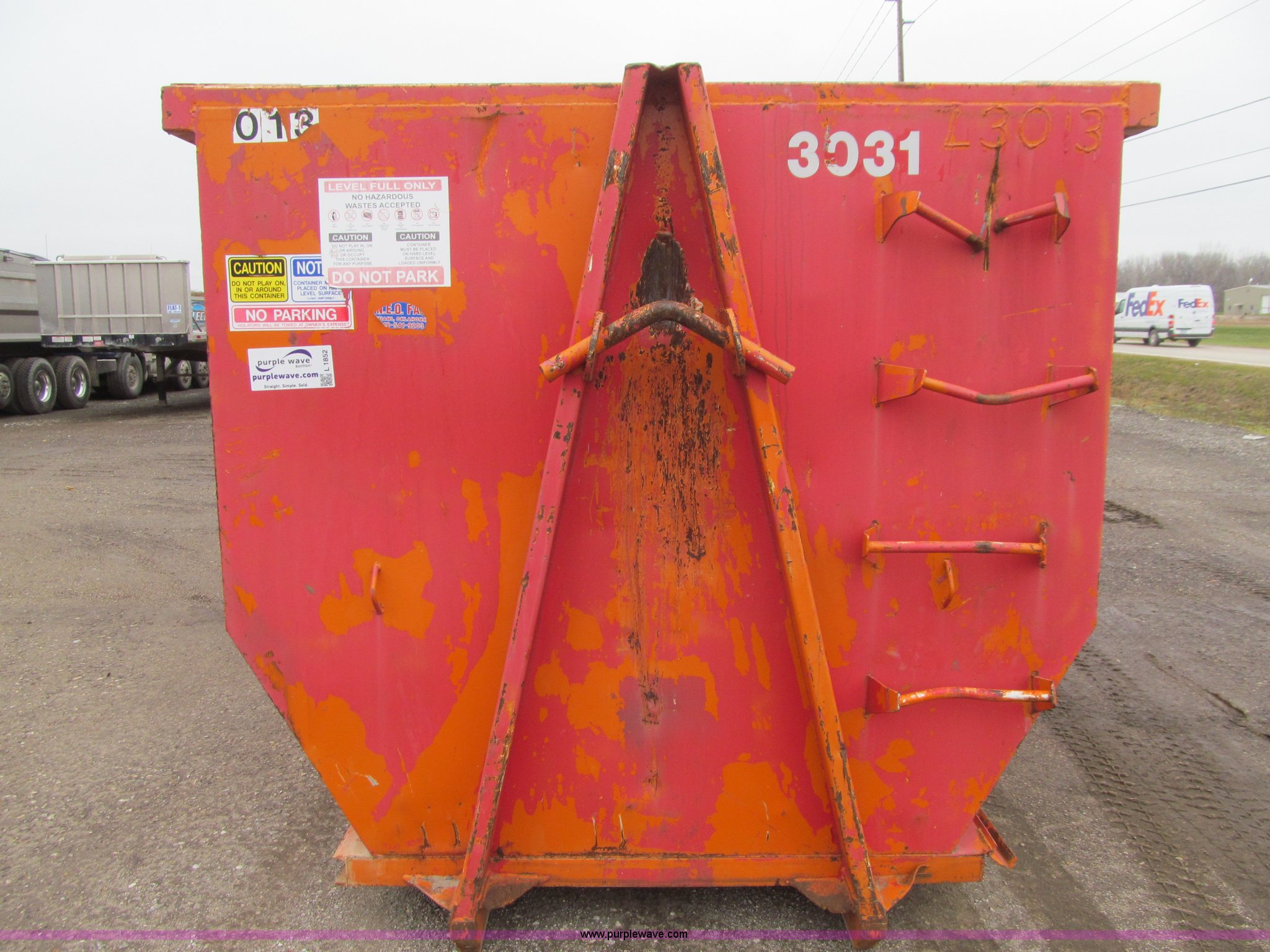 Purple Wave is selling a used Refuse or Compaction Equip. in Iowa. This item is a Roll off container with the following: Approximately 19'L x 96"W, Approximately 8.5' side height, 30 cubic yard capacity, Steel construction, Front hook, Access steps, Rear hinged door, Rear casters