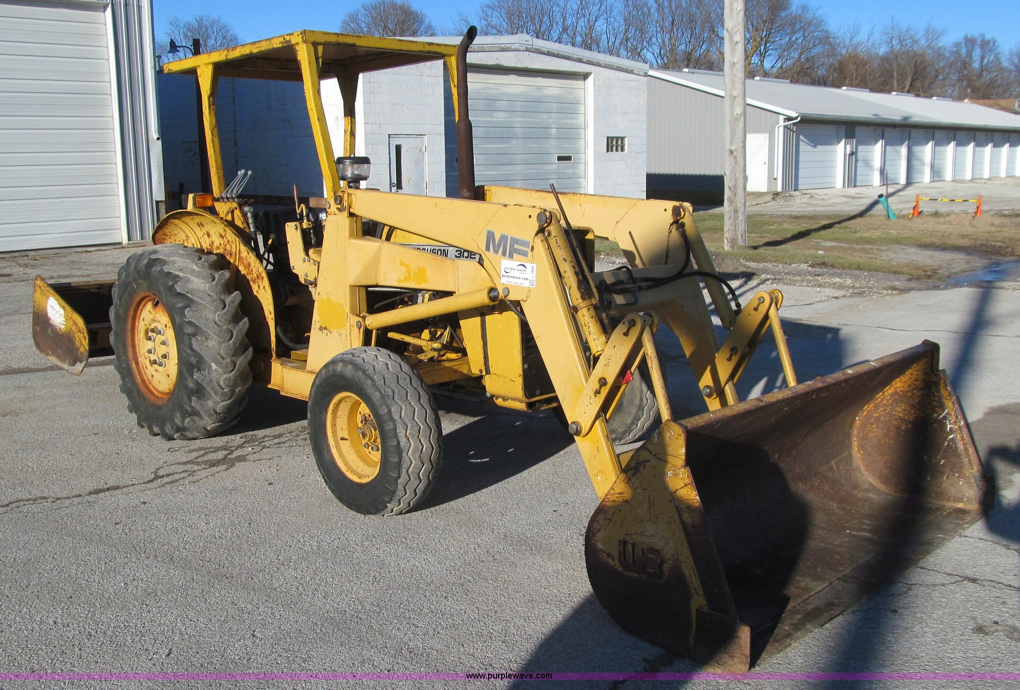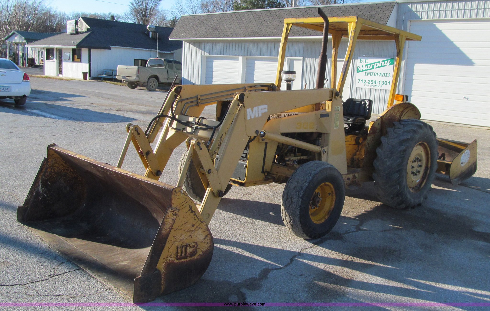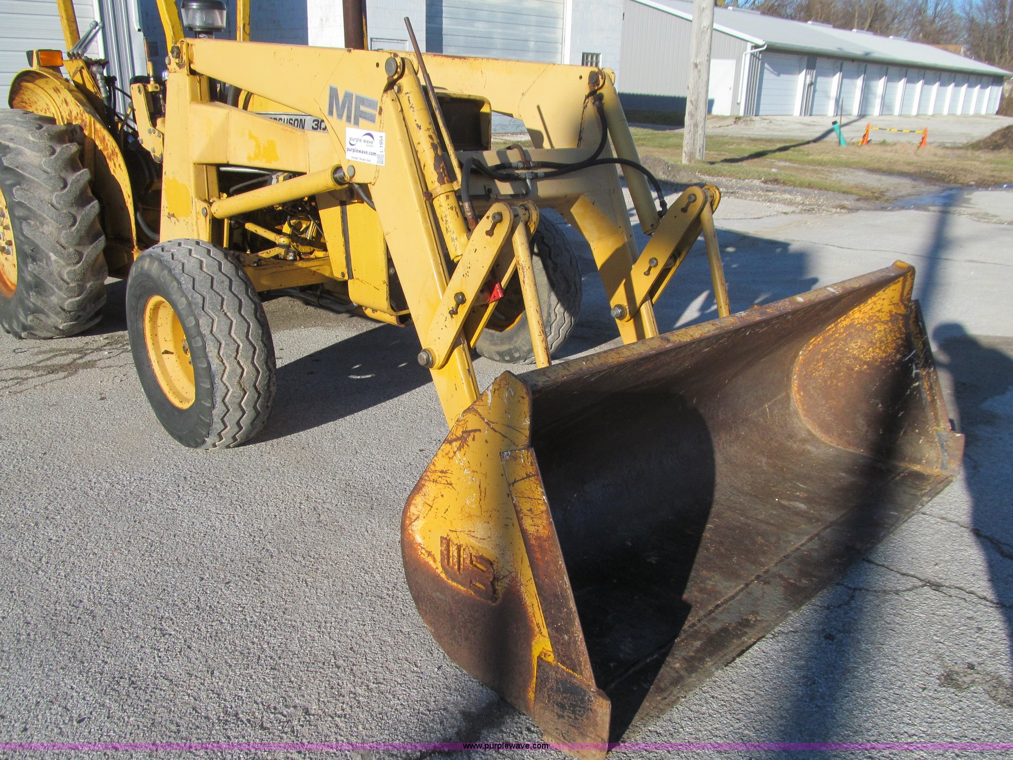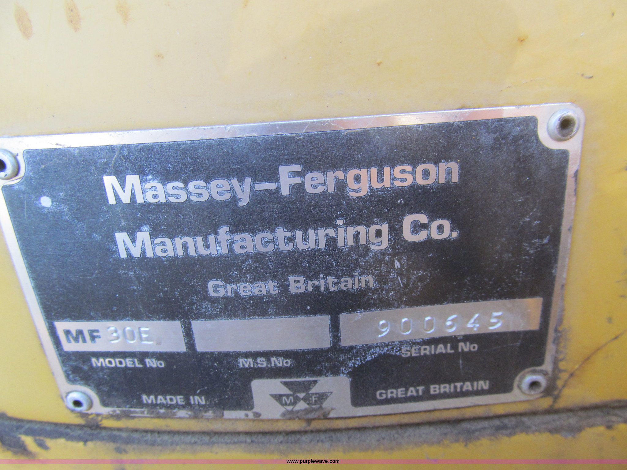 Purple Wave is selling a used Tractor in Iowa. This item is a Massey Ferguson 30E tractor with the following: 6,589 hours on meter, Perkins 2.5L three cylinder diesel engine, Power shuttle transmission, 4F-4R gears, Differential lock, Spring suspension seat, Loader, 80"W bucket, Weld-on cutting edge, Joystick control, Three point, Digmor box scraper, 80"W, (8) scarifier teeth, Variable pitch, 76" wheelbase, 11L-15 front tires, 14.9-24 rear tires, Serial 900645