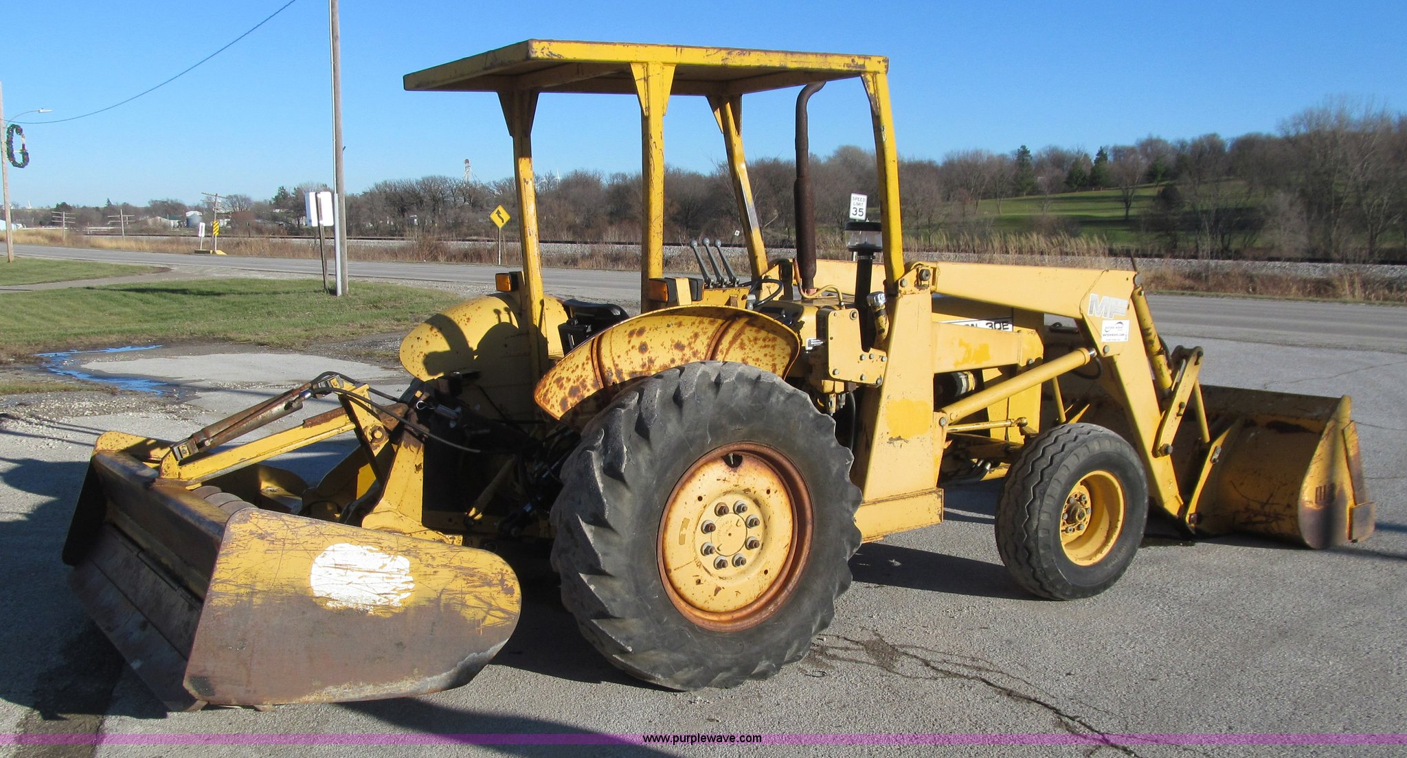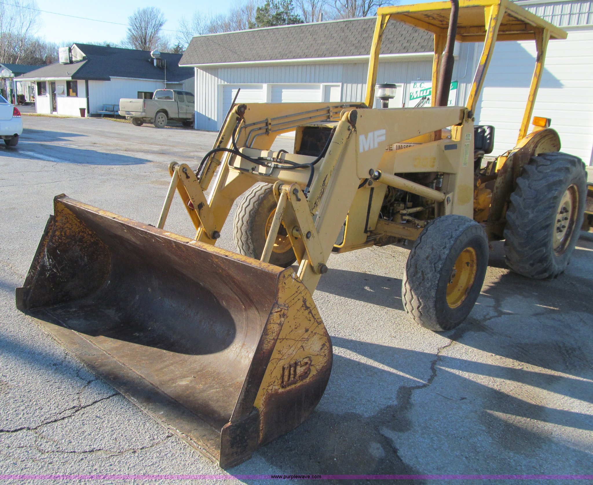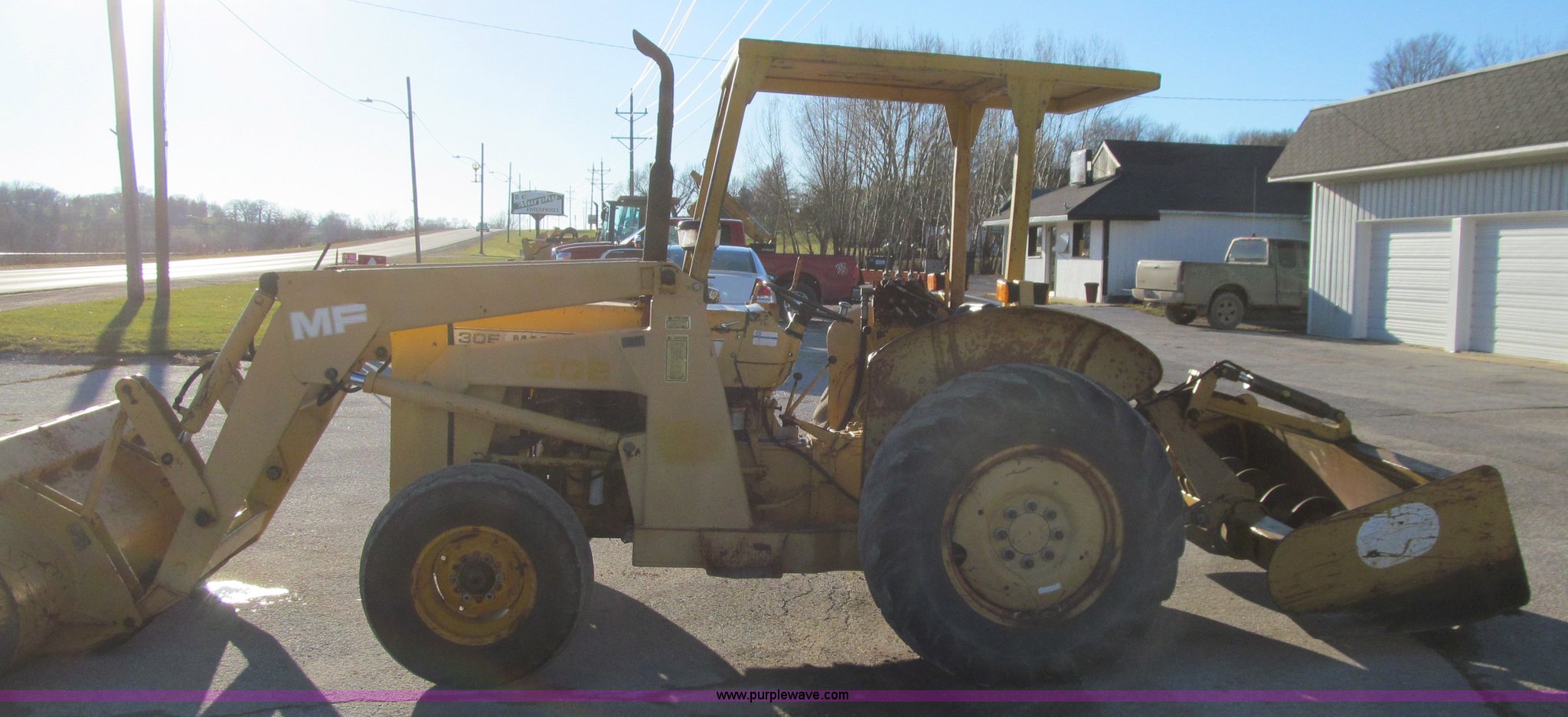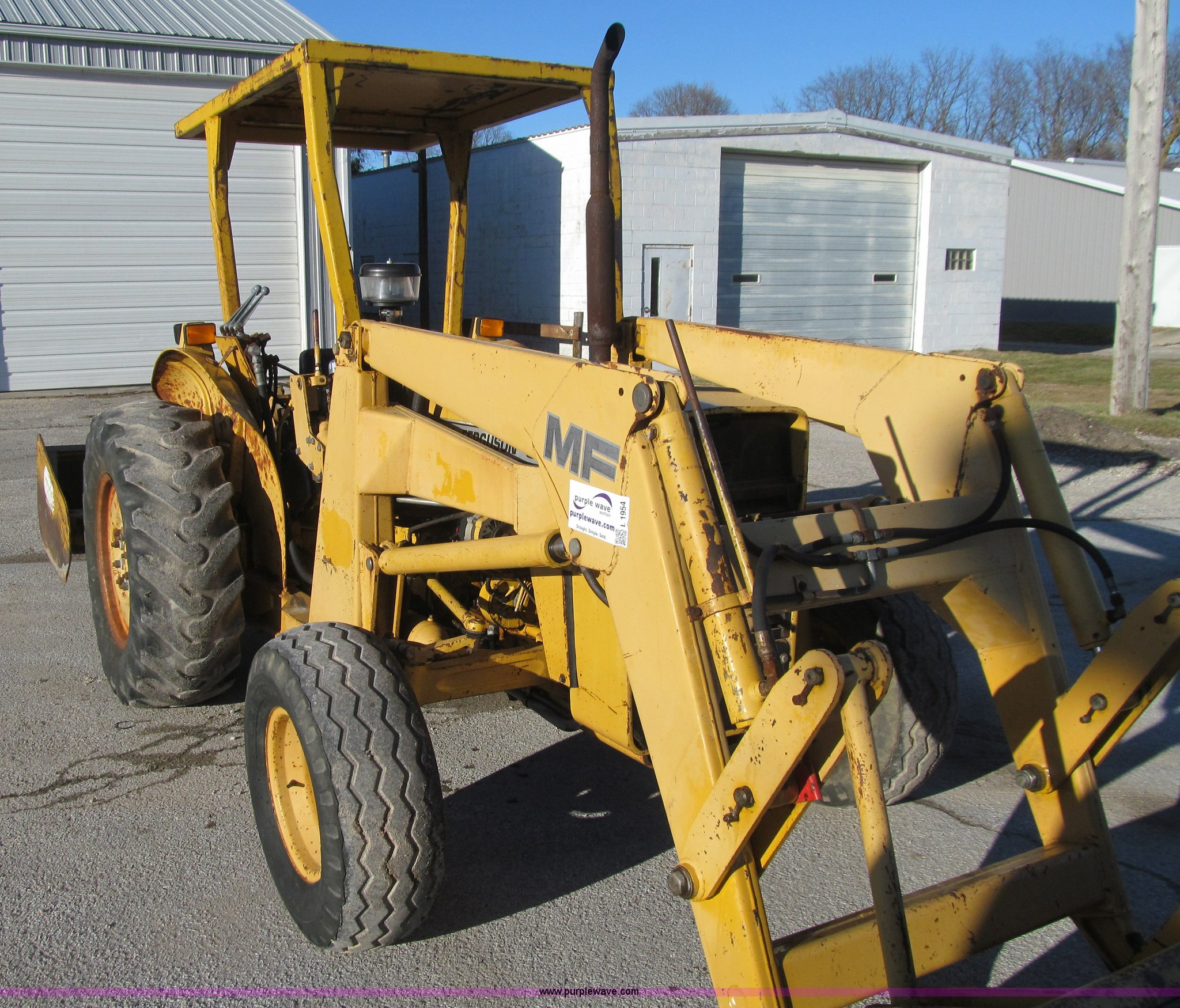 Purple Wave is selling a used Tractor in Iowa. This item is a Massey Ferguson 30E tractor with the following: 6,589 hours on meter, Perkins 2.5L three cylinder diesel engine, Power shuttle transmission, 4F-4R gears, Differential lock, Spring suspension seat, Loader, 80"W bucket, Weld-on cutting edge, Joystick control, Three point, Digmor box scraper, 80"W, (8) scarifier teeth, Variable pitch, 76" wheelbase, 11L-15 front tires, 14.9-24 rear tires, Serial 900645