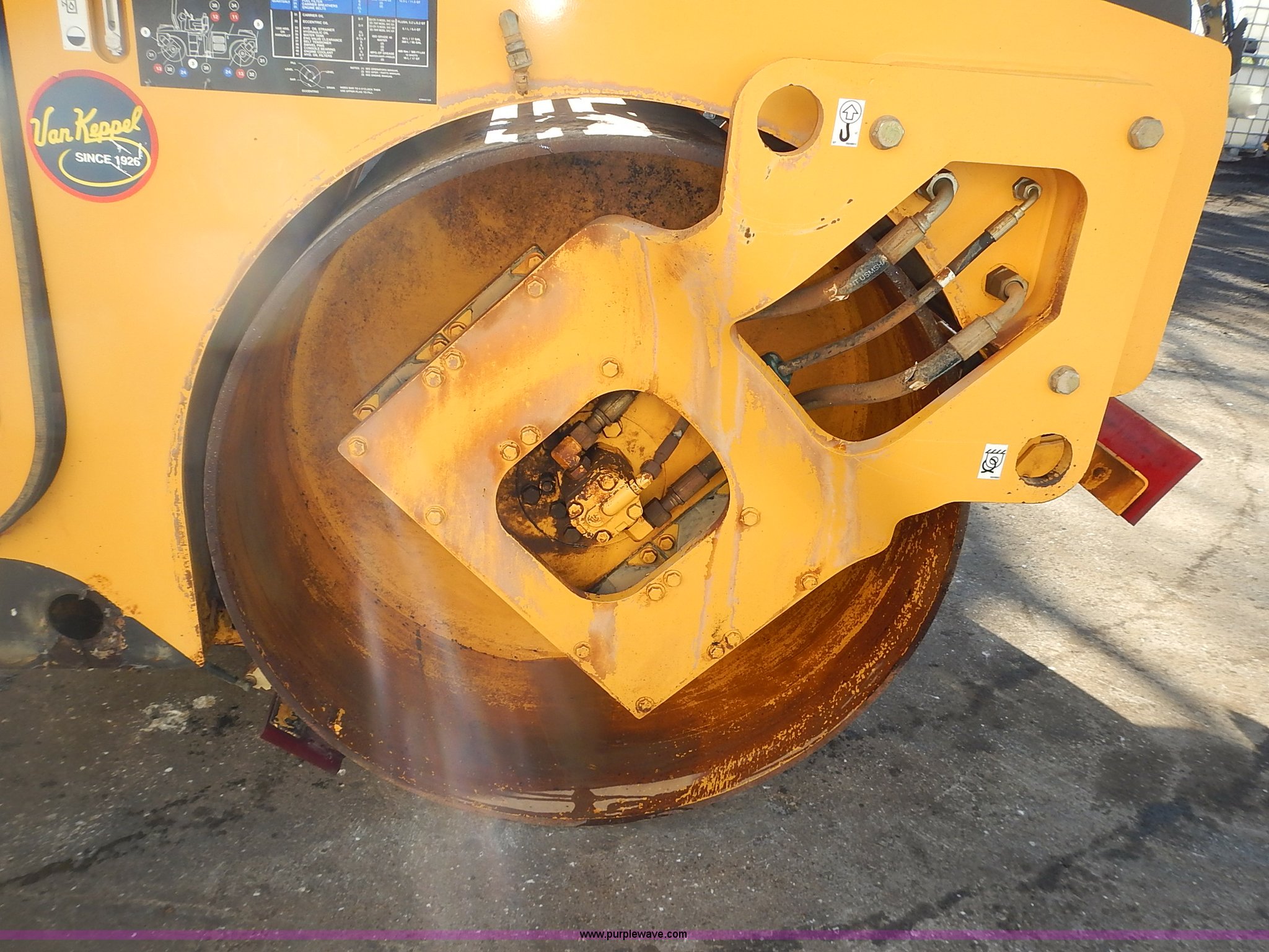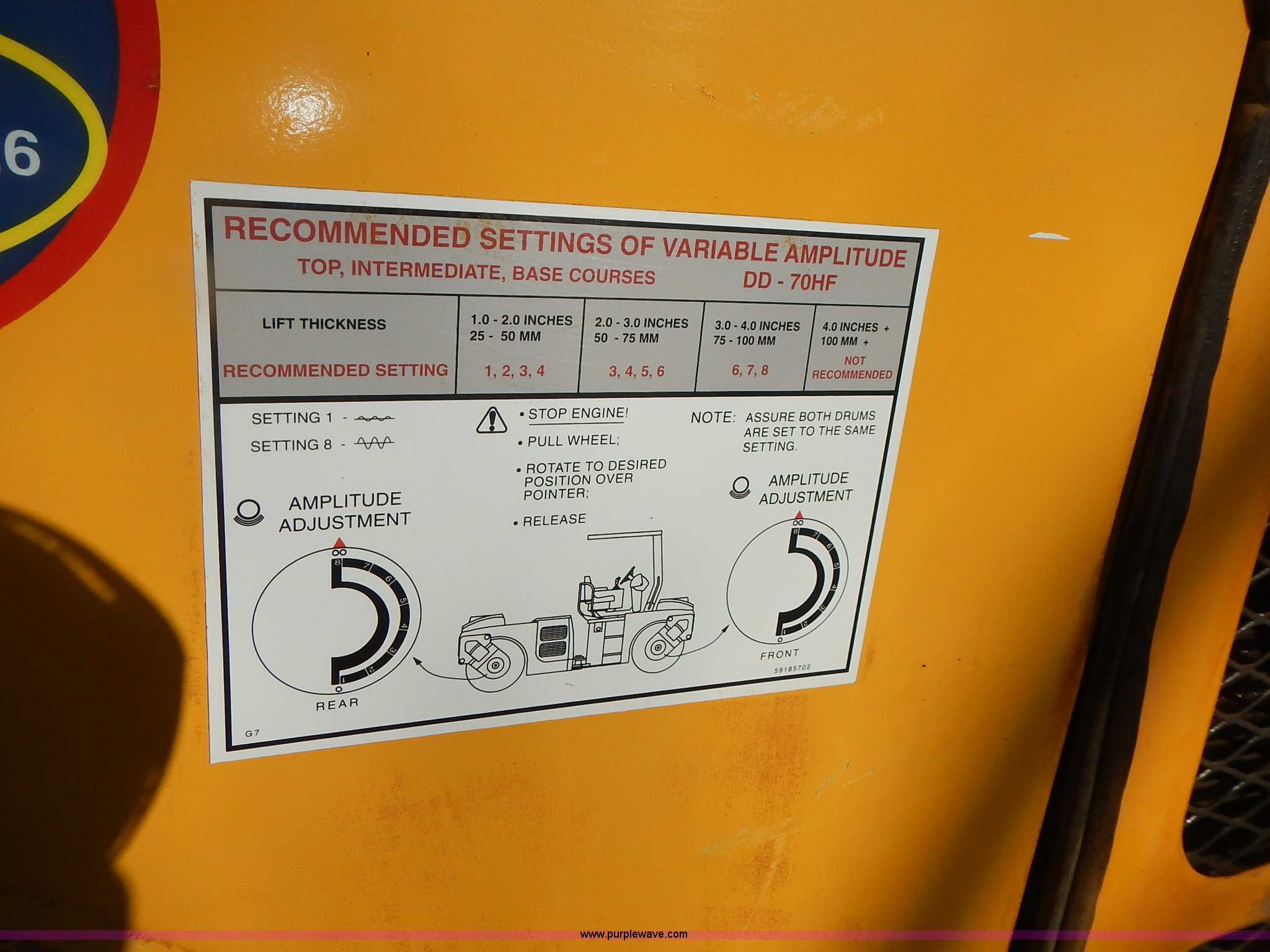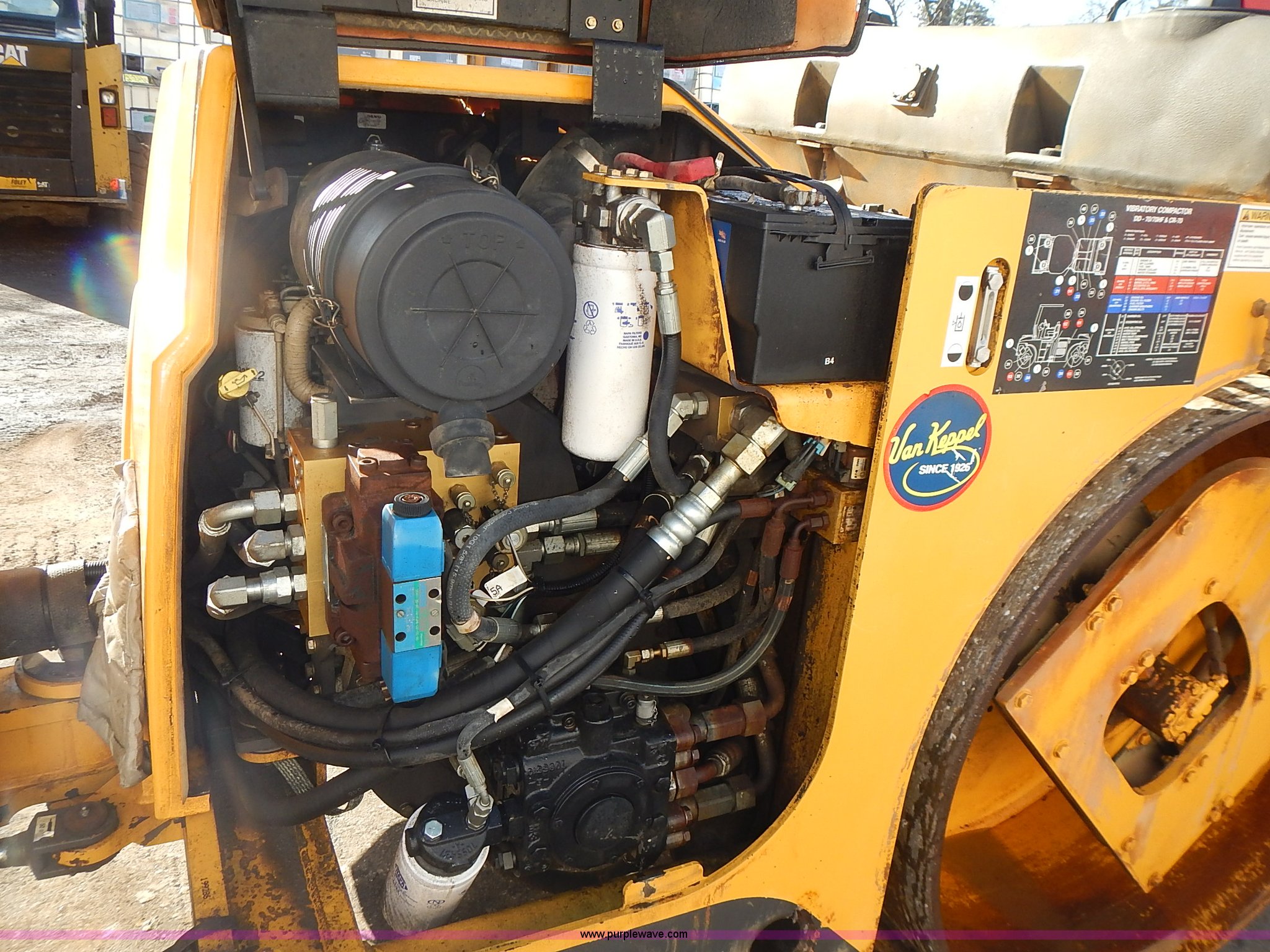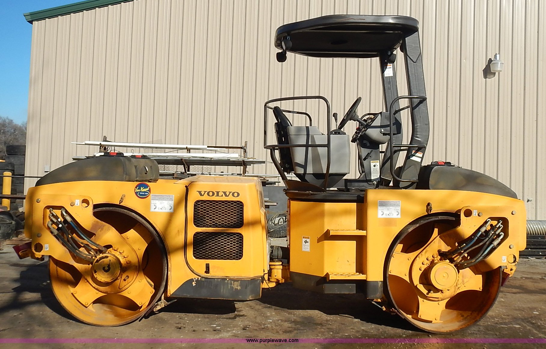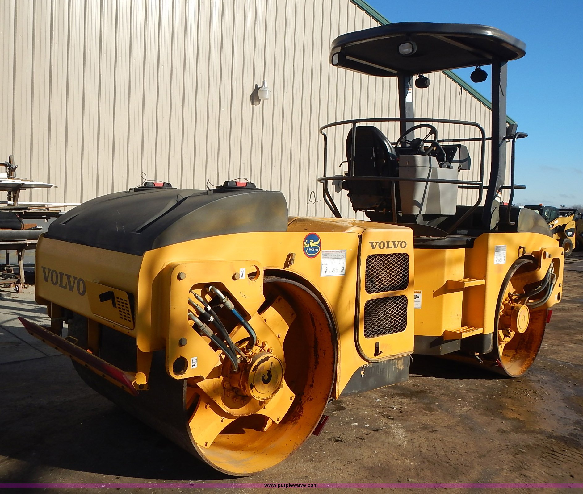 Purple Wave is selling a used Double Drum Roller Compactor in Kansas. This item is a Volvo DD70HF double drum roller with the following: 1,062 hours on meter, Cummins B4.5 4.5L four cylinder diesel engine, Serial 46861416, Family 7CEXL0275AAP, Canopy, Vinyl seat, Seat belt, Front and rear work lights, 57"W x 41" diameter smooth drums, Front and rear drum scrapers, Front and rear water spray applicators, Serial 199286
