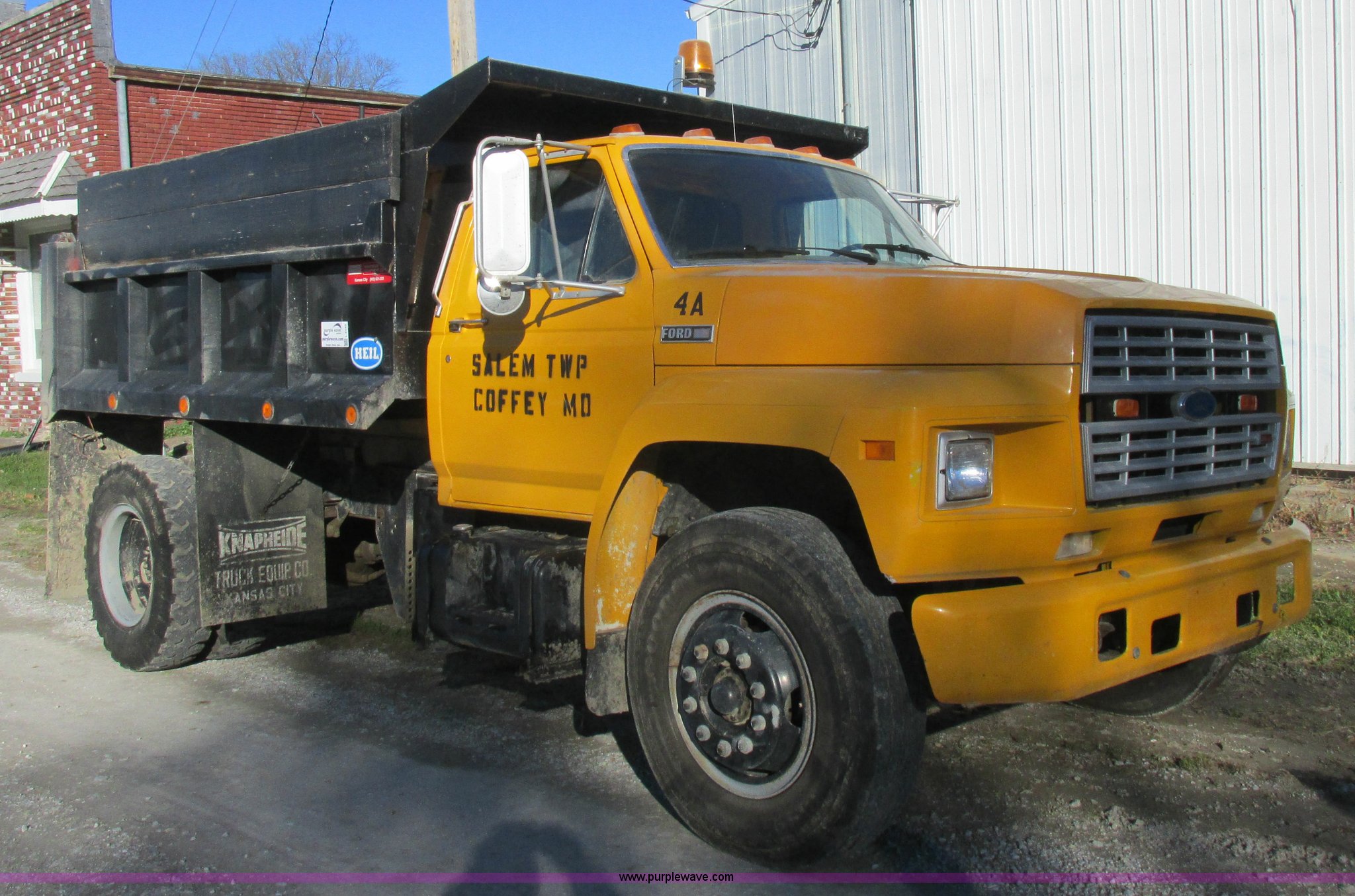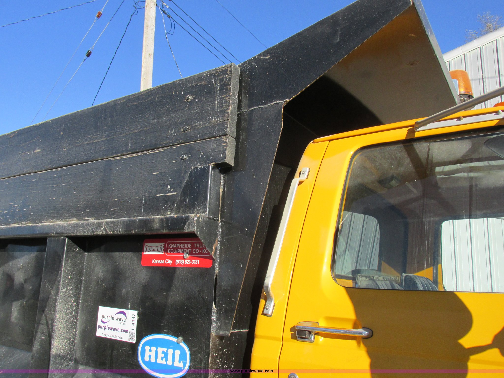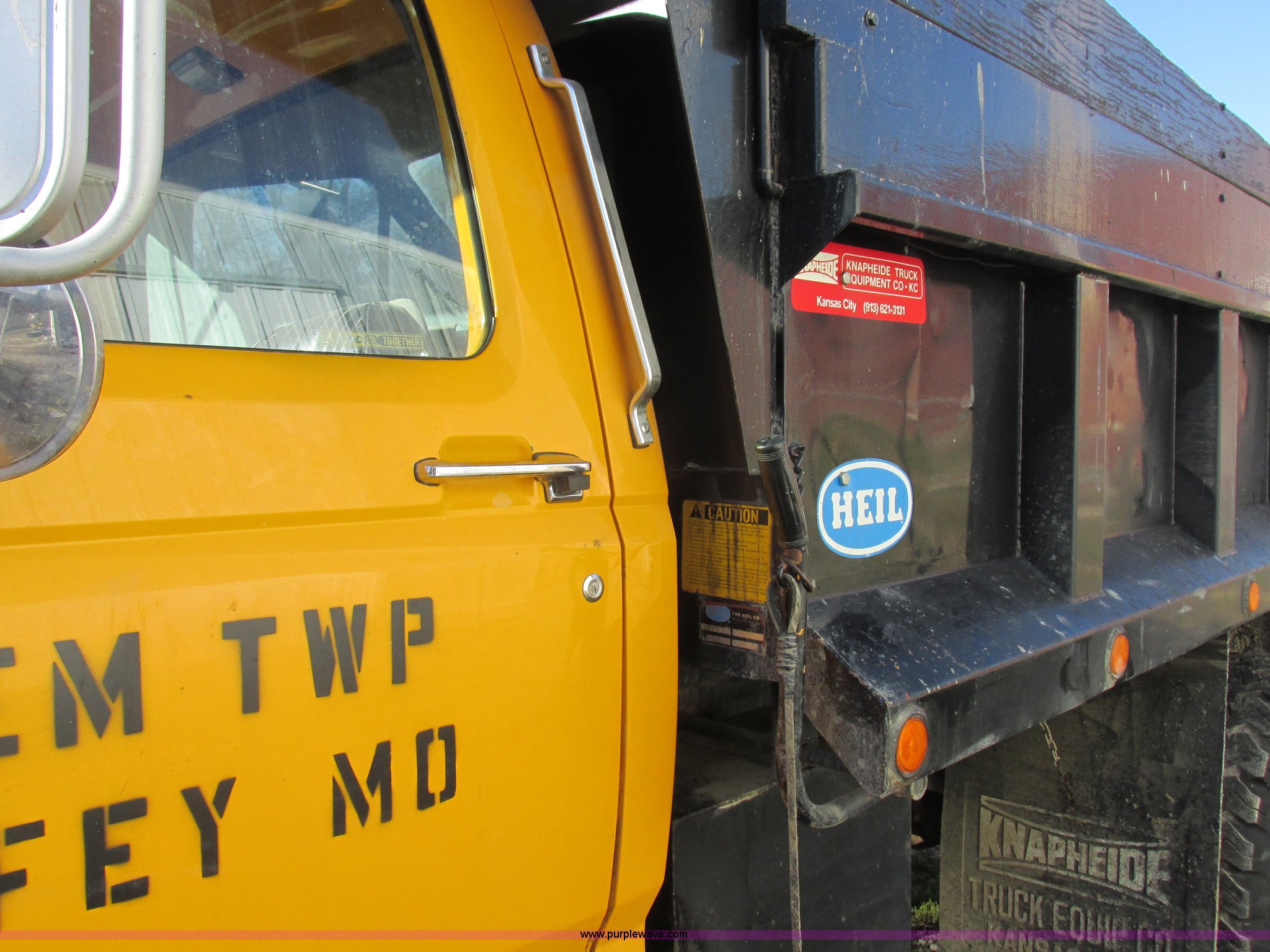 Purple Wave is selling a used Construction Dump Truck in Missouri. This item is a 1985 Ford F700 dump truck with the following: 26,583 miles on odometer, Ford 6.1L V8 gas engine, 10 speed manual transmission, Single axle, Heat, Spring suspension seat, PTO, Heil SL5YD10FL steel dump bed, 10'L x 8'W, Five cubic yard capacity, Single ram hoist, Manual operated end gate, Serial 134594, Single fuel tank, Spring suspension, Hydraulic brakes, 9.00-20 tires