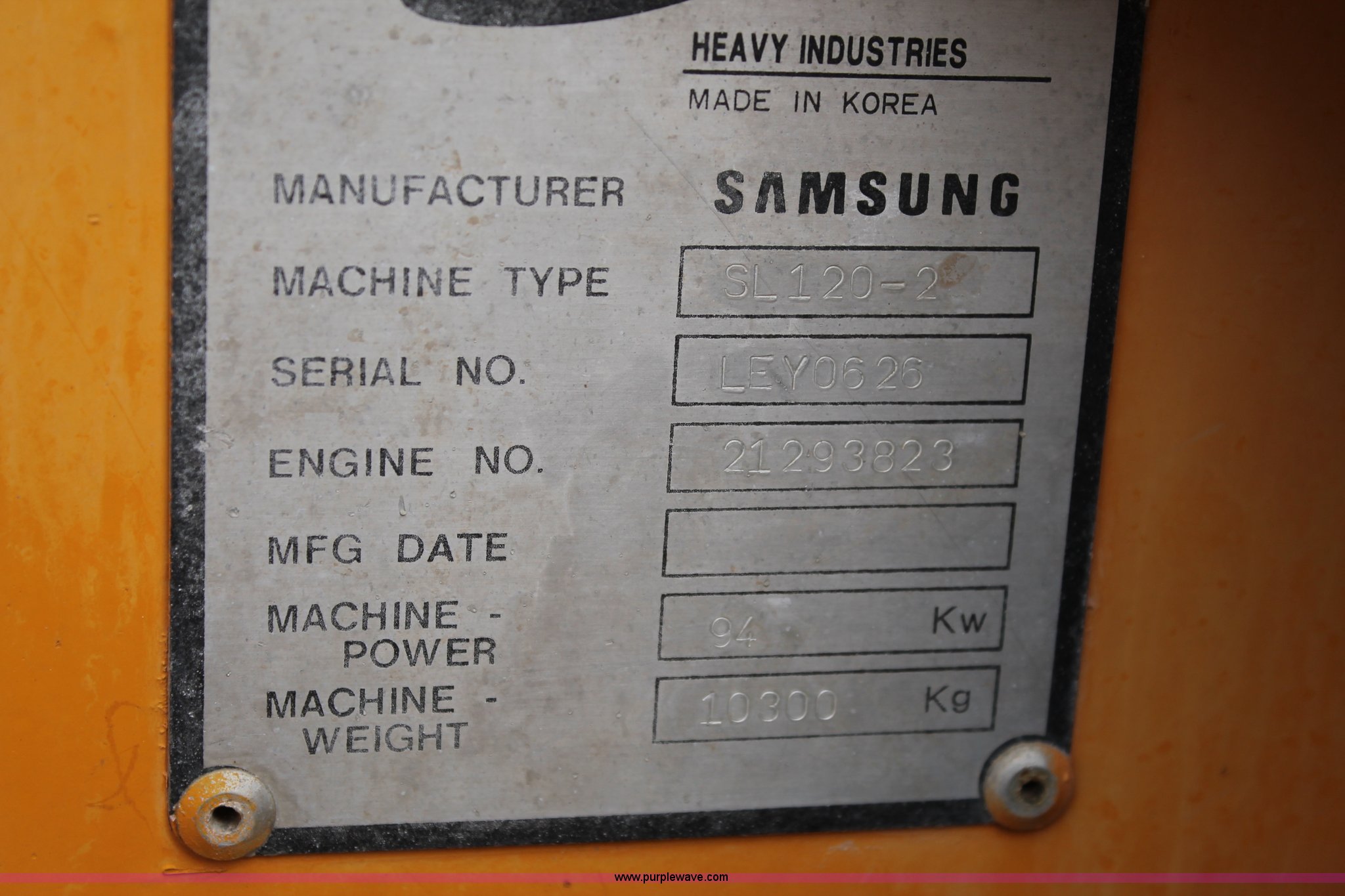 Purple Wave is selling a used Wheel Loader in Texas. This item is a Samsung 120-2 wheel loader with the following: 316 hours on meter, Cummins 85.9-C 5.9L L6 turbo diesel engine, Serial 21293823, Shuttle shift transmission, Enclosed cab, AC and heat, AM/FM/cassette, Air suspension seat, Front and rear work lights, Backup alarm, ACS 99"W general purpose bucket, 2.5 cu. yd. capacity, Bolt-on cutting edge, 17.5-25 tires, Serial LEY0626
