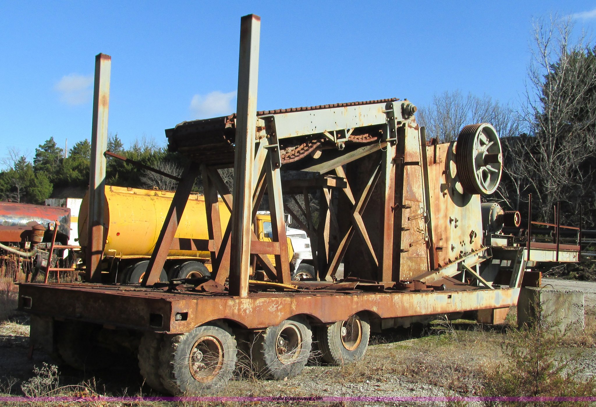 Purple Wave is selling a used Crusher or Crushing Plant in Missouri. This item is a Austin jaw crusher with the following: Westinghouse electric motor, 100 HP, Three phase, 1978 Transport trailer, Model OR50TXF, 50 ton capacity, 39'L x 8'10"W, Air brakes, 10.00-15 NHS tires, Serial 3558