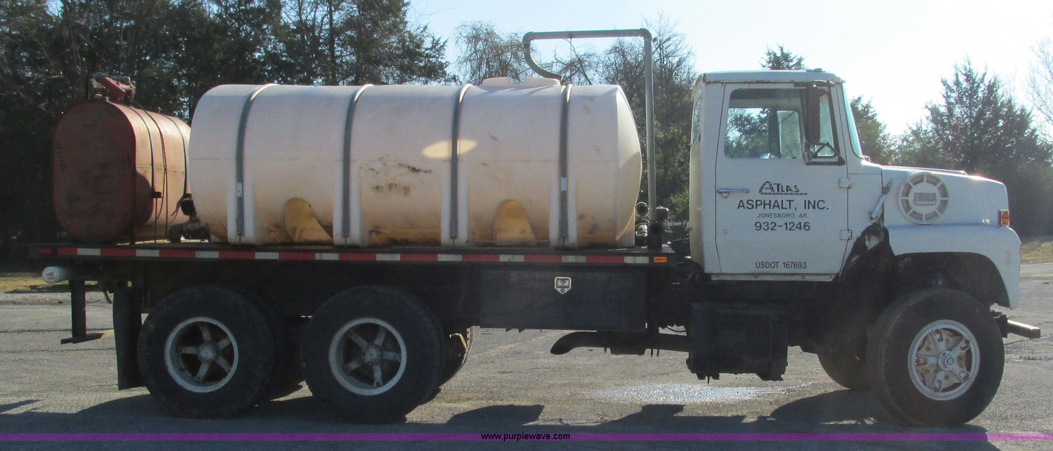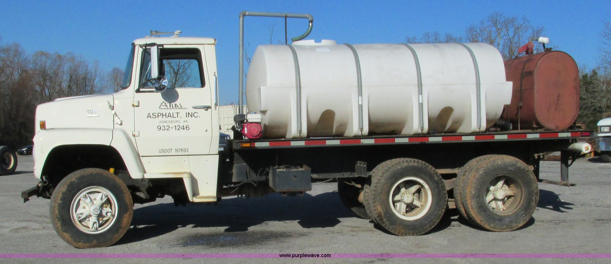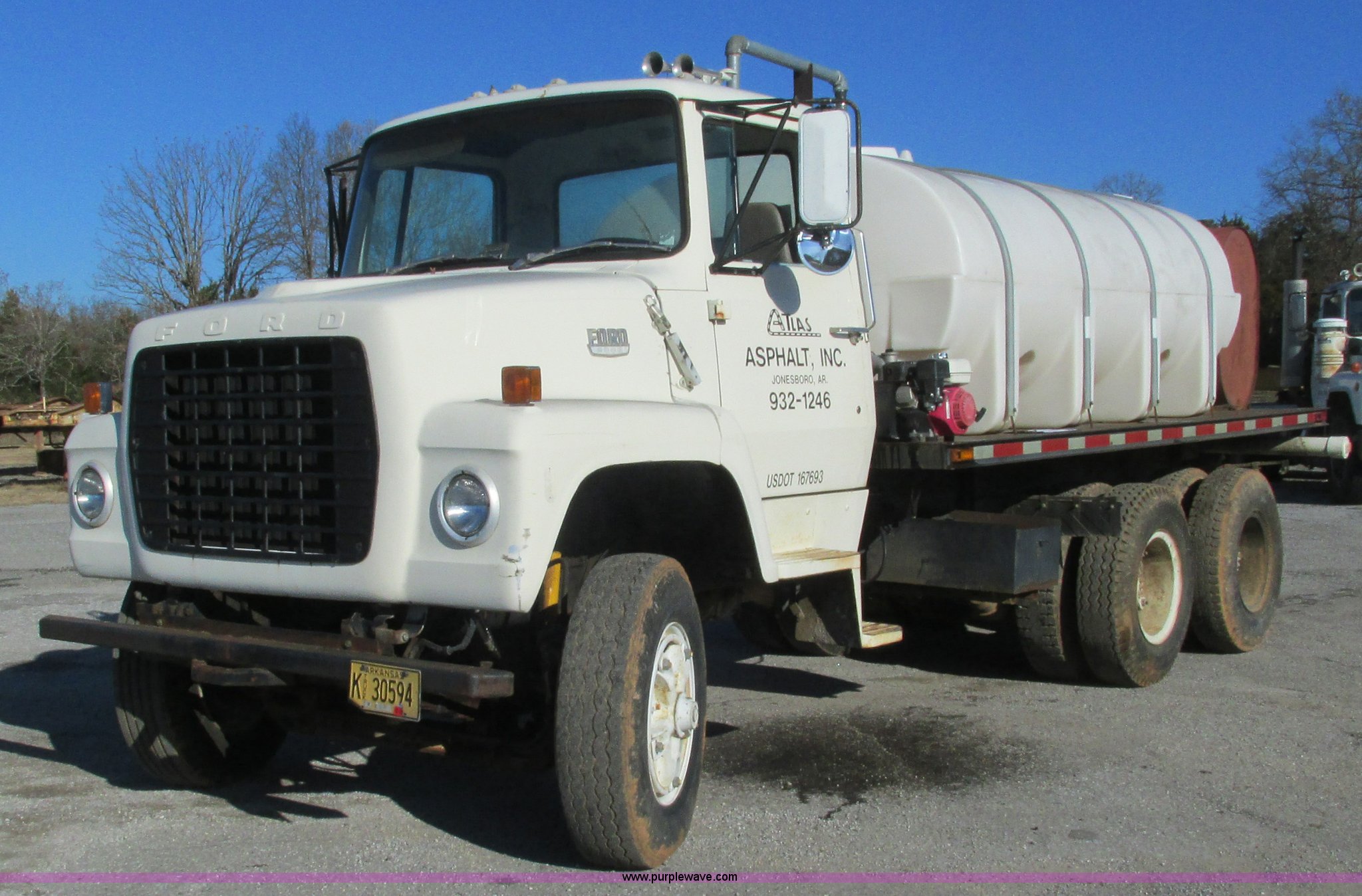 1978 Ford 9000 water truck. 310,087 miles on odometer, Cummins NTC-290 six cylinder diesel engine, Eaton Fuller Road Ranger 10 speed manual transmission Model RT1110, Air suspension seat, 2,000 gallon poly water tank Top fill, Toolbox, 5'L x 28"W x 44"H fuel tank Fill Rite 12V pump, Hose, Nozzle, 107" spreader bar (2) 24" extensions, Spring suspension, Air brakes, 11R22.5 front tires, 10R20 rear tires, Windshield cracked, Seat damaged, Interior/exterior cosmetic damage. W91VVBF0005. View equipment video. Atlas Asphalt Inc.. 1653 Batesville Blvd.. Batesville, AR 72501