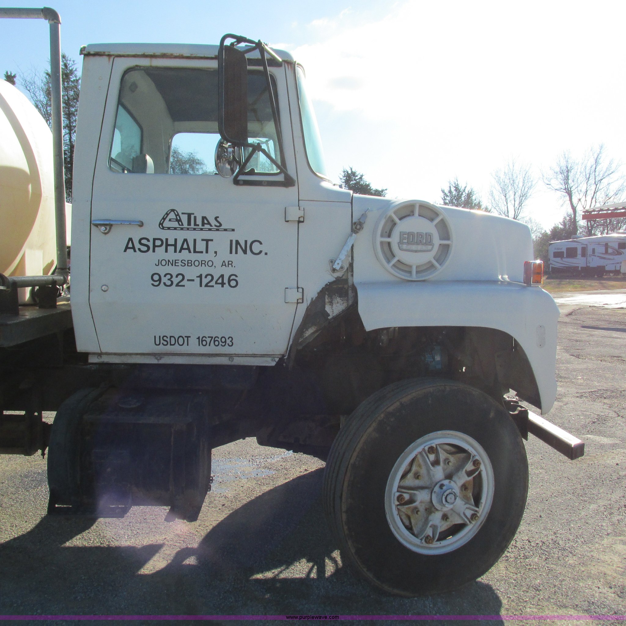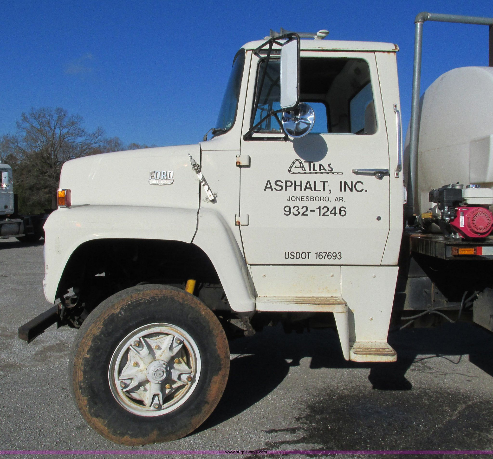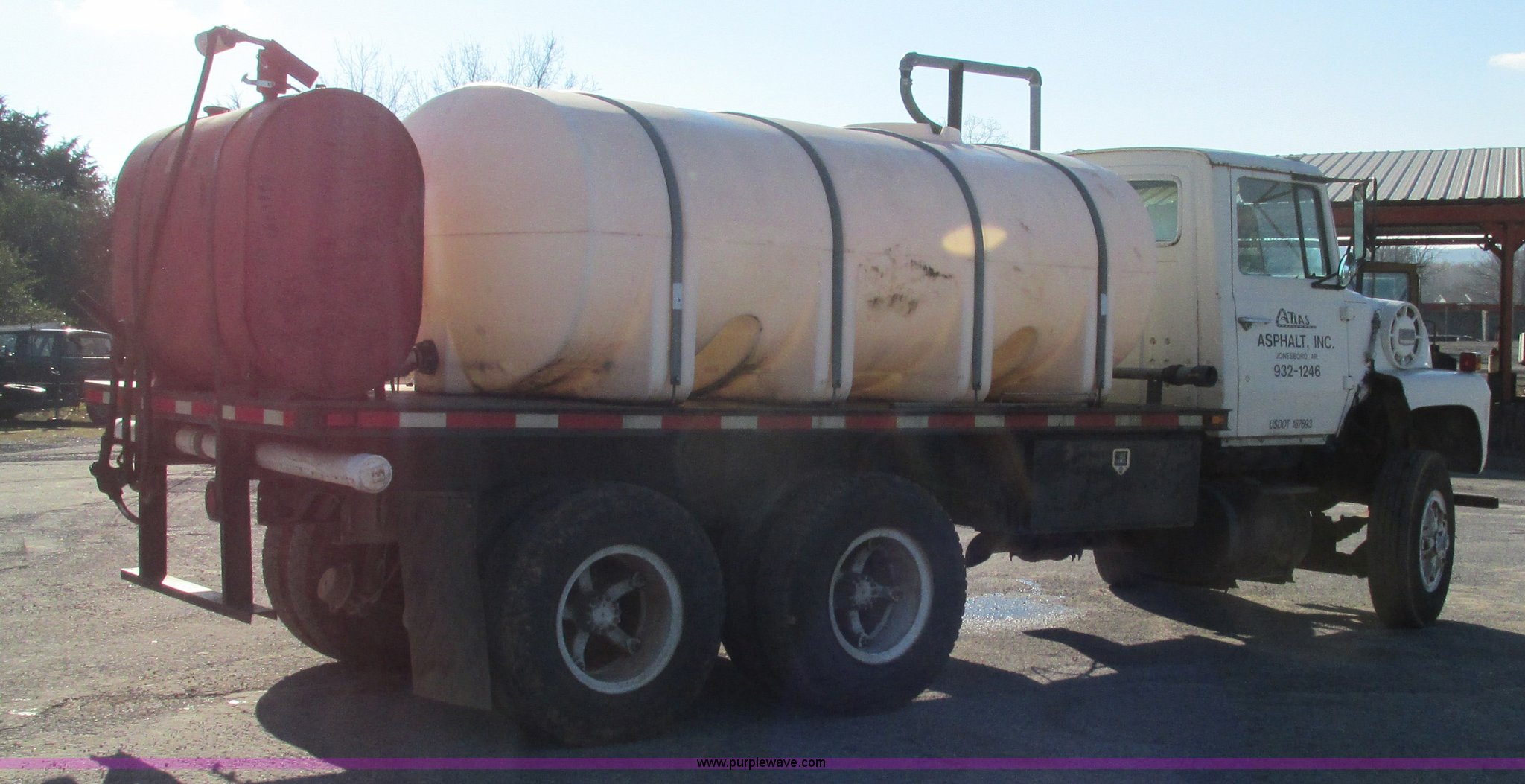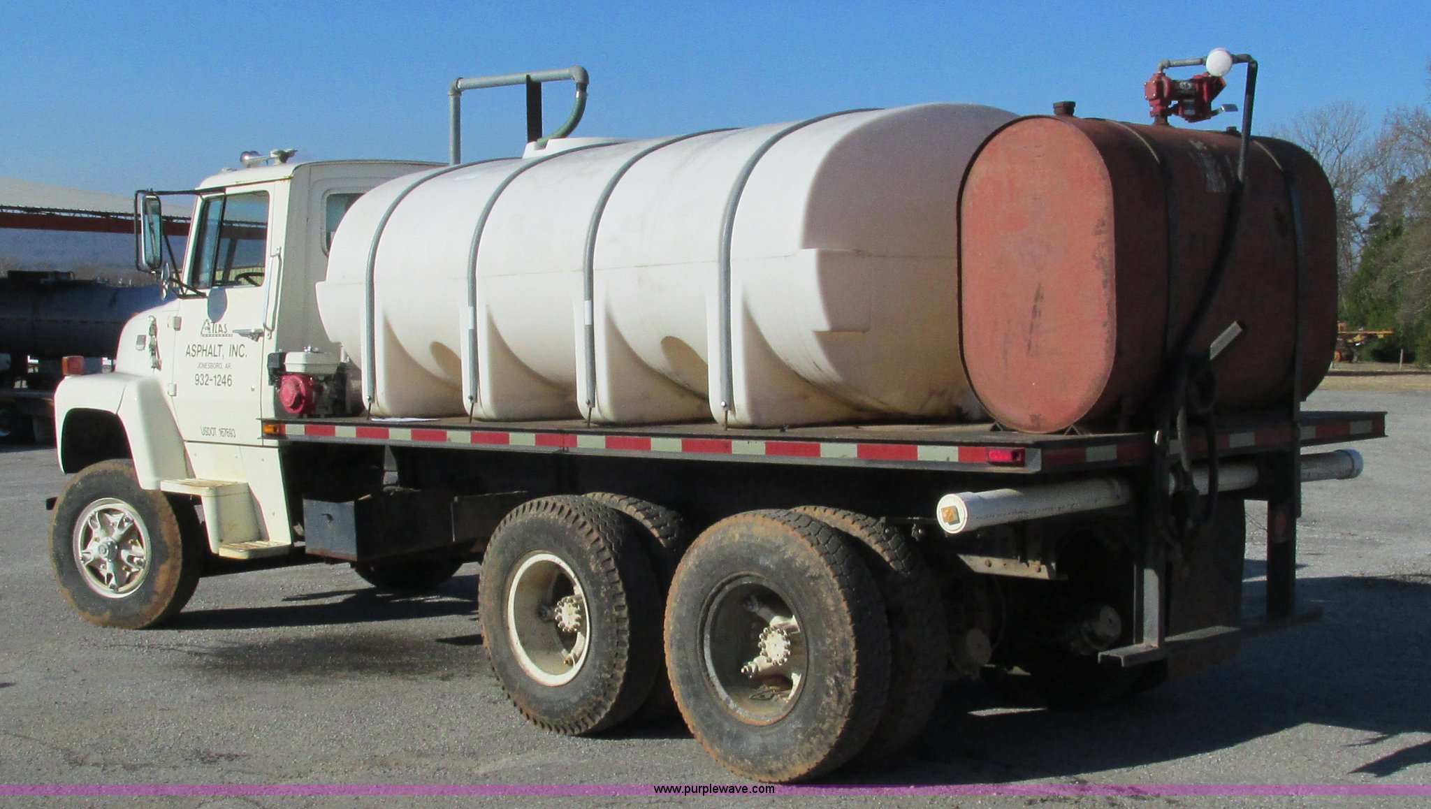 1978 Ford 9000 water truck. 310,087 miles on odometer, Cummins NTC-290 six cylinder diesel engine, Eaton Fuller Road Ranger 10 speed manual transmission Model RT1110, Air suspension seat, 2,000 gallon poly water tank Top fill, Toolbox, 5'L x 28"W x 44"H fuel tank Fill Rite 12V pump, Hose, Nozzle, 107" spreader bar (2) 24" extensions, Spring suspension, Air brakes, 11R22.5 front tires, 10R20 rear tires, Windshield cracked, Seat damaged, Interior/exterior cosmetic damage. W91VVBF0005. View equipment video. Atlas Asphalt Inc.. 1653 Batesville Blvd.. Batesville, AR 72501