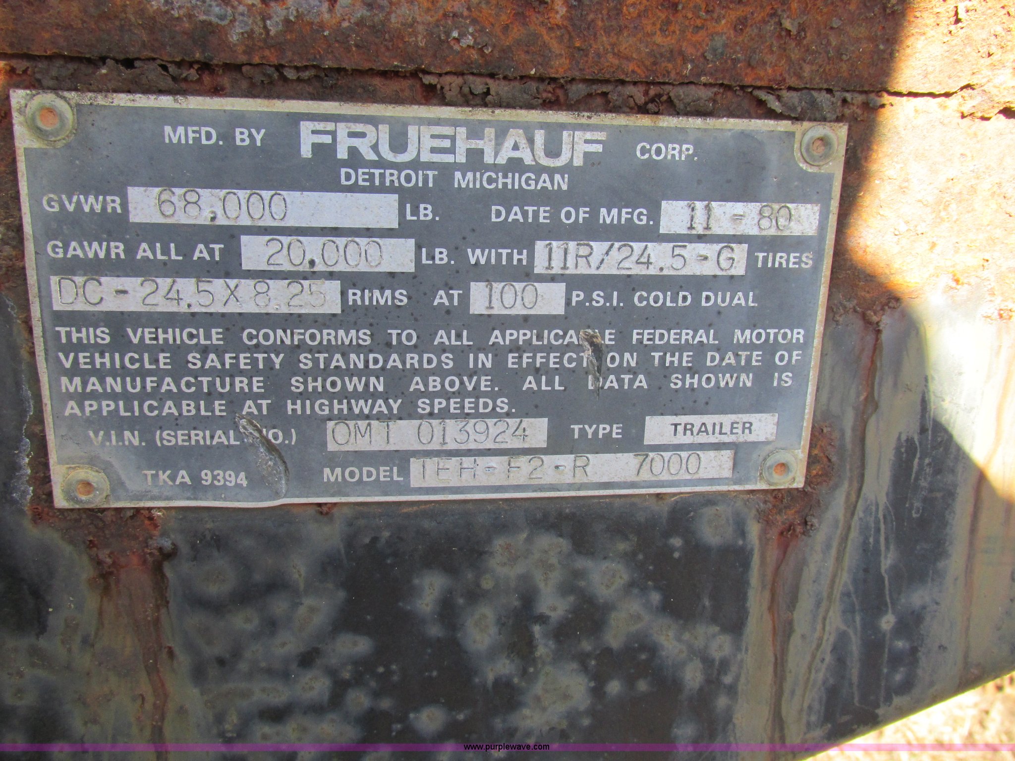 Purple Wave is selling a used Tank Trailer in Missouri. This item is a 1981 Fruehauf tank trailer with the following: 42'L x 96"W, Aluminum tank, 7,000 gallon capacity, (2) outlet valves, 3" diameter,, Steel inner tank, Insulated, Dual leg landing gear, Fifth wheel plate, Tandem axle, Spring suspension, Air brakes, 285/75R24.5, Interior/exterior cosmetic damage
