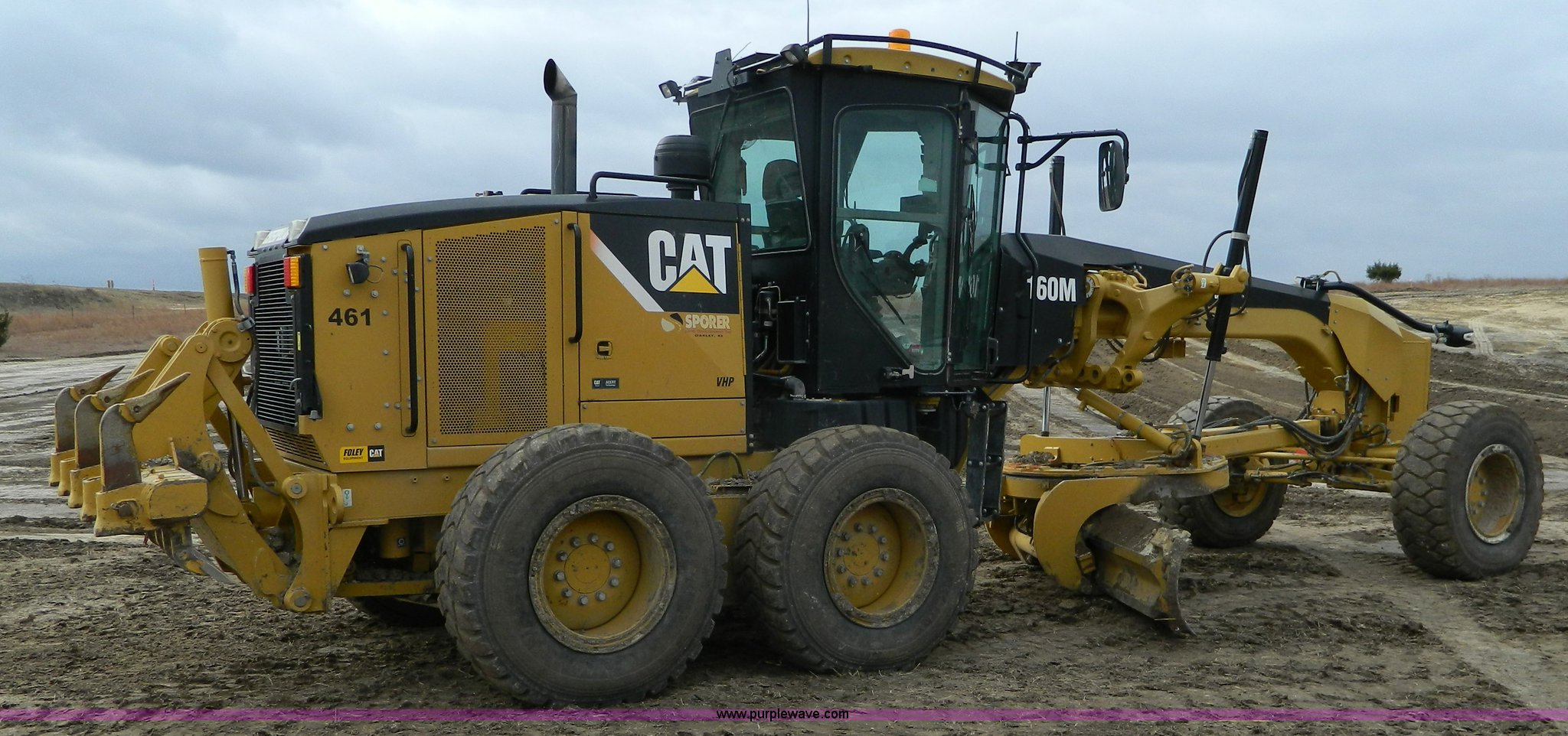 Purple Wave is selling a used Motor Grader in Kansas. This item is a 2010 Caterpillar 160M motor grader with the following: 9,285 hours on meter, Hours may vary, unit is still in use, Caterpillar C9 Acert six cylinder turbo diesel engine, 213 HP, Variable horsepower, Serial THX26392, Powershift transmission, 8F-6R gears, EROPS, AC and heat, AM/FM, Air suspension seat, Front and rear work lights, 14'W moldboard, Tip control, Side shift, Front mounted push block, Rear ripper, (3) ripper shanks, (7) scarifier teeth, Accugrade ready, 17.5-25 tires, Serial CAT0160MEB9L00486