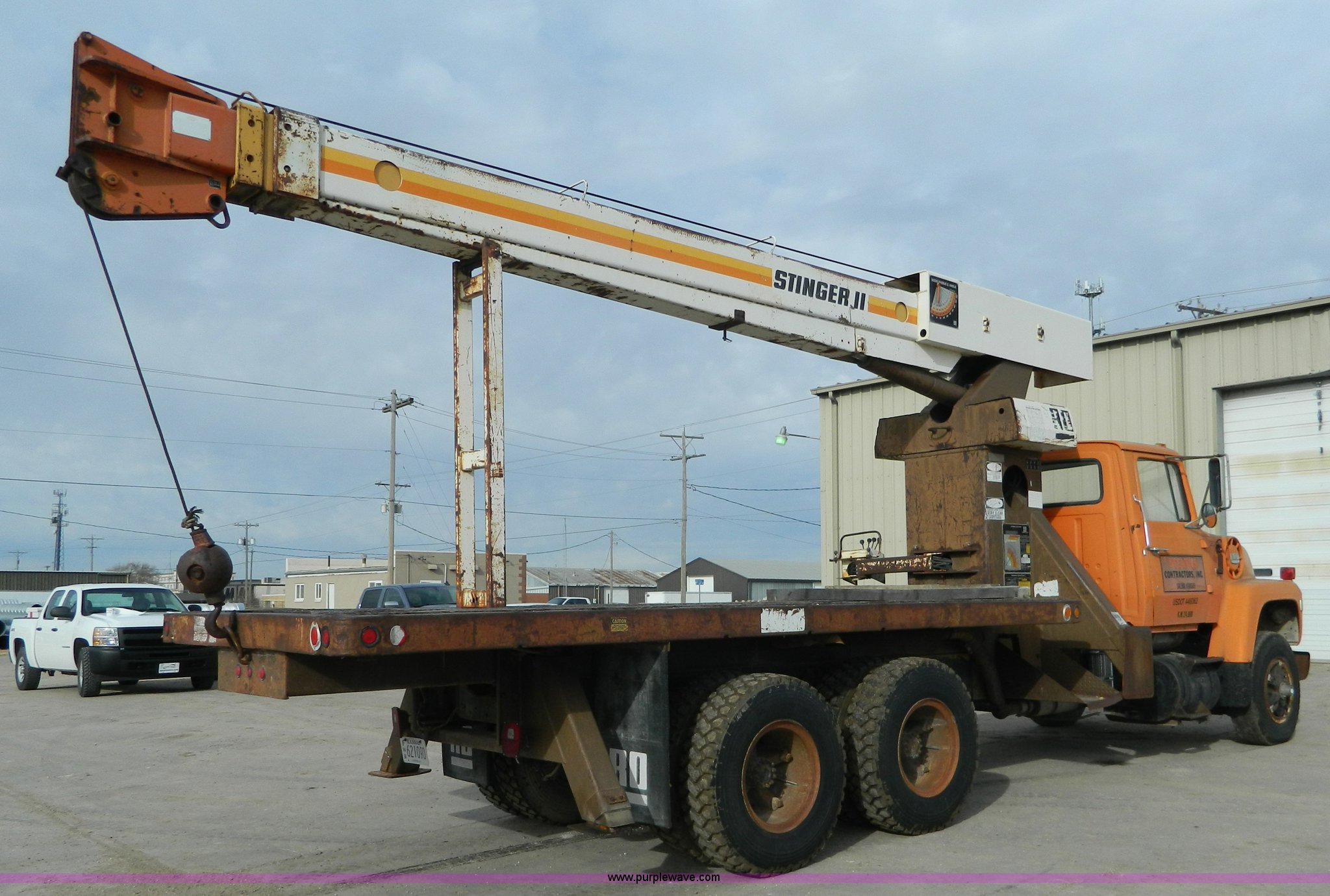Purple Wave is selling a used Crane Truck in Kansas. This item is a 1977 Ford 800 crane truck with the following: 33,112 miles on odometer, Caterpillar 3208 turbo diesel engine, 637 hours on meter, 210 HP, Serial 62W85407, Automatic transmission, Heat, 18'L x 94"W flatbed, Stick platform controls, Stinger II TC125 crane, Two section telescopic boom, 60' maximum reach, 24,000 lbs maximum lift capacity, Crane ball and hook, Spring suspension, Air brakes, Tandem axle, 10.00R20 tires, GVWR 34,000 lbs