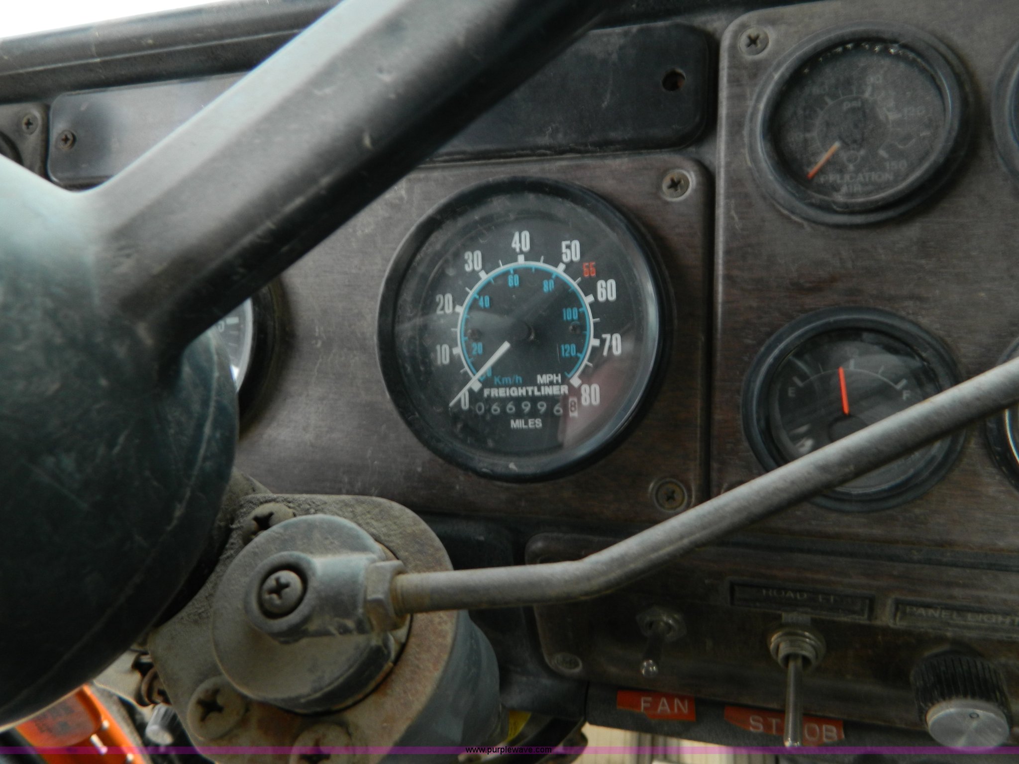 Purple Wave is selling a used Truck Tractor in Kansas. This item is a 1985 Freightliner semi truck with the following: 66,997 miles on odometer, Actual mileage unknown, Cummins 5.9L L6 turbo diesel engine, Eaton Fuller 15 speed manual transmission, Heat, AM/FM/cassette, Heated mirrors, Air suspension seat, Beacon light, Ether start, Exterior visor, Headache rack, Chain hanger, Aluminum and steel deck plate, Sliding fifth wheel plate, Single exhaust stack, Single fuel tank, Pusher lift axle, Spring suspension, Air brakes, 230" wheelbase, 11R24.5 front tires, 285/75R24.5 pusher axle tires, 11R22.5 rear tires