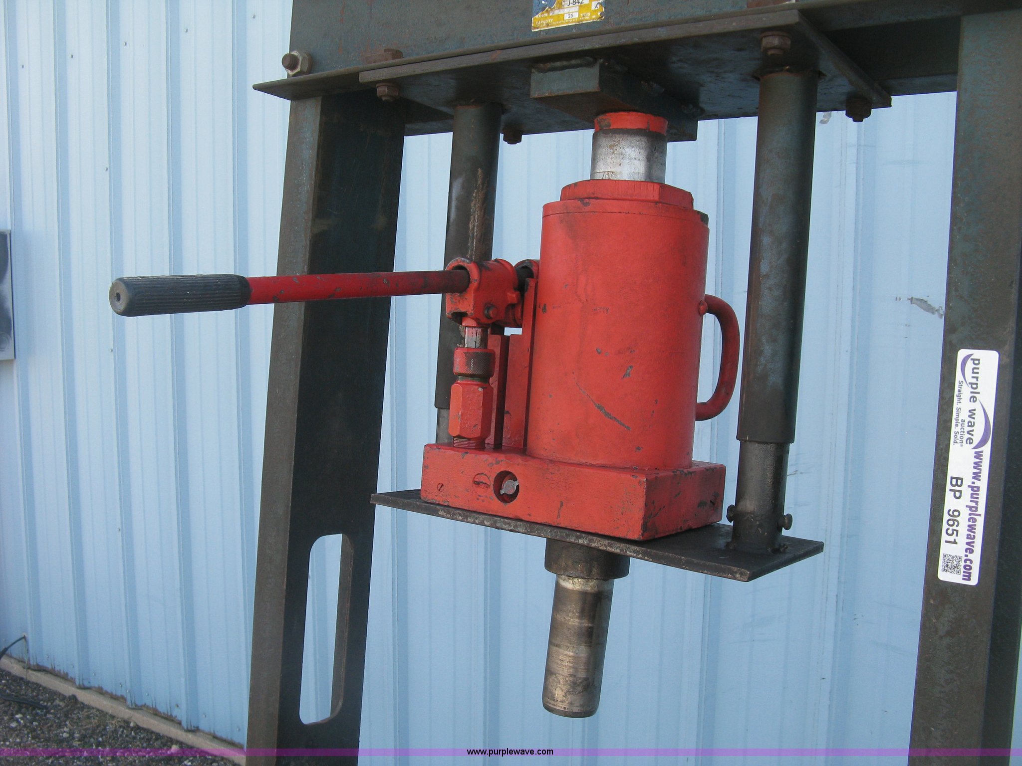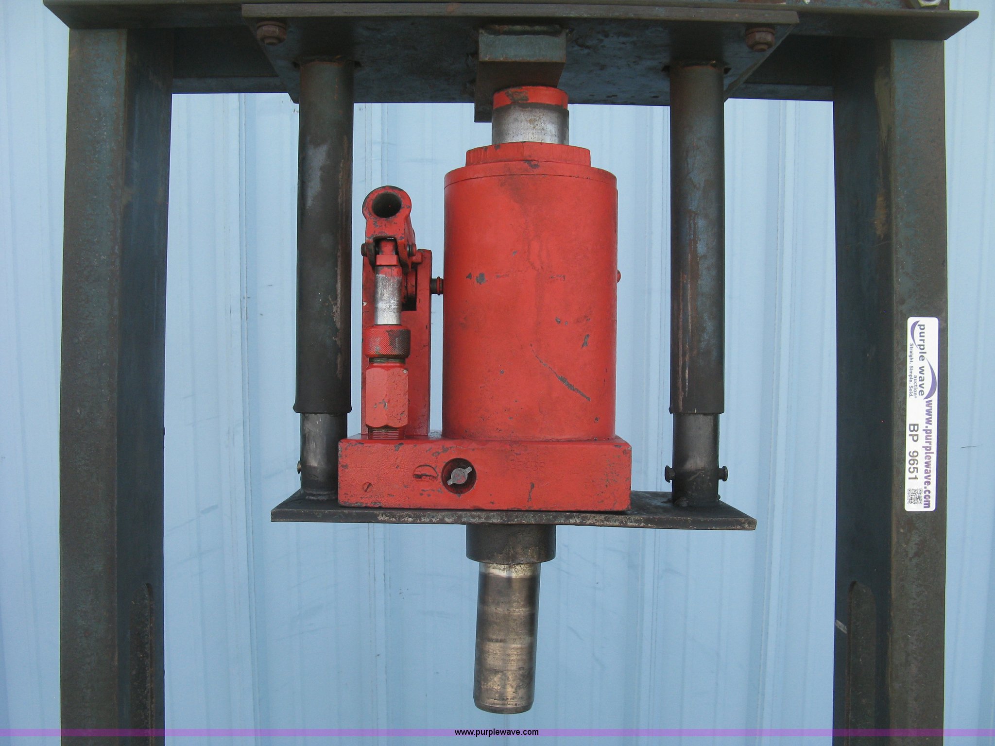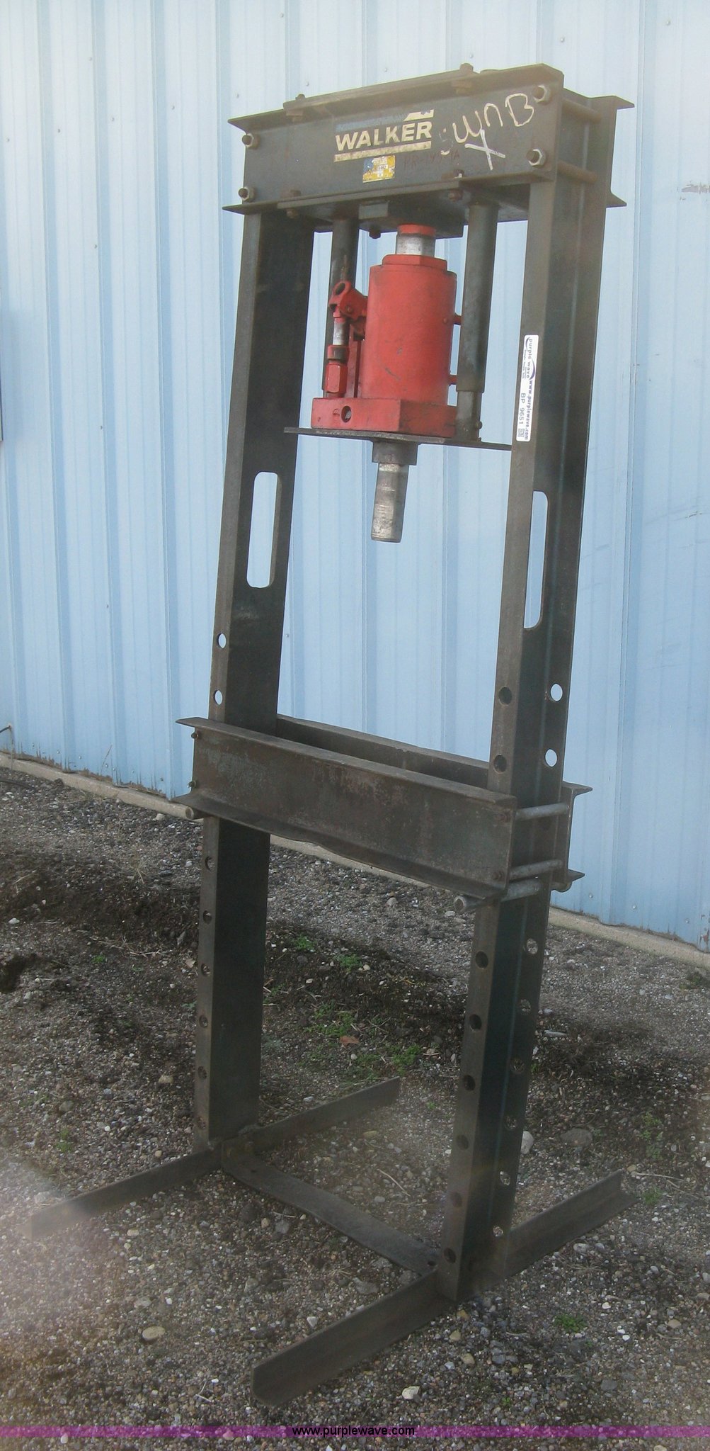 Purple Wave is selling a used Tools in Kansas. This item is a Walker J842 hydraulic press with the following: 25 ton capacity, Bottle jack press, Manual adjust platform, Lower press body slightly bent, Serial A