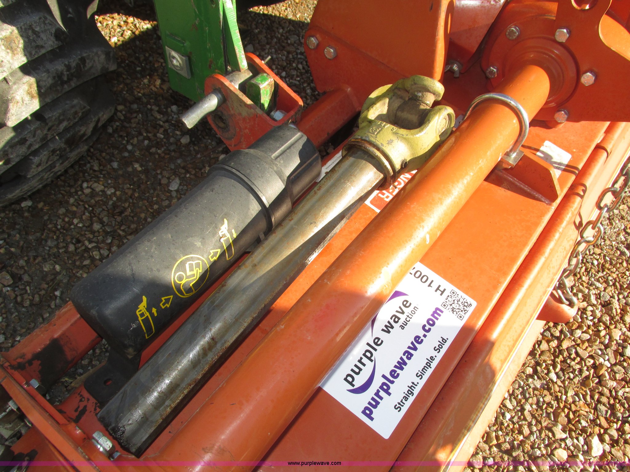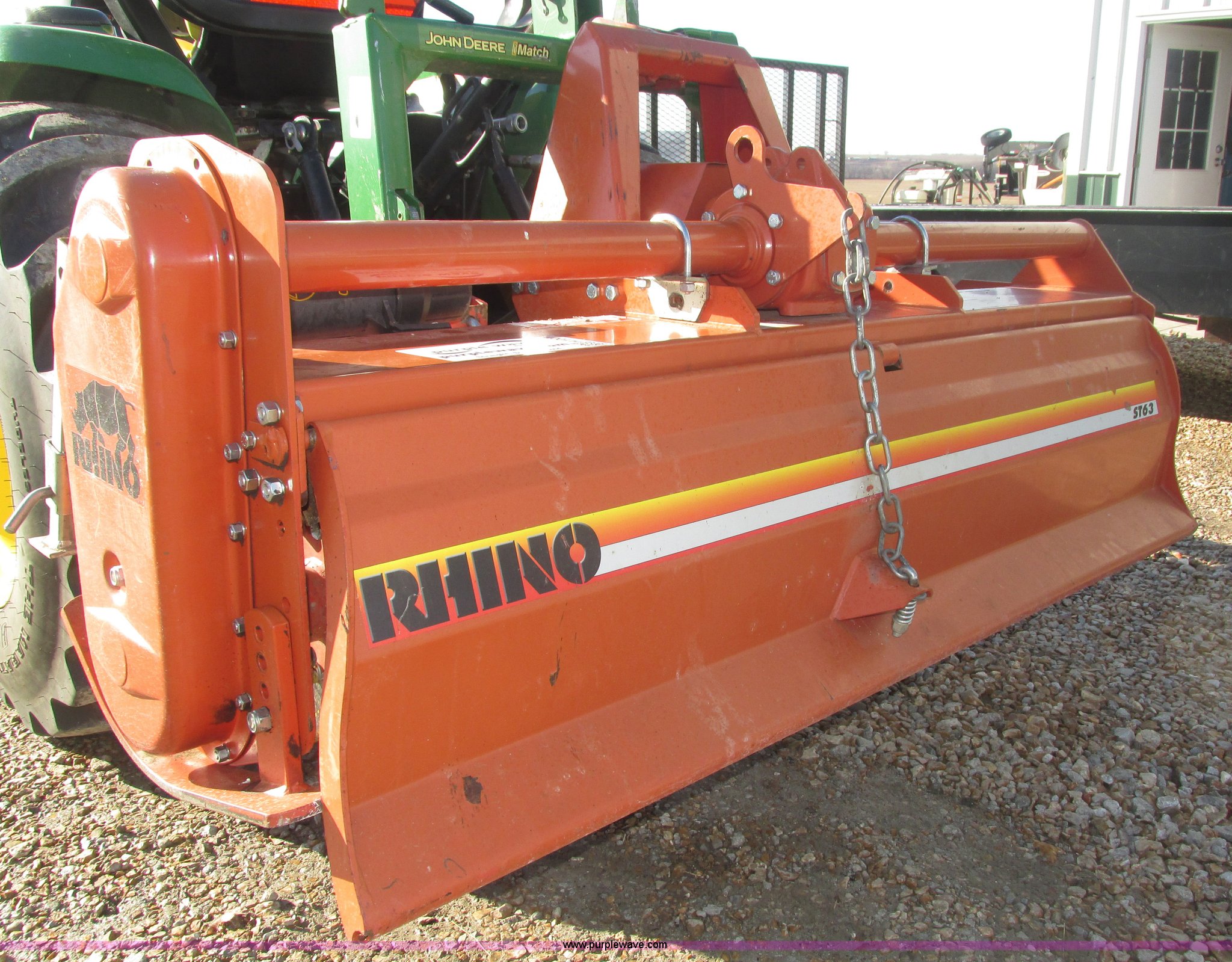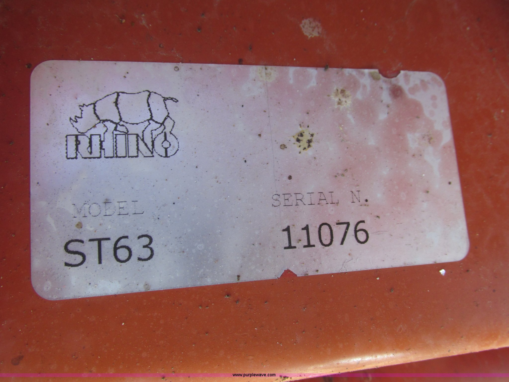 Purple Wave is selling a used Rotary Tillage in Nebraska. This item is a Rhino ST63 tiller with the following: 70"W O.D., 63"W till width, Adjustable skid plates, 9"W x 16" diameter cutters, Storage jack stand, Adjustable rear gate, Manual tube, 540 PTO, Three point, Tractor and quick attach not included, Serial 11076