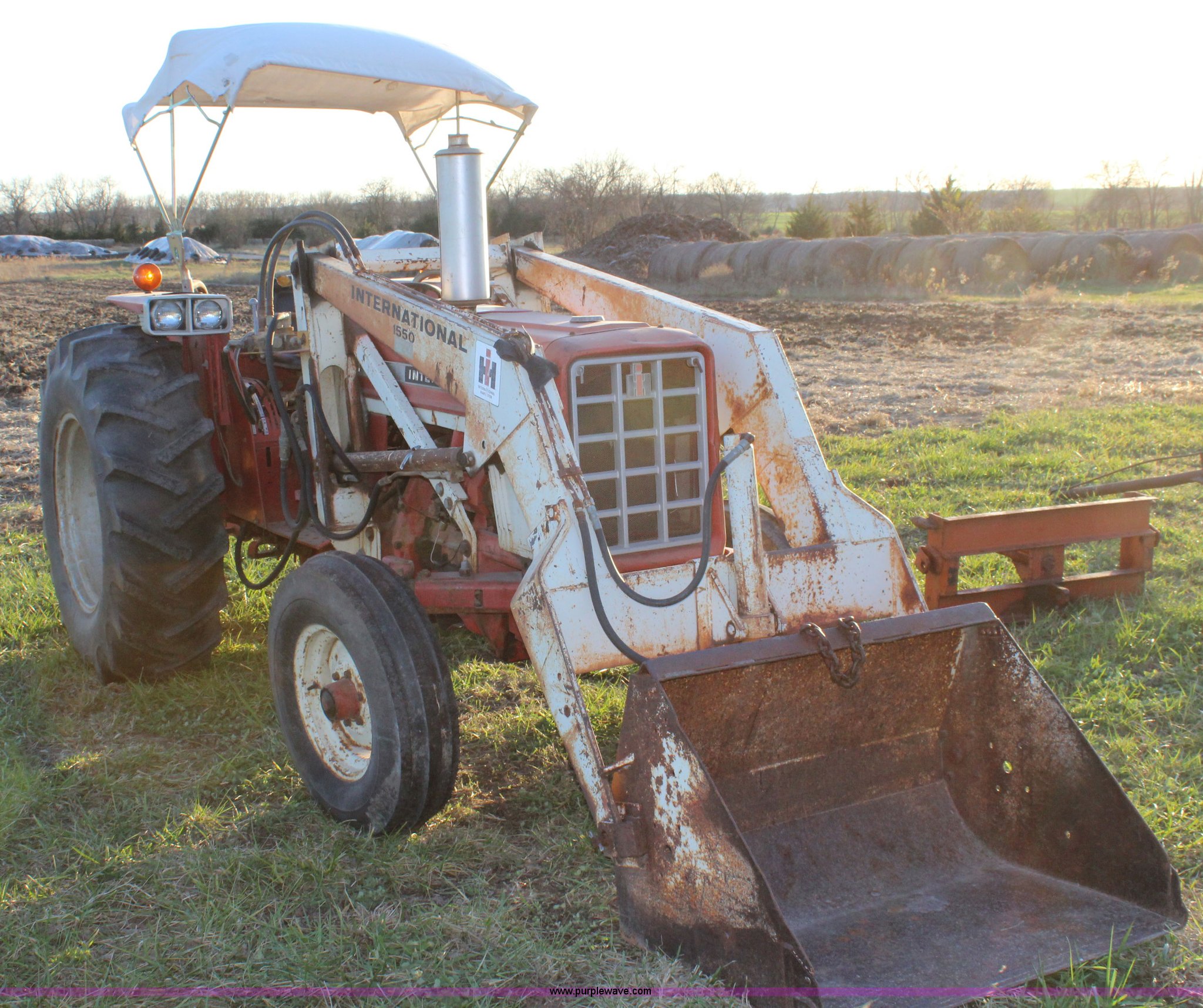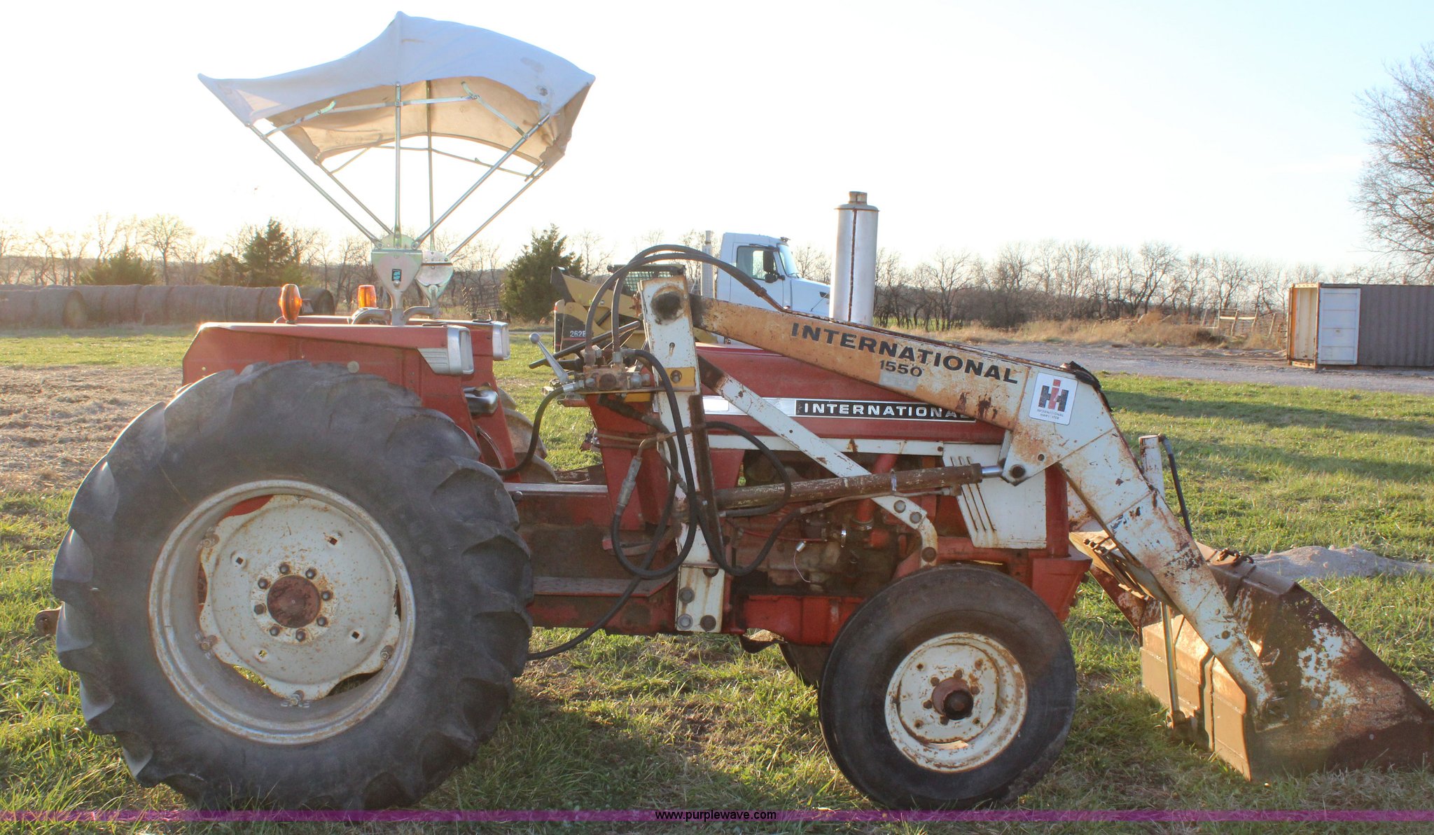 Purple Wave is selling a used Tractor in Kansas. This item is a 1971 International 574 tractor with the following: 3,319 hours on meter, International 3.3L four cylinder gas engine, 67 HP, Manual transmission, 8F-4R gears, Canopy, International 1550 loader, 40"W bucket, Two lever controls, Three point, 540 PTO, Rear hydraulic remote set, 7.50-16 front tires, 16.9-28 rear tires, Serial 2310013U02220