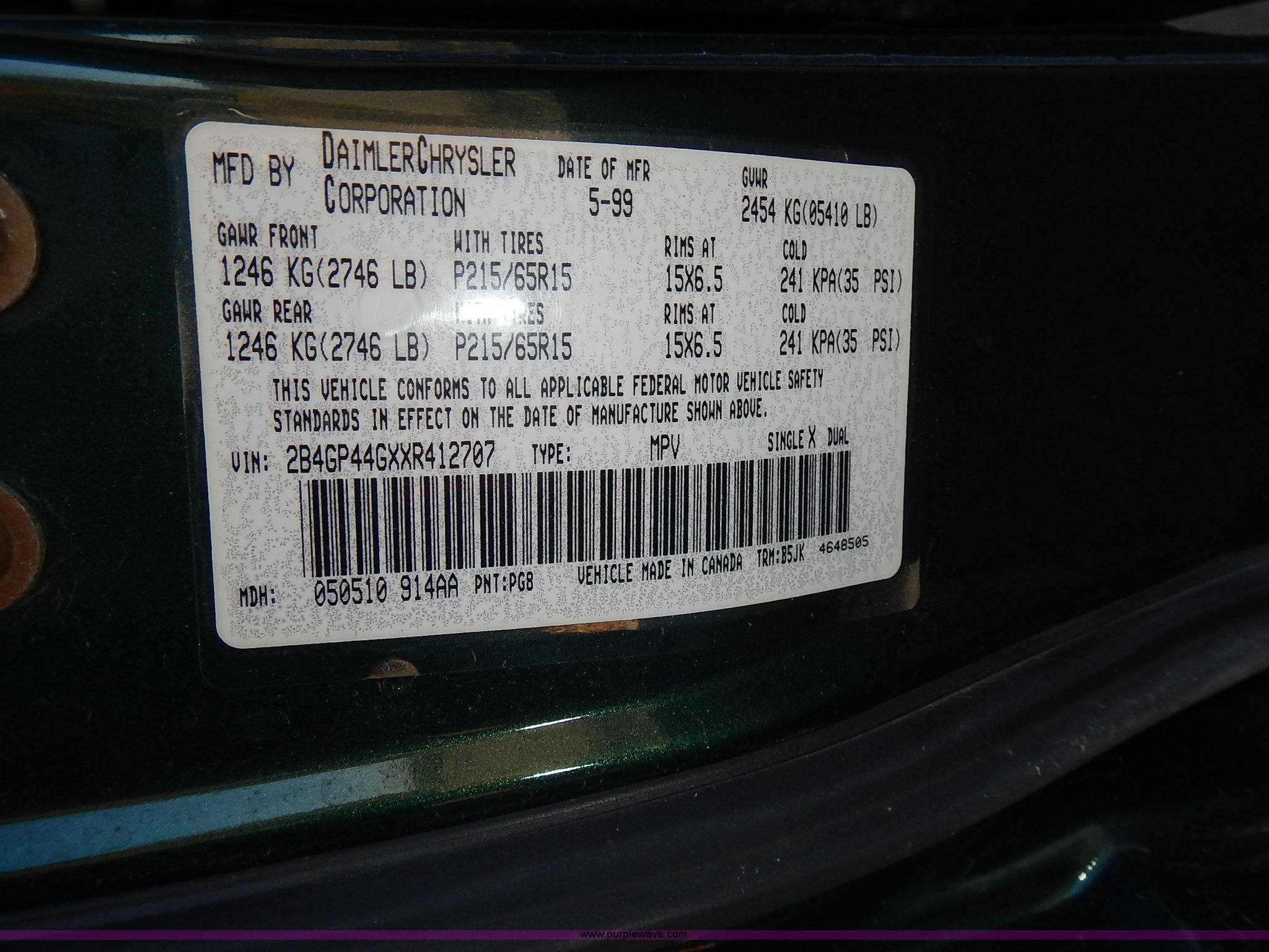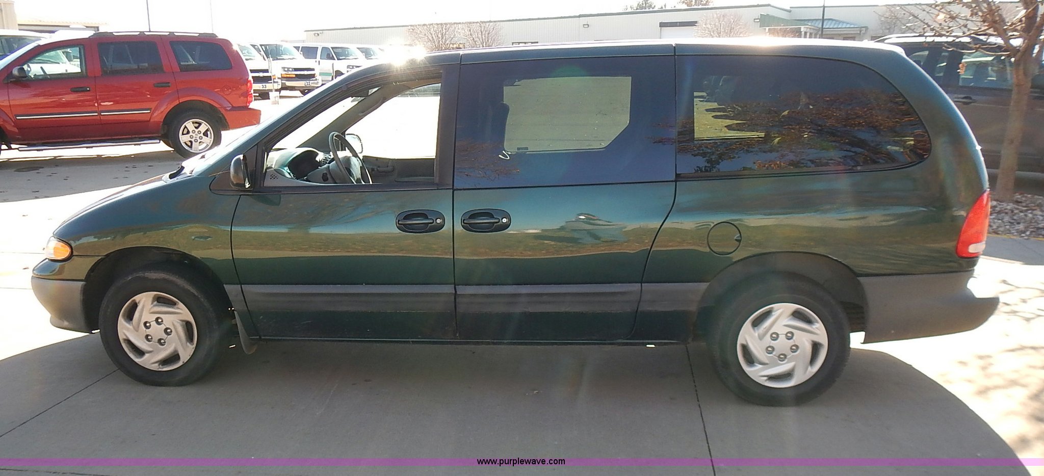 Purple Wave is selling a used 1/2 Ton Pickup or Van in Kansas. This item is a 1999 Dodge Grand Caravan van with the following: 114,294 miles on odometer, 3.3L V6 OHV 12V FFV gas engine, Automatic transmission, AC and heat, Tilt, Cruise, AM/FM/cassette, Power windows, locks, and mirrors, Temperature/directional display, Cloth interior, 225/65R15 tires, Dents, Scratches, Glove box not attached, present