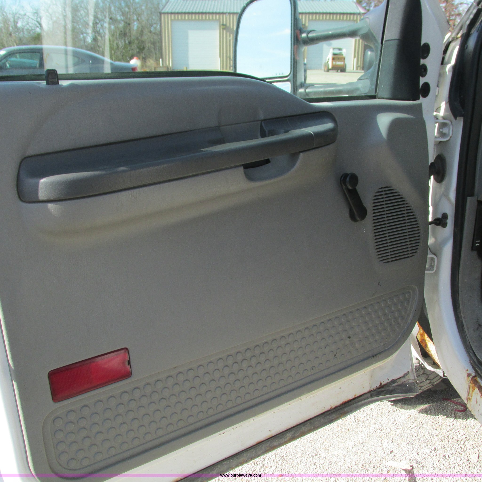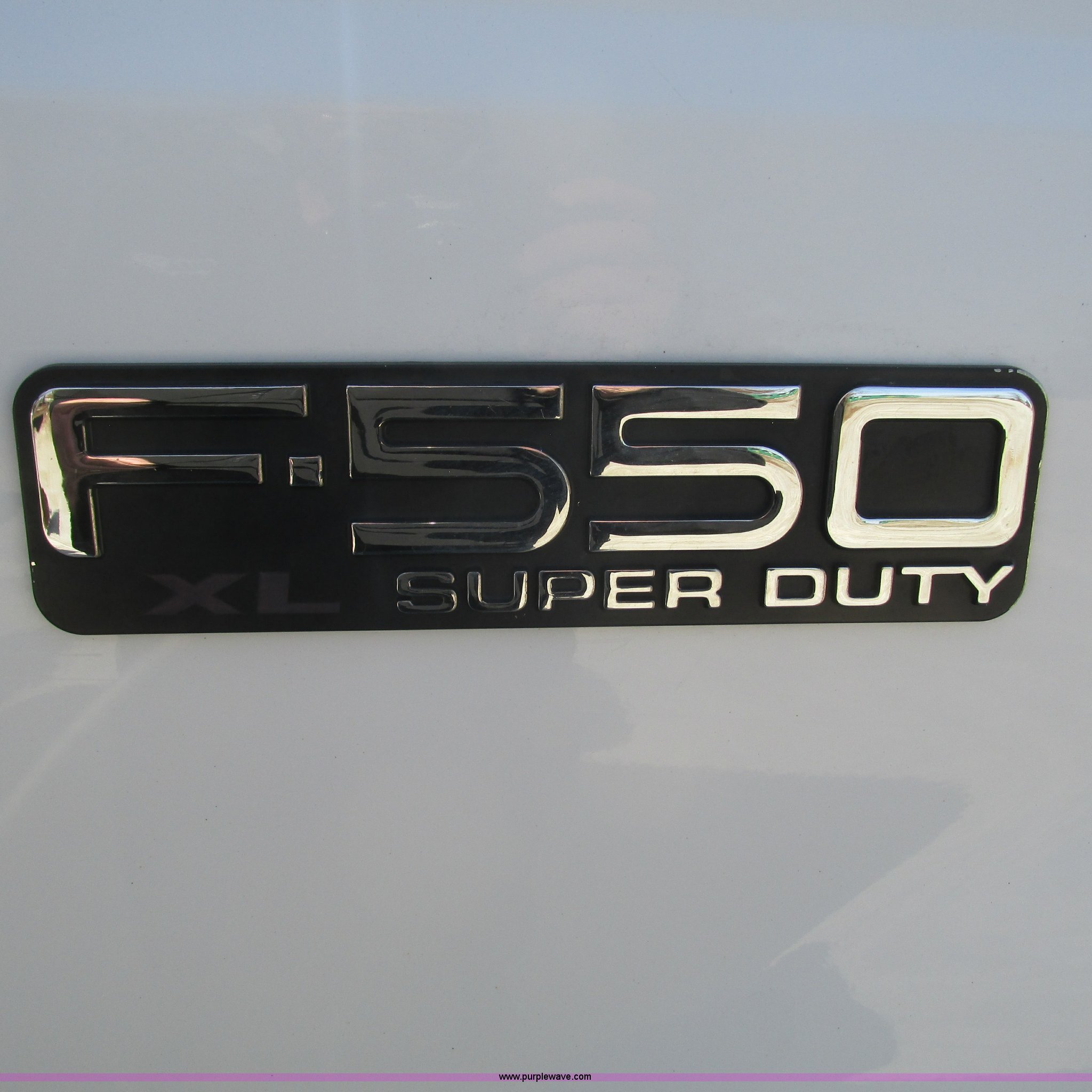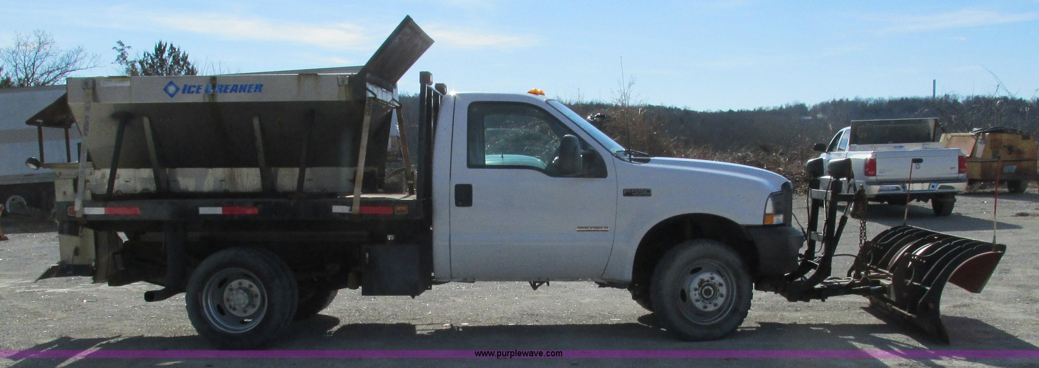 Purple Wave is selling a used Flat Bed Truck in Missouri. This item is a 2003 Ford F550 dump flatbed truck with the following: 67,302 miles on odometer, 6.0L V8 OHV 32V turbo diesel engine, Six speed manual transmission, Four wheel drive, AC and heat, Cruise, AM/FM, Manual windows and locks, Cloth interior, Front tow hooks, Block heater, PTO, Wet kit, Knapheide PVNXS-930 dump flatbed, 9'L x 8'W, Headache rack, Steel deck, Under-mount toolbox, Latch inoperable, Serial 913697-2003, Western Ice Breaker stainless steel spreader, Hydraulic drive, Snow plow, Poly blade, Steel bolt-on cutting edge, Hydraulic lift and angle, Work lights, Spring suspension, 225/70R19.5 tires, Interior/exterior cosmetic damage, Rust