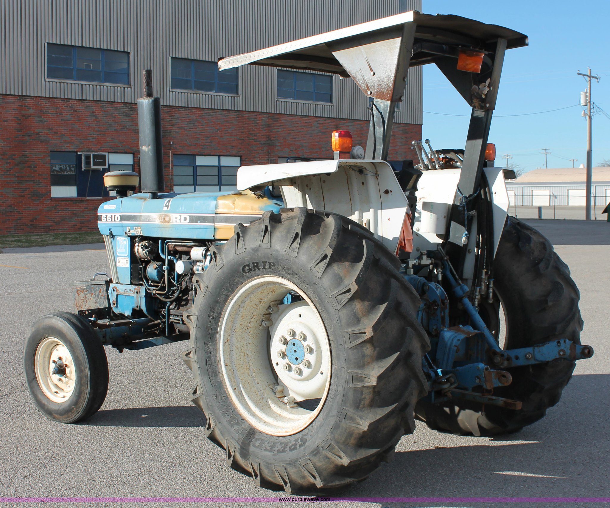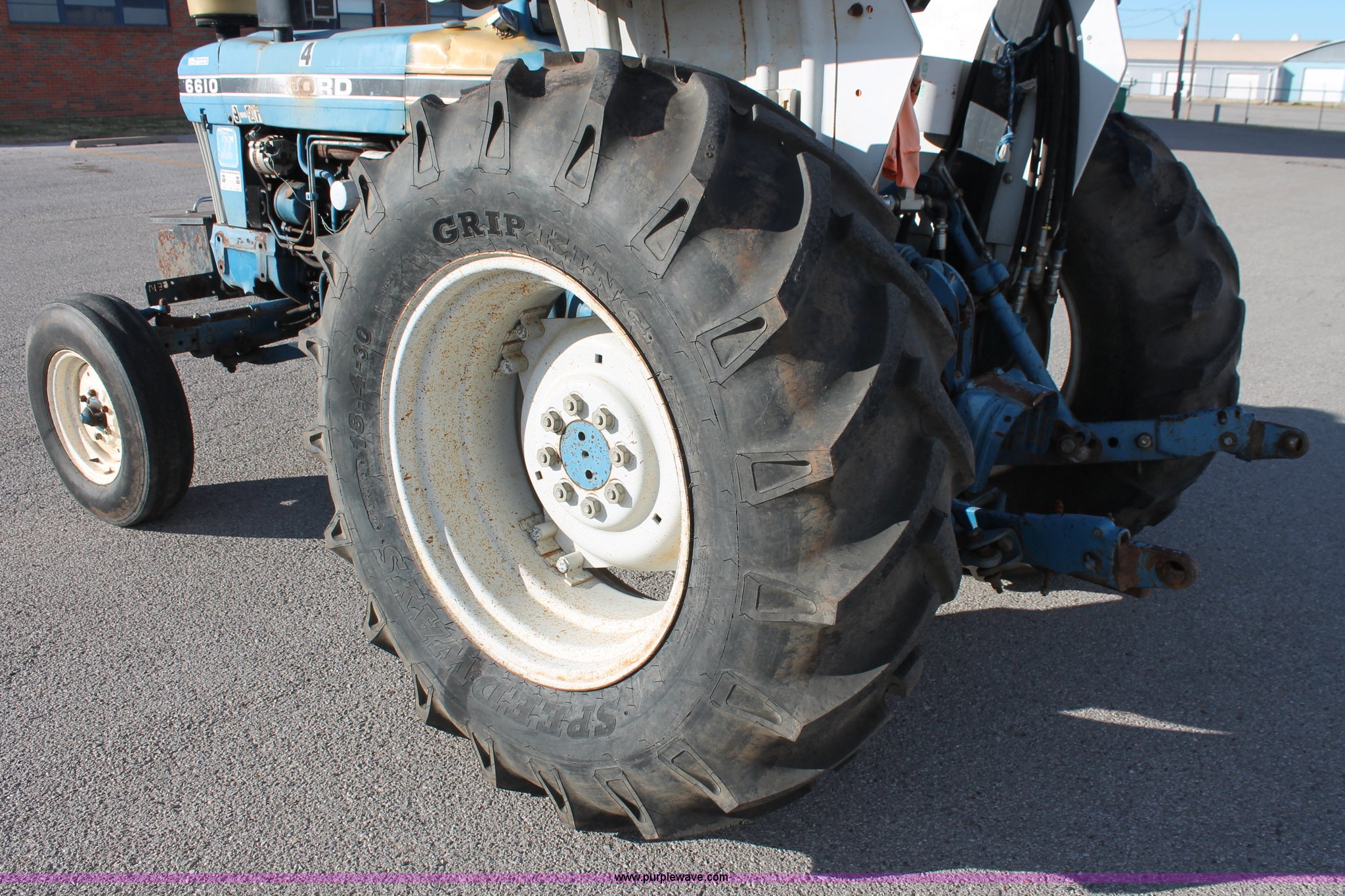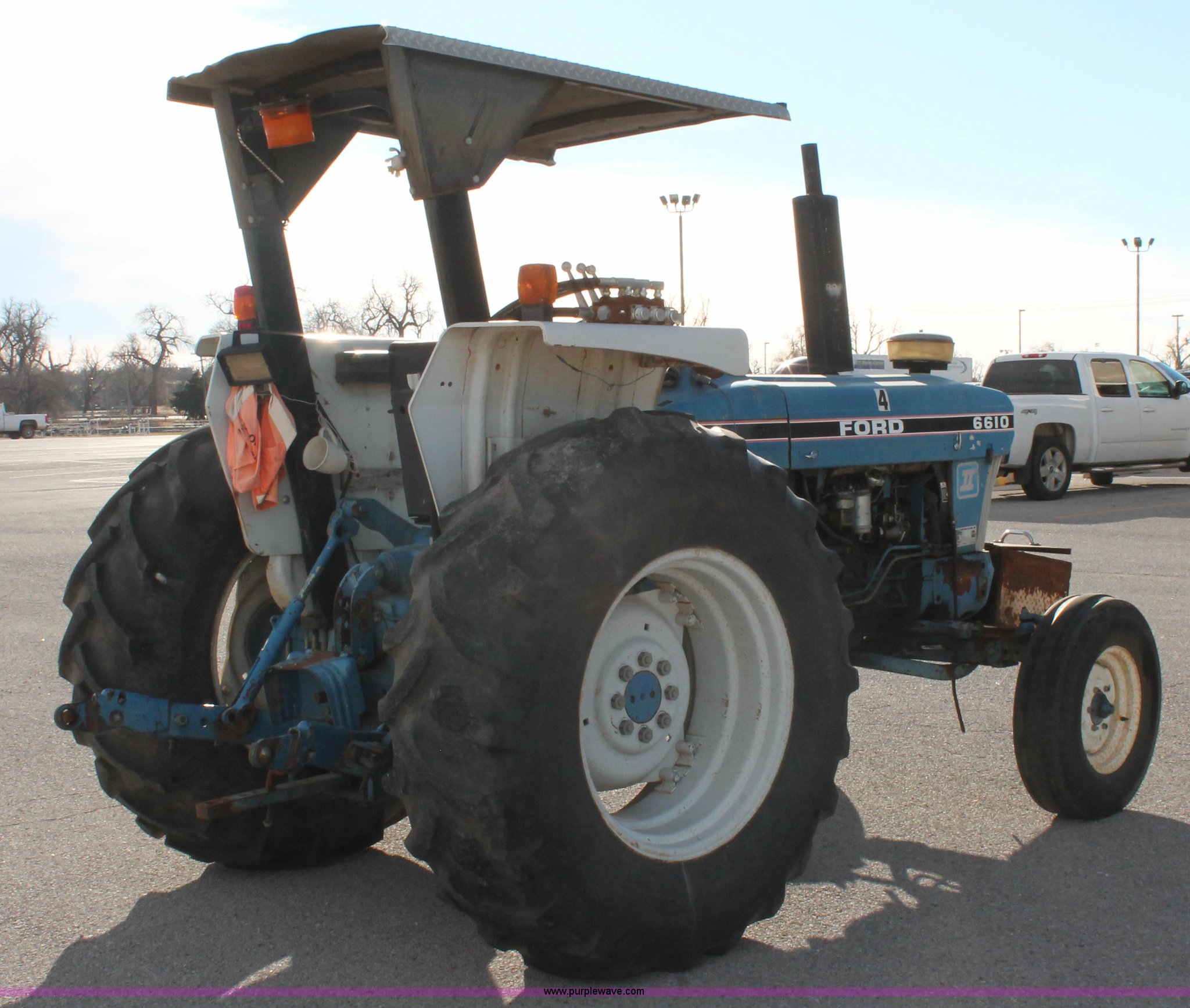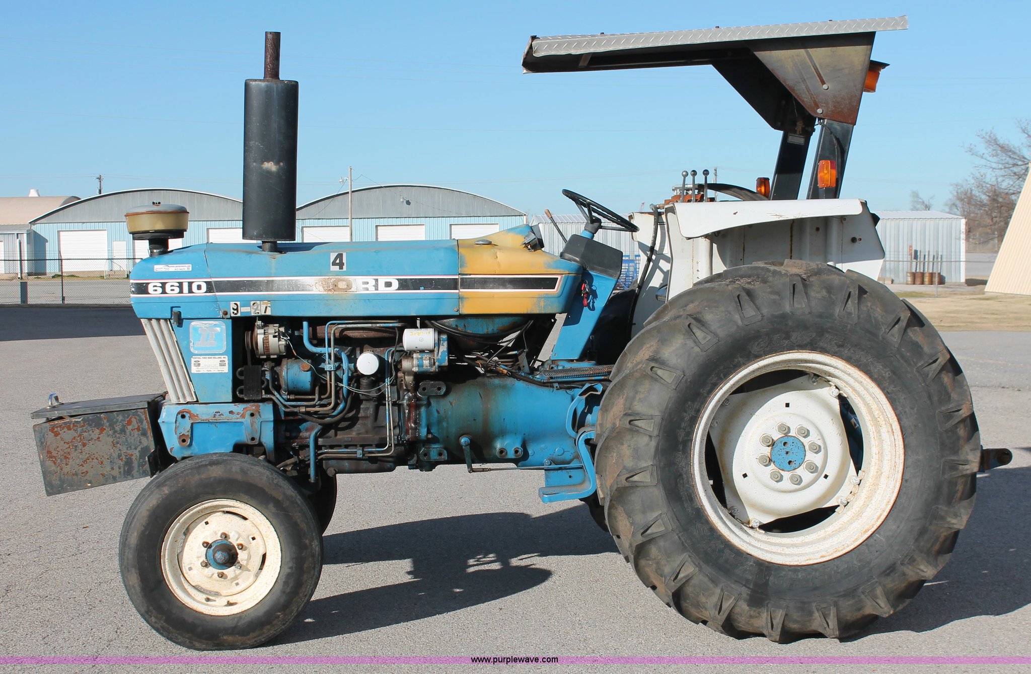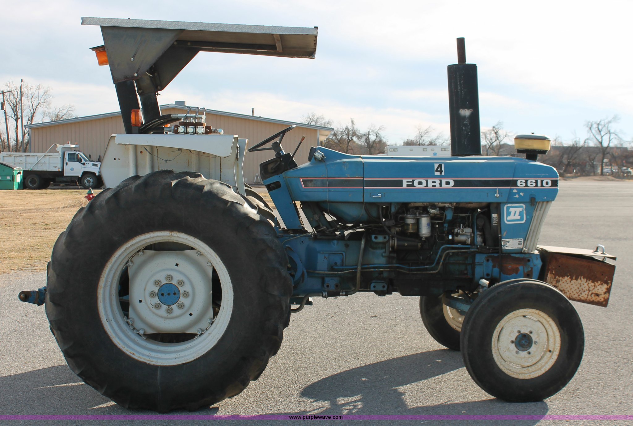 Purple Wave is selling a used Tractor in Oklahoma. This item is a 1990 Ford 6610 Series II tractor with the following: 4,177 hours on meter, Ford 4.4L four cylinder diesel engine, Dual-Range Synchromesh transmission, 8F-4R gears, OROPS canopy, Serial 18-025, Suspension seat, Front tool/weight box, Three point, 540 PTO, Draw bar, (3) rear hydraulic remote sets, 88" wheelbase, 7.50-16 front tires, 18.4-30 rear tires, Serial BC73016